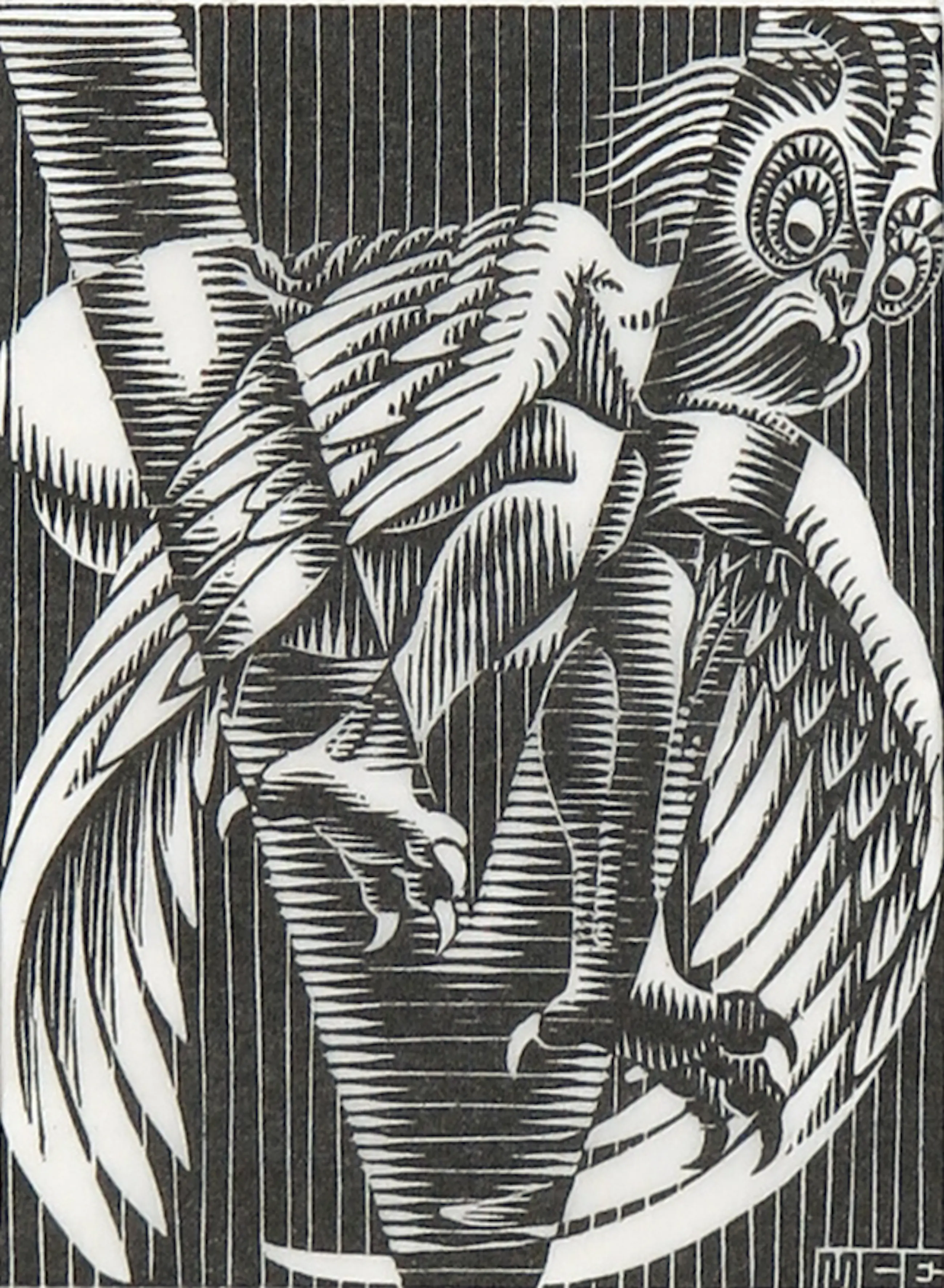 Houtdruk ontworpen voor het boek De vreeselijke avonturen van Scholastica uit 1932.