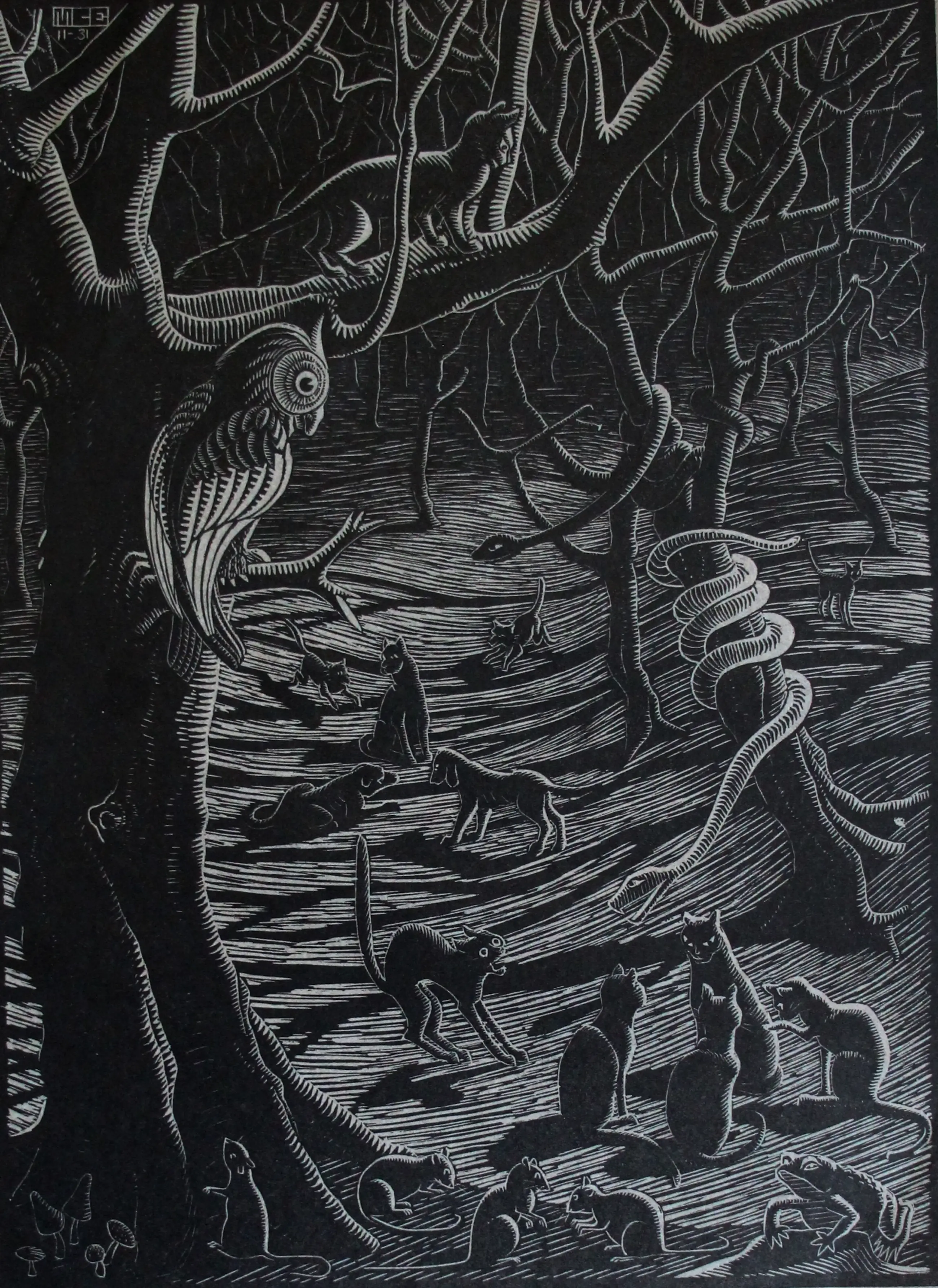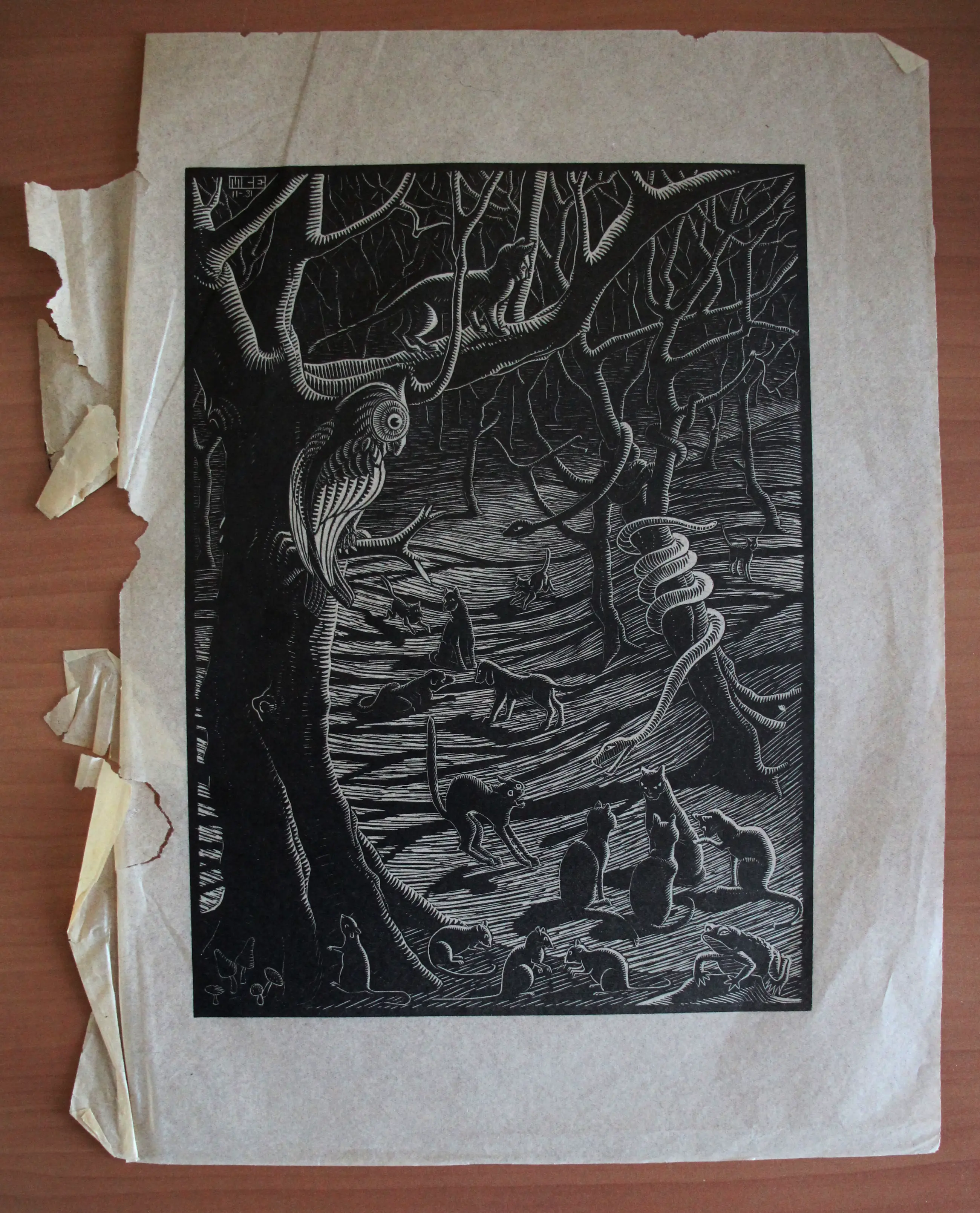 Mooie houtsnede van Escher. Titel: Scholastica. Jaar: 1931. Ik heb geen idee of dit een oorspronkelijk houtsnede is of een latere uitgave. Afmeting voorstelling: H23 x b17 cm. Het werk is linksboven in het blok gesigneerd.