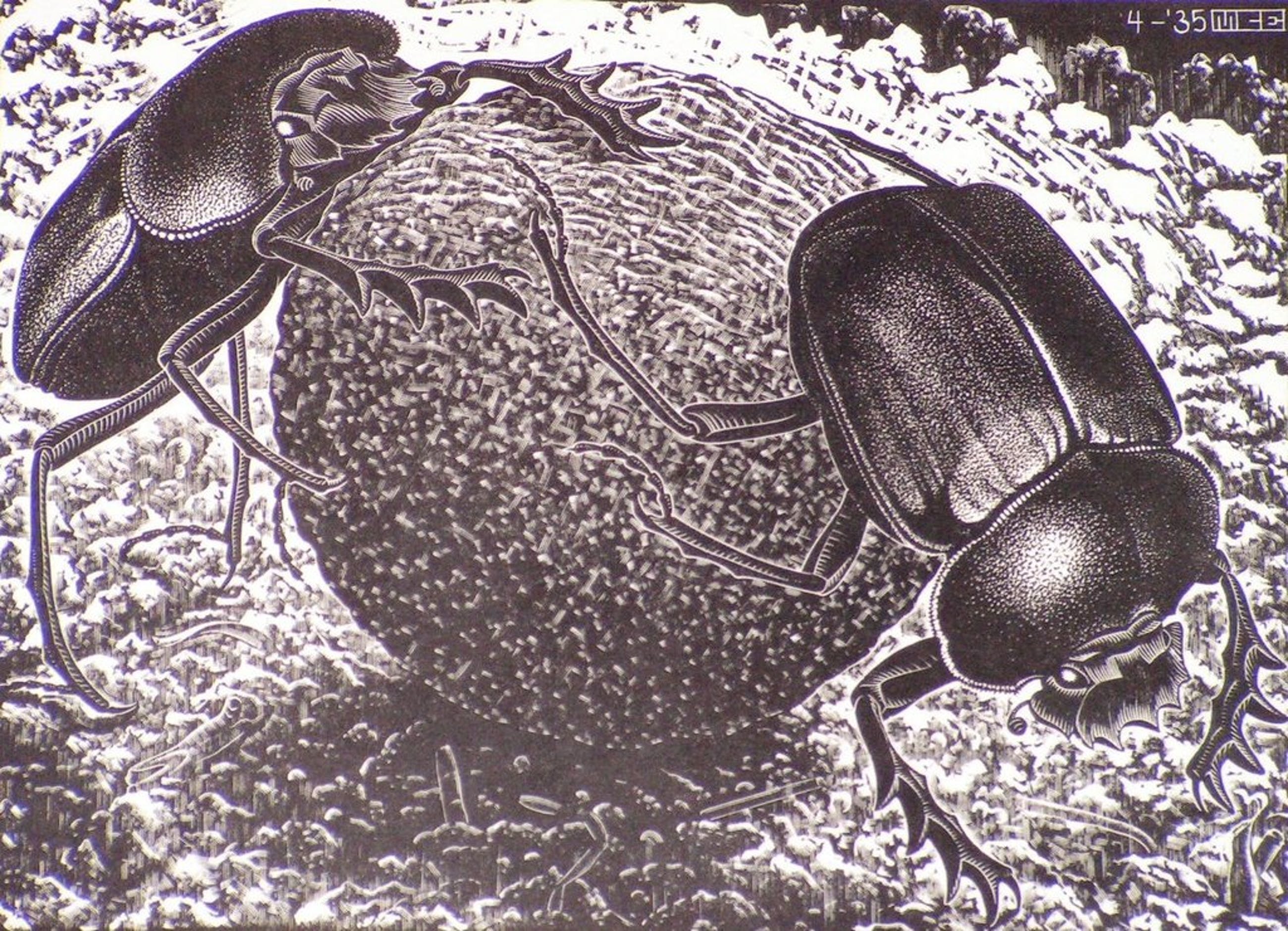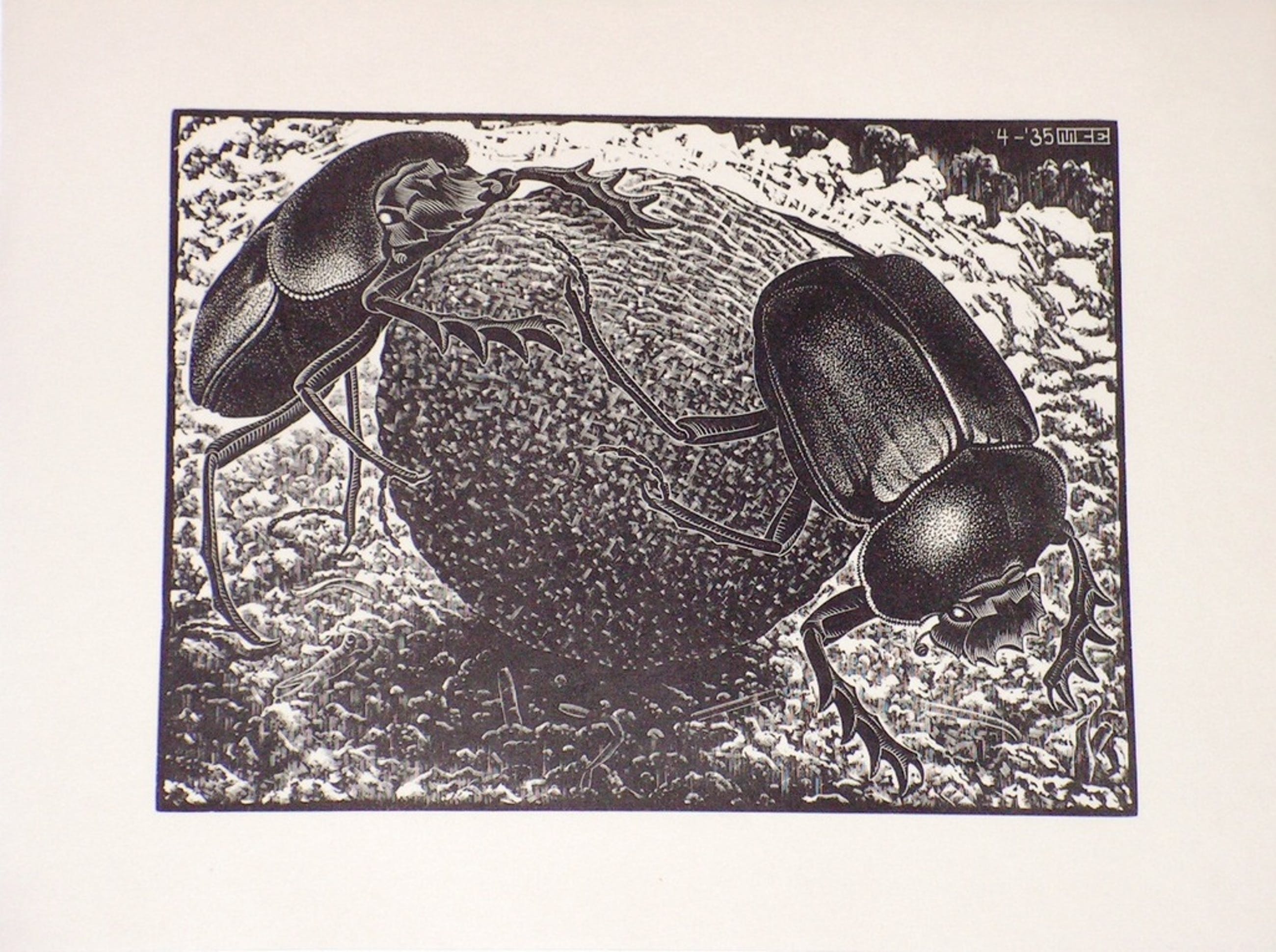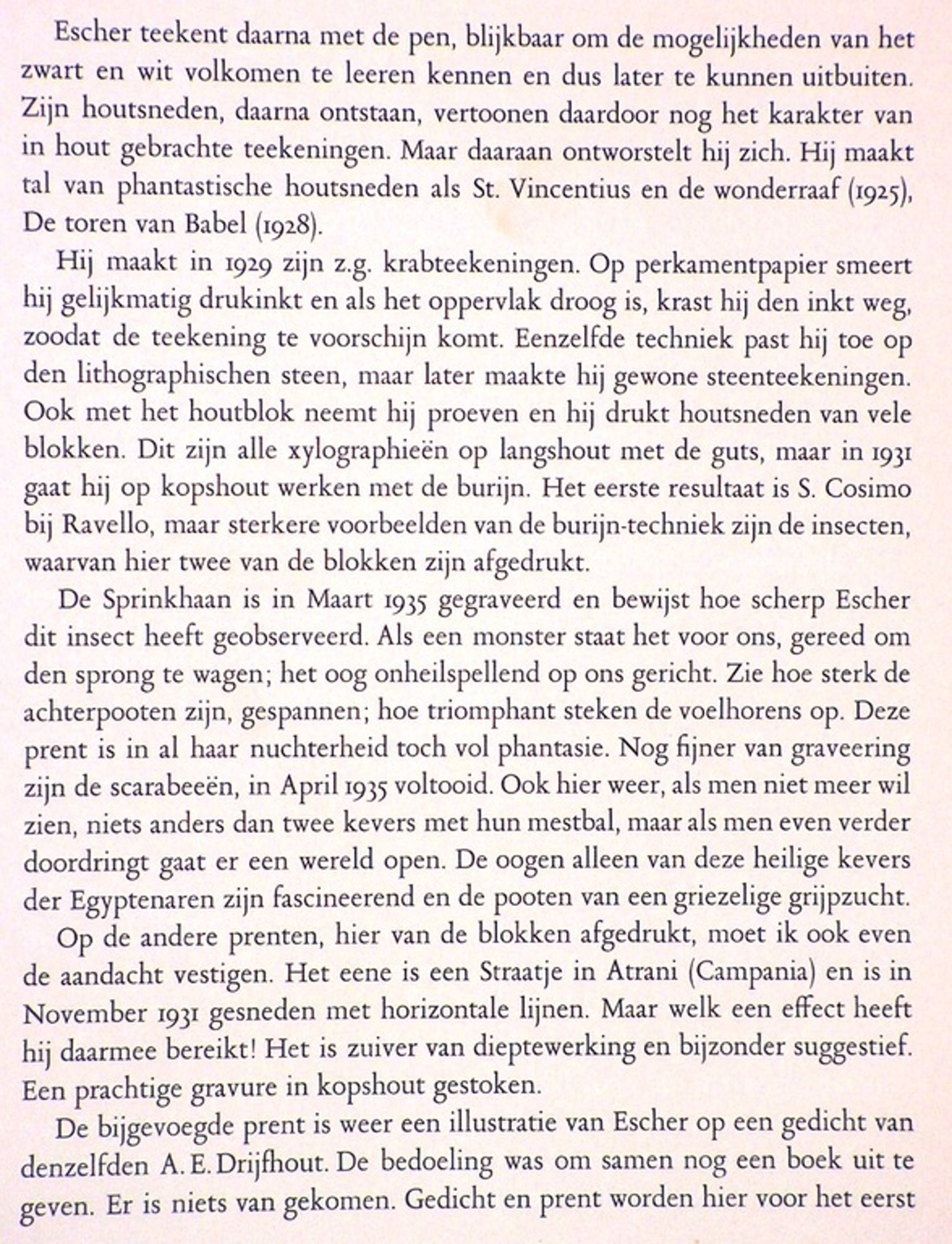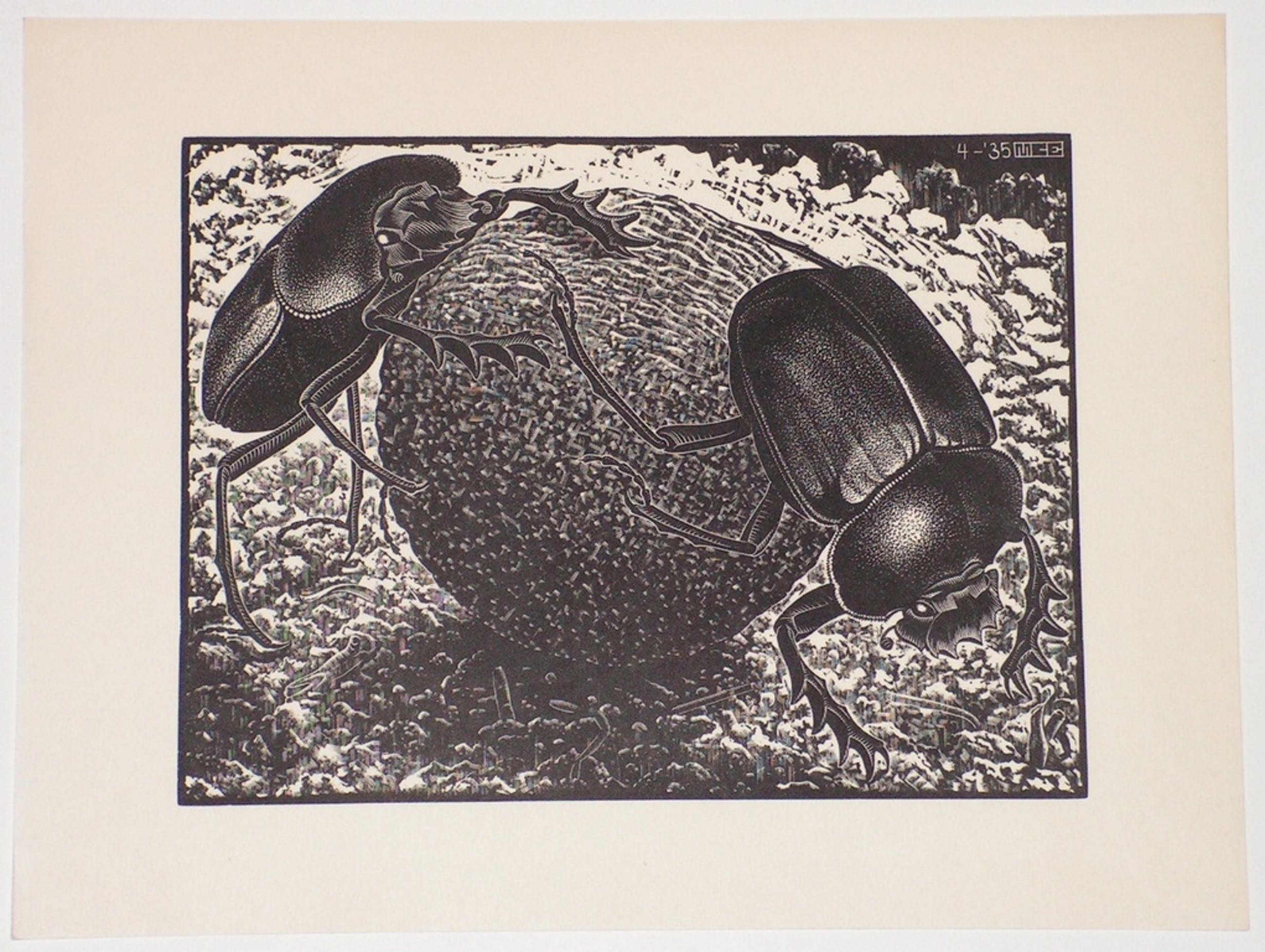 Prachtige grote houtgravure van Escher uit april 1935. In werkelijk uitzonderlijk goede staat. Gedrukt in 1940, speciaal voor Halcyon. Rechtsboven gemonogrammeerd en gedateerd '35 in het blok.