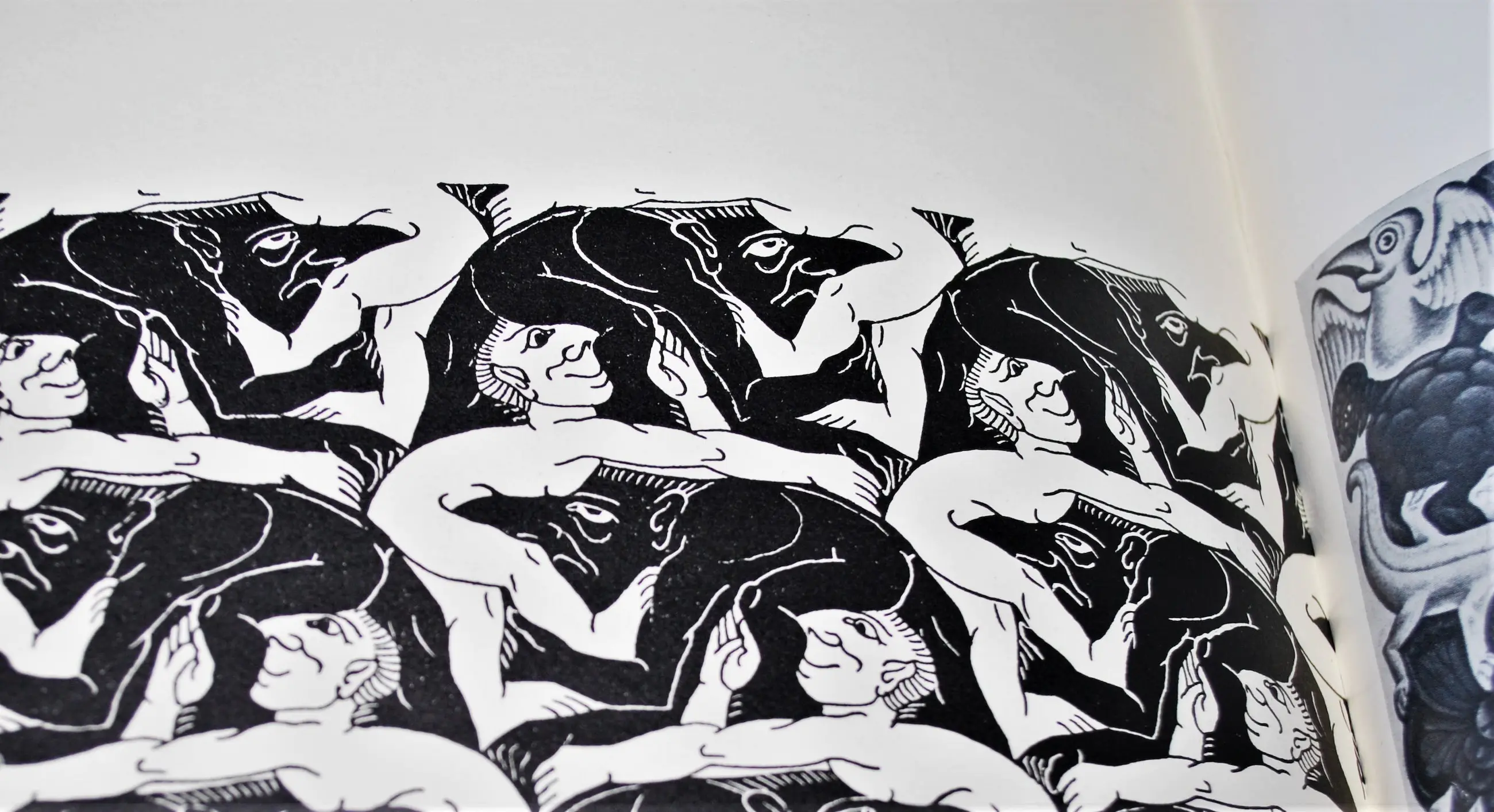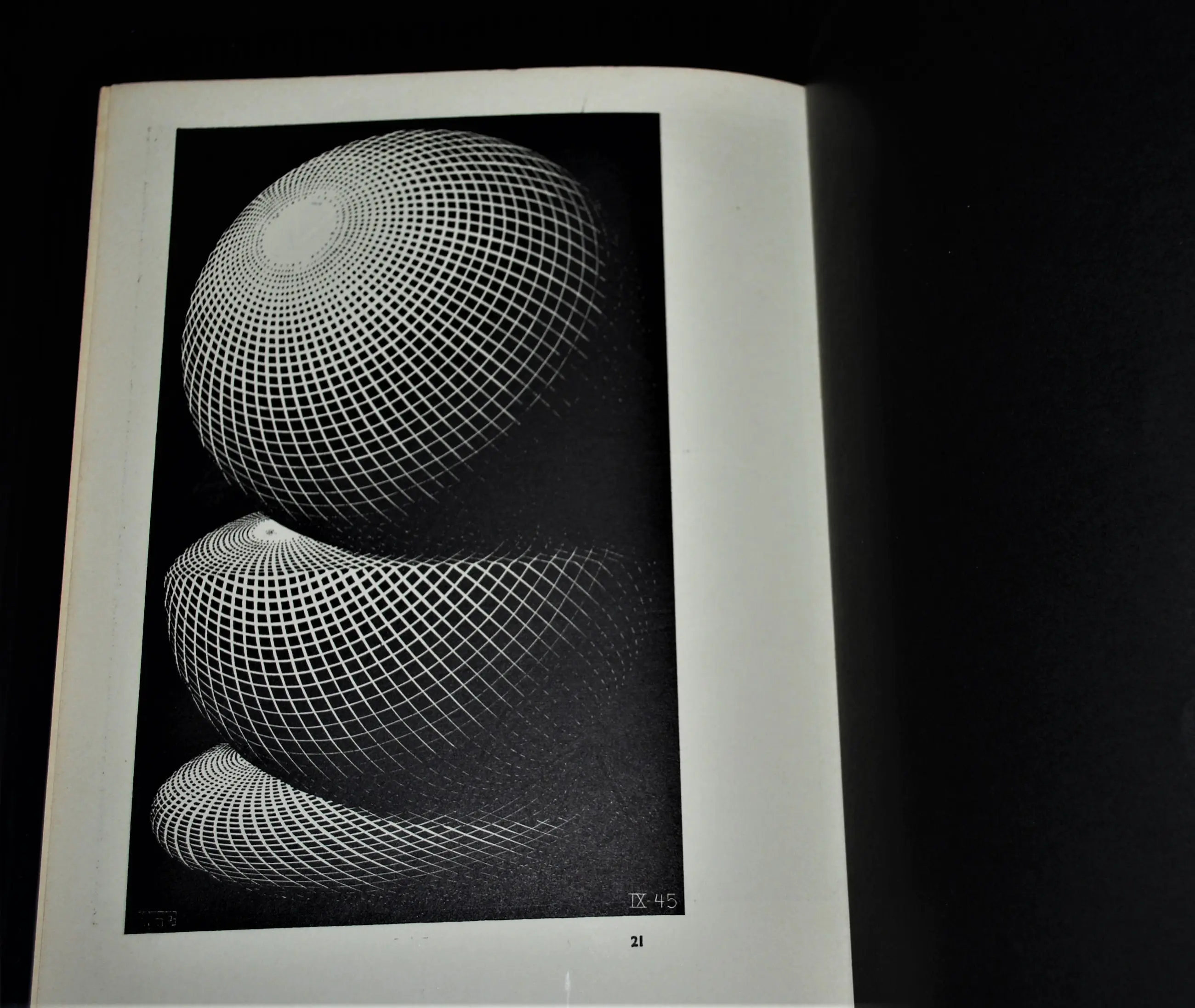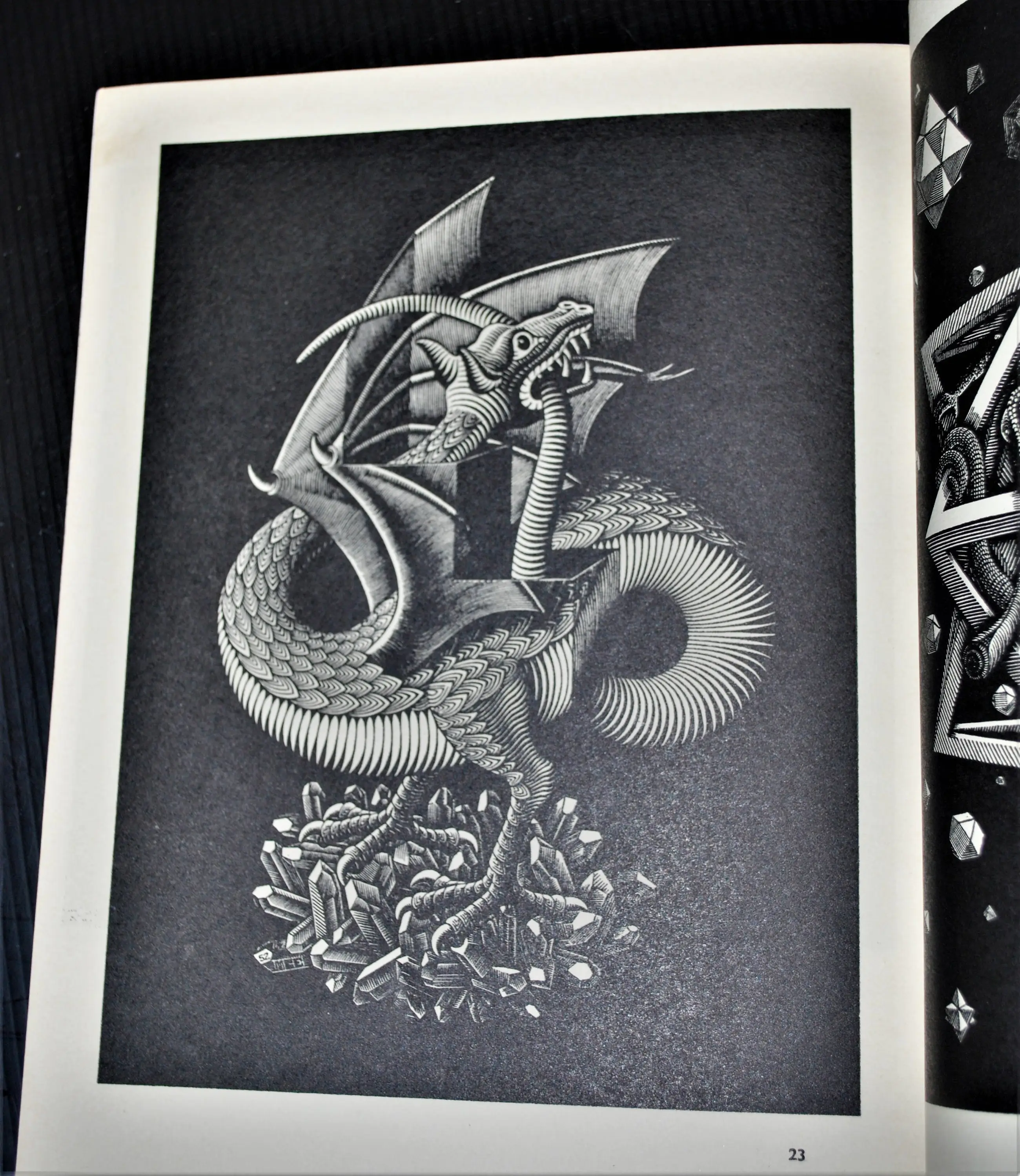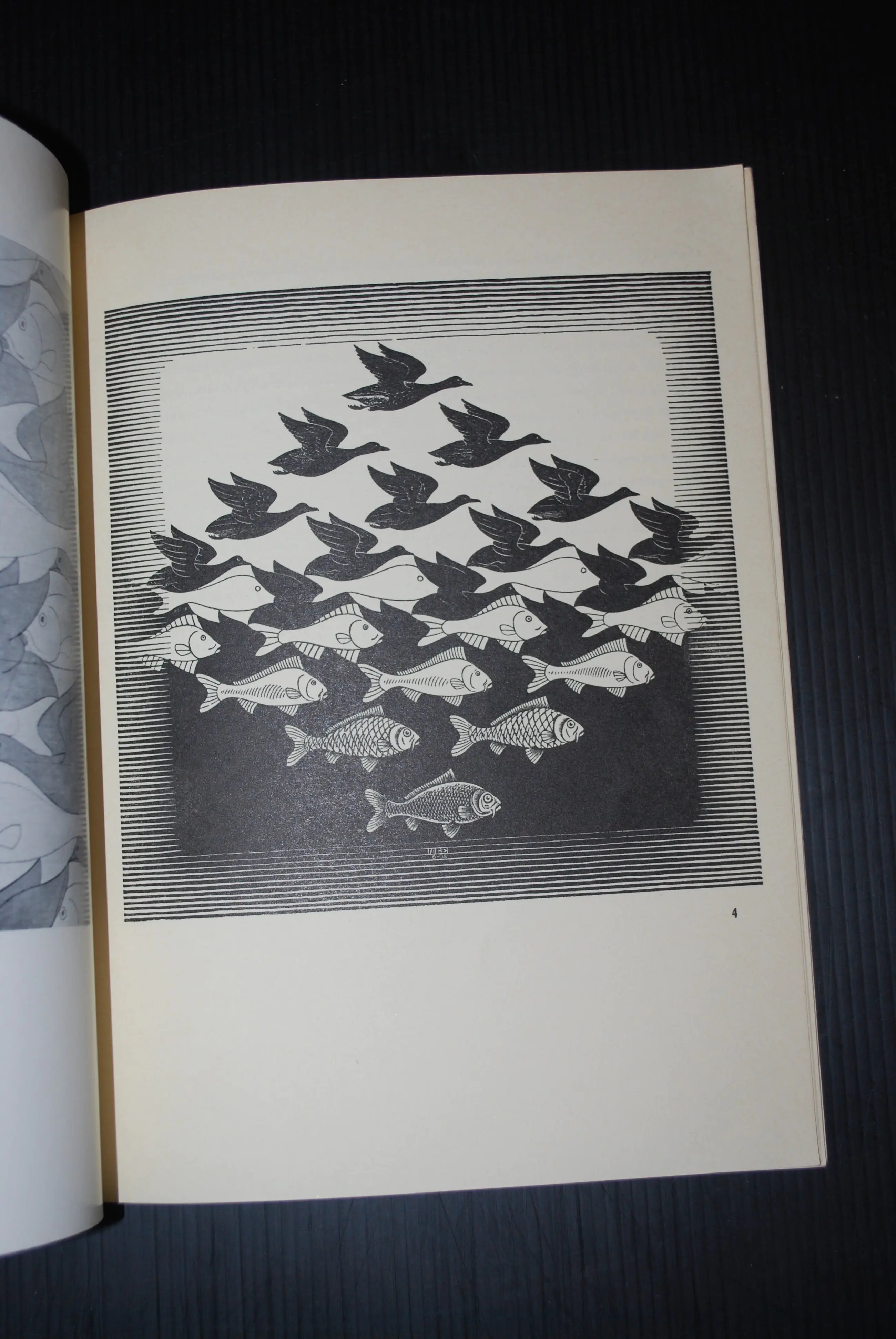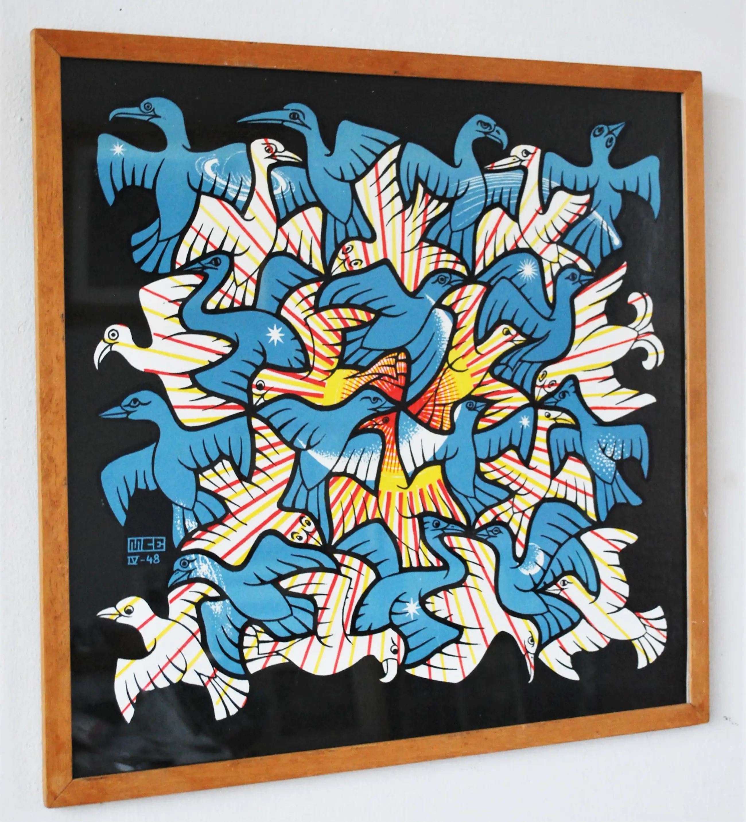 Daarbij de print (zonder raster) van de houtsnede 'Zon en Maan', uitgave Escherstichting 1970. Bevestigd op karton. In goede gebruikte staat/ingelijst achter glas, buitenmaat 43x44 cm.