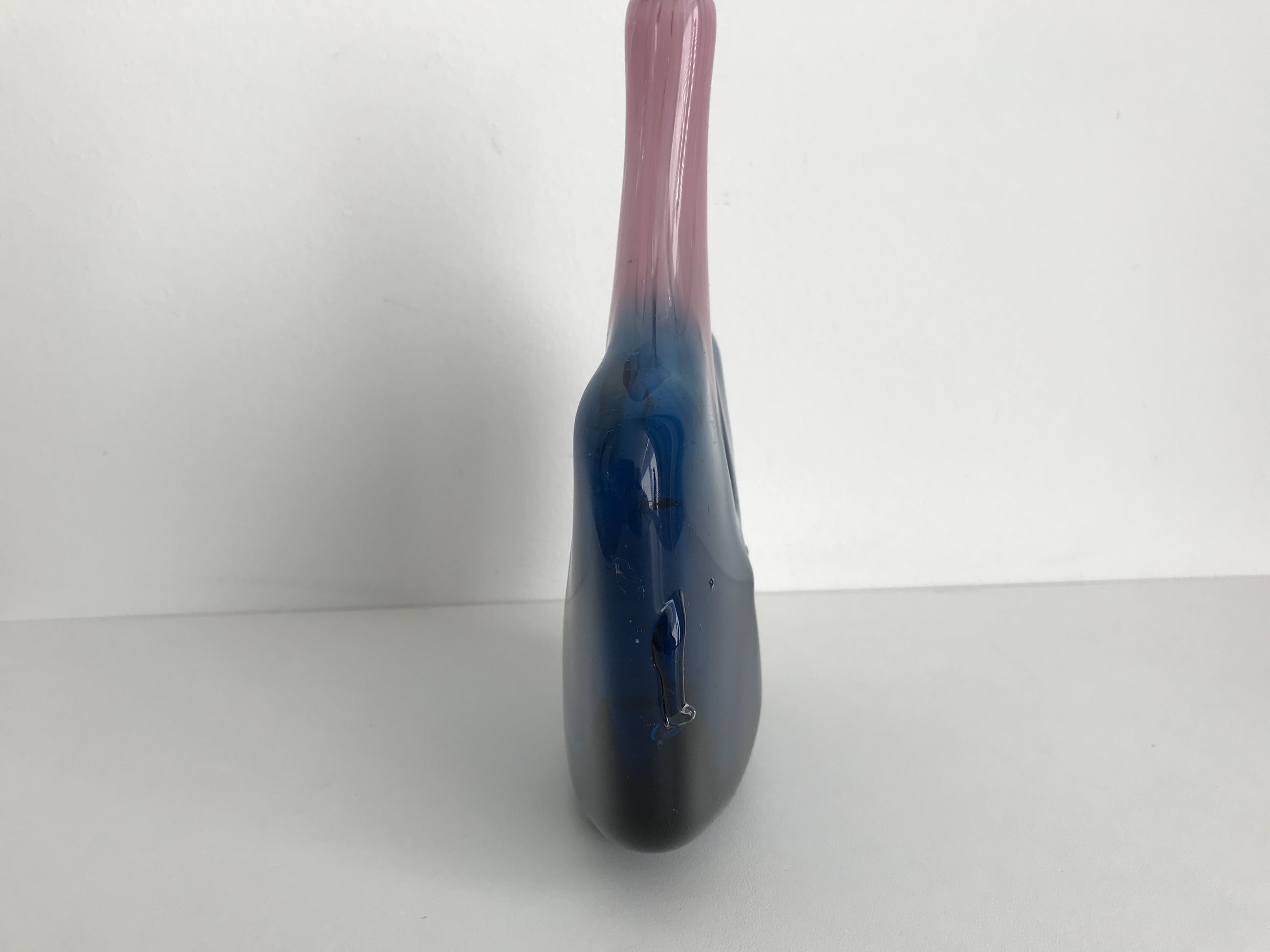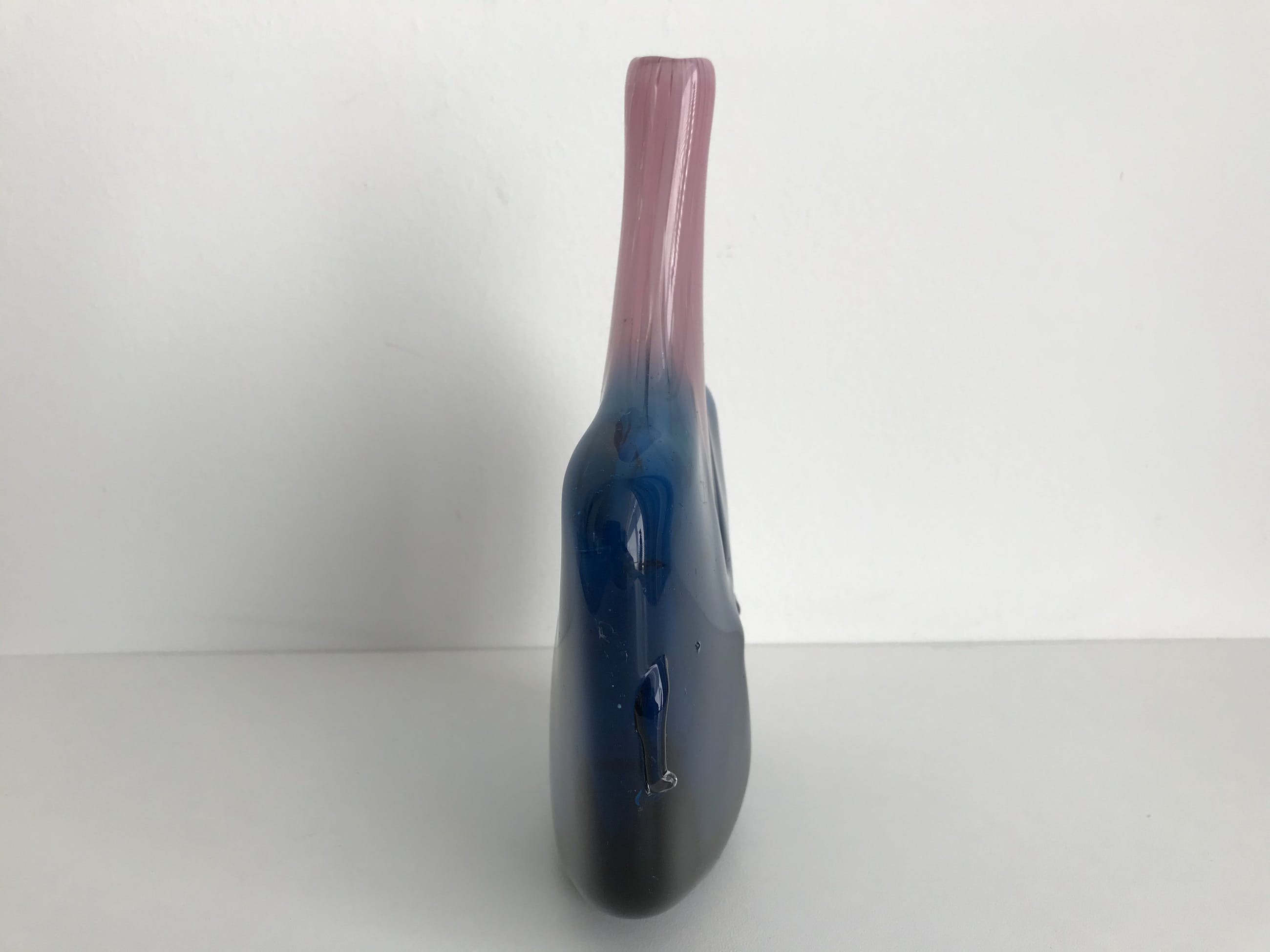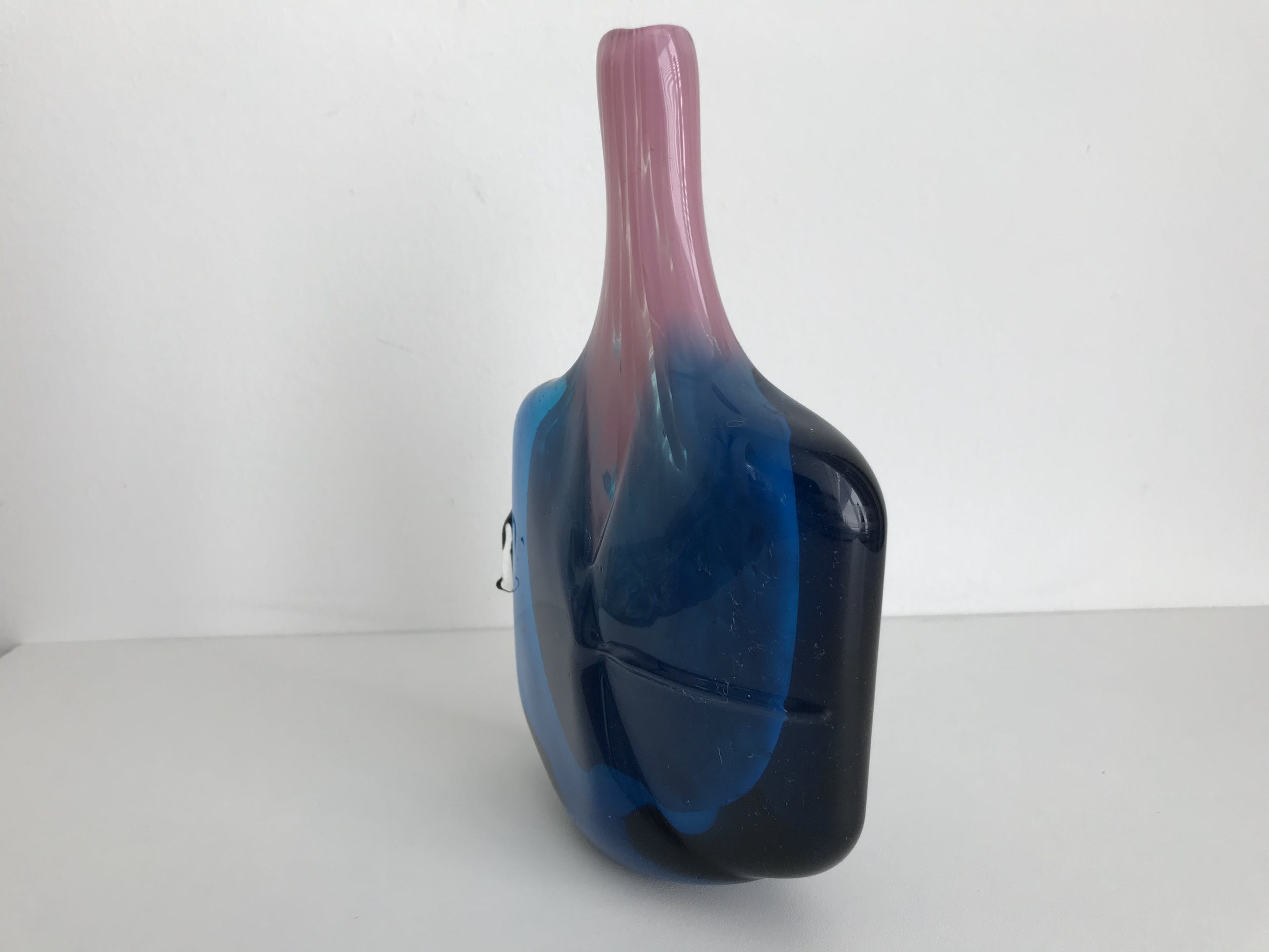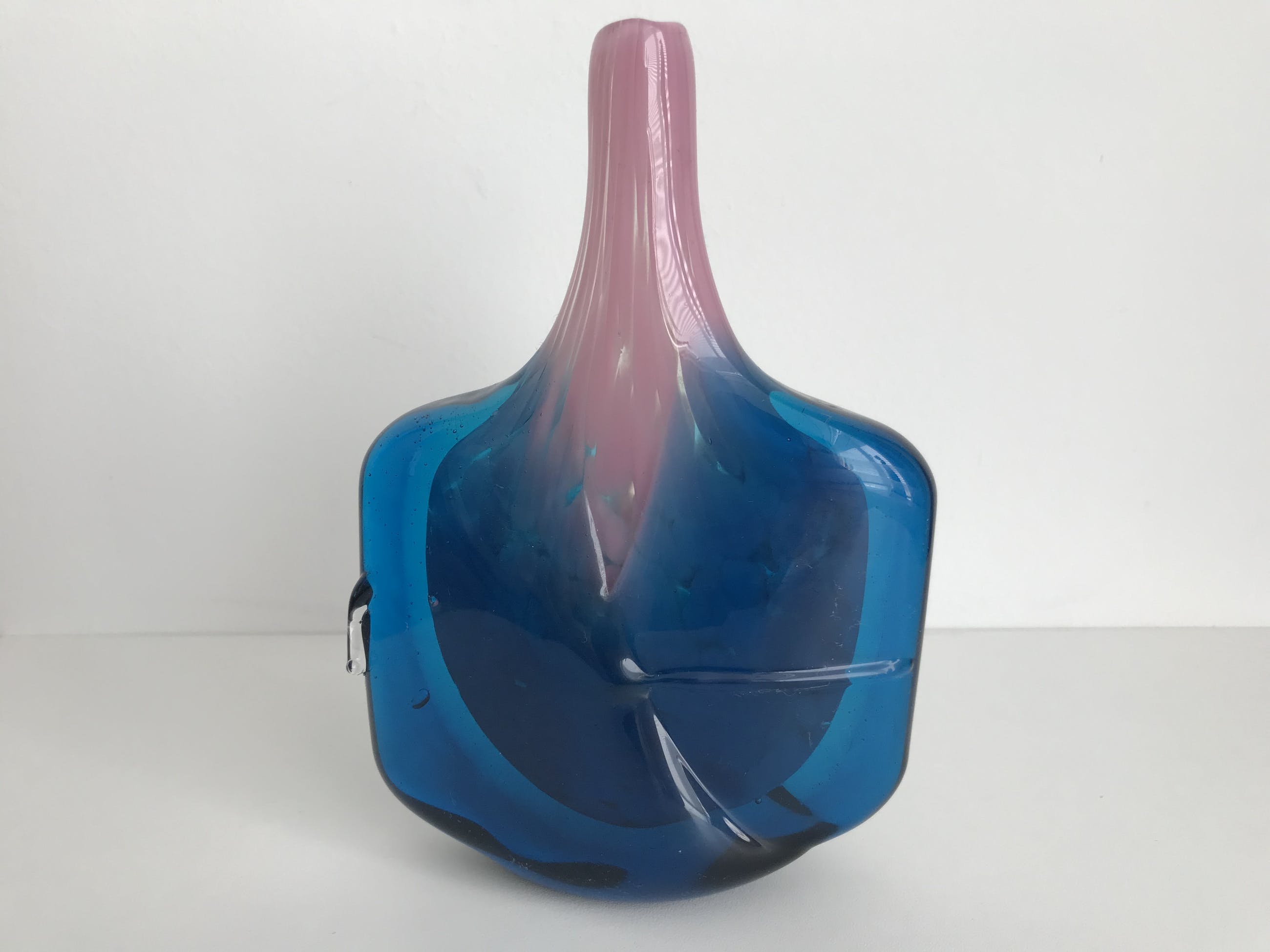 Een prachtige Maltese blauw en roze glazen vaas van Mdina Glass. Zeer bekend onder verzamelaars onder de namen Fish Head vaas en Axe Head vaas. Deze stijl Fish vaas werd geproduceerd vanaf 1973.