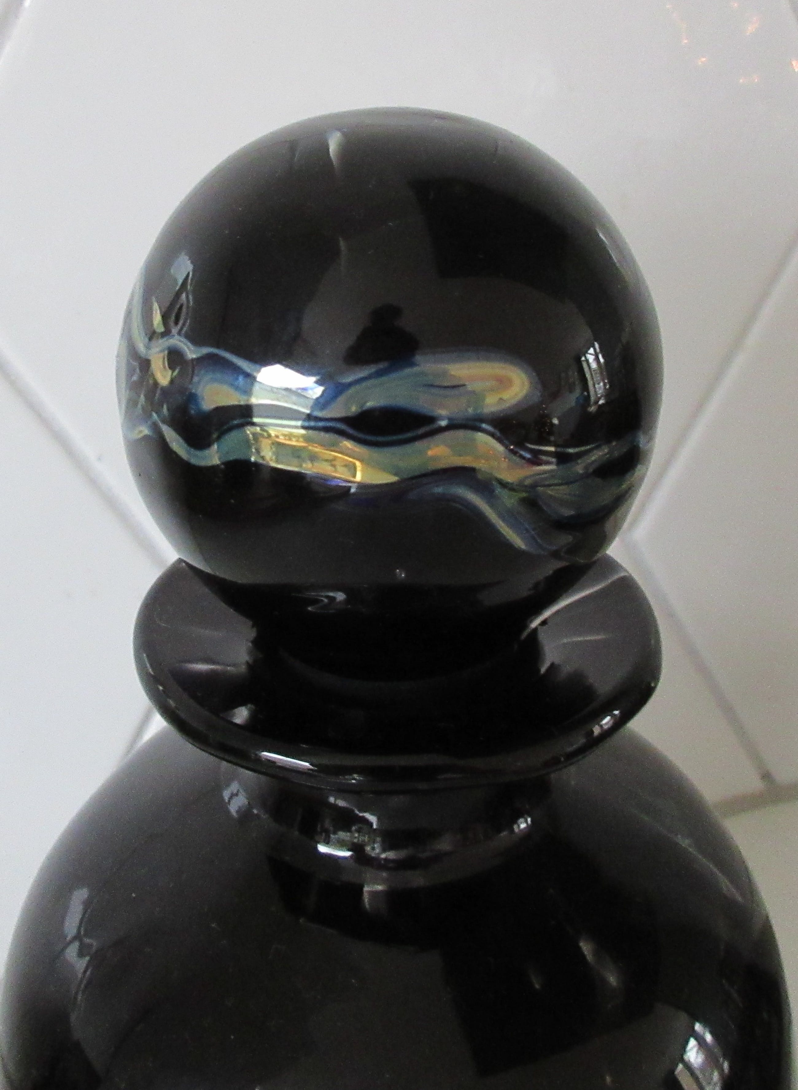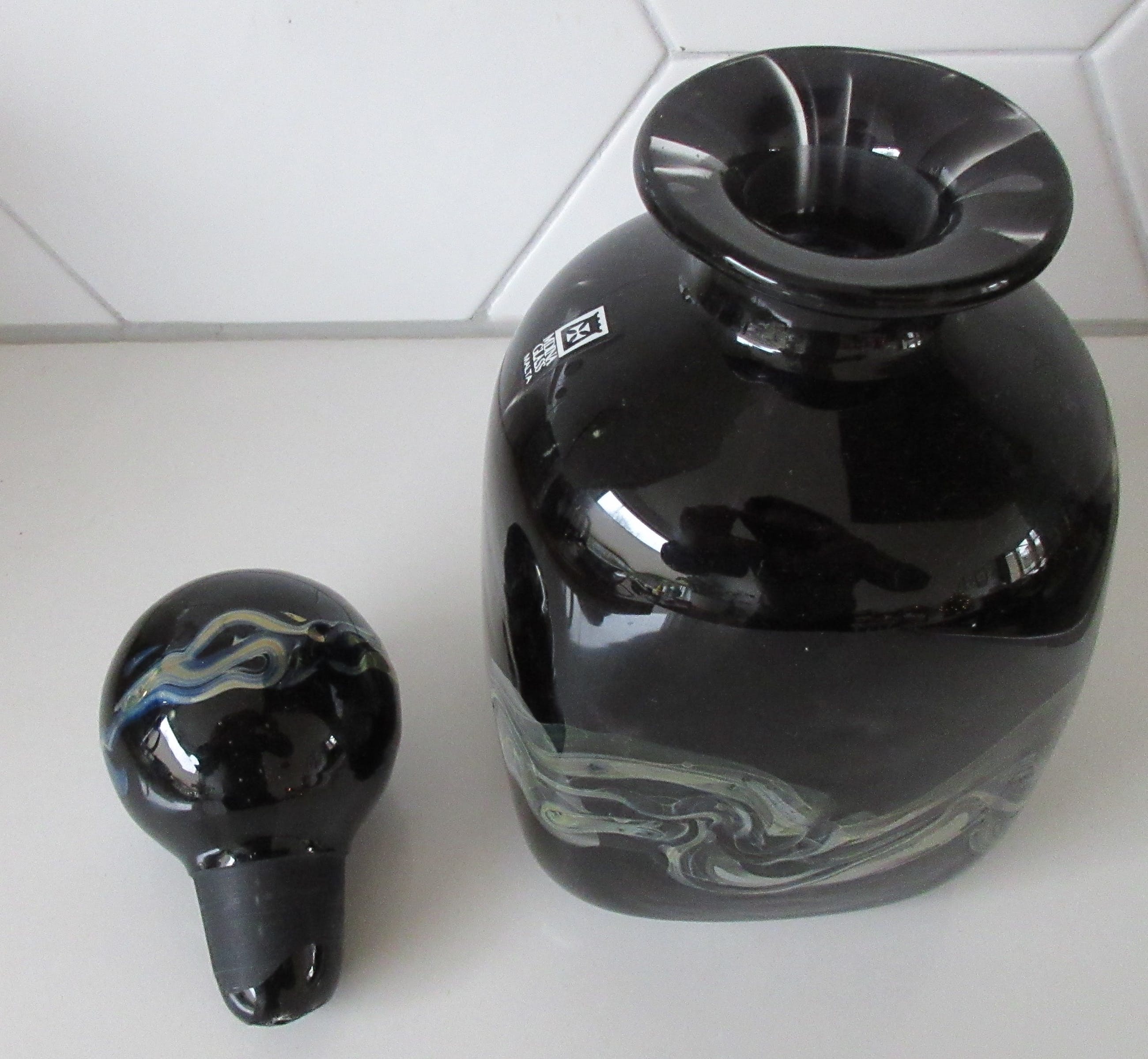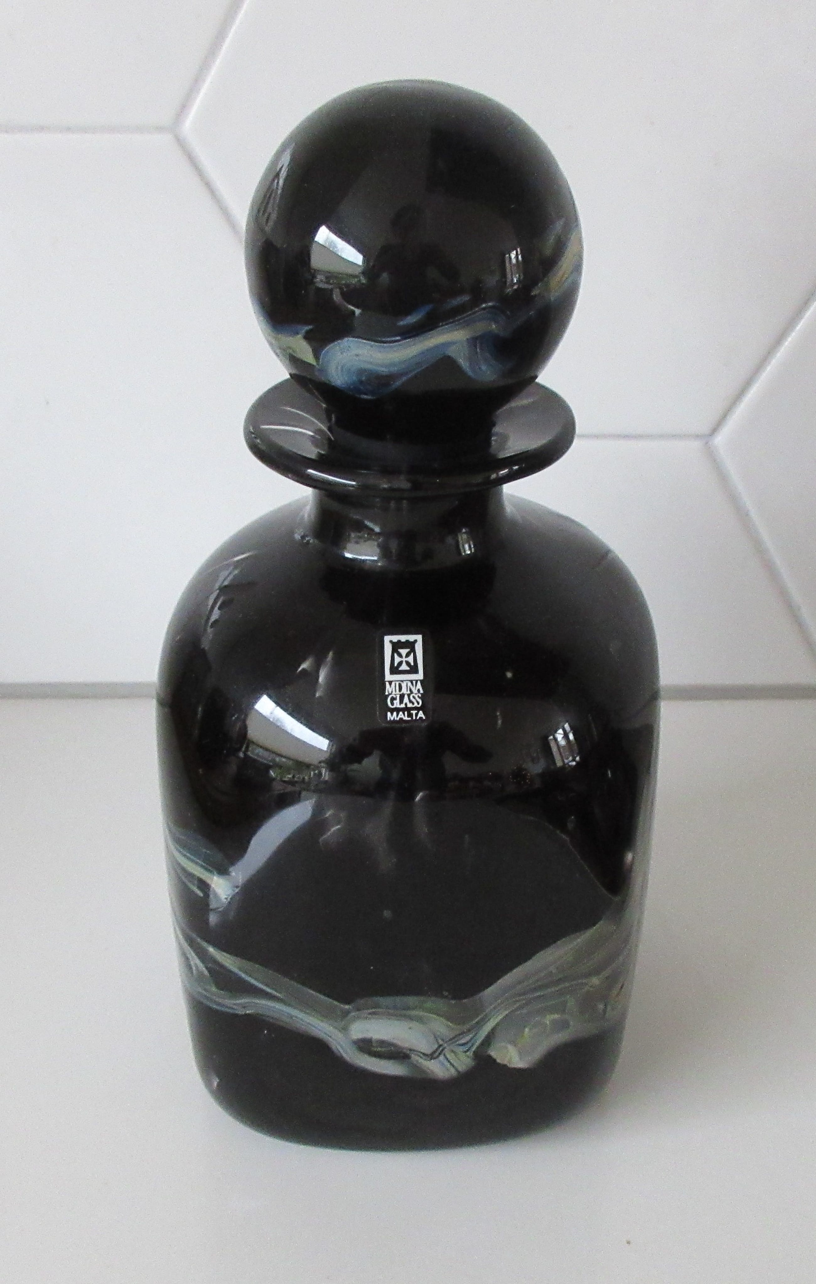 Vierkante zwarte studio glazen karaf met luster decoratie uitvoering Mdina kunstglas uit Malta. Glasblazerij opgezet door de Brit Michael Harris in de jaren'60. Deze karaf is uit 2004 en in prima onbeschadigde conditie, gesigneerd Mdina, '04. Op voorzijde nog voorzien van een merksticker.