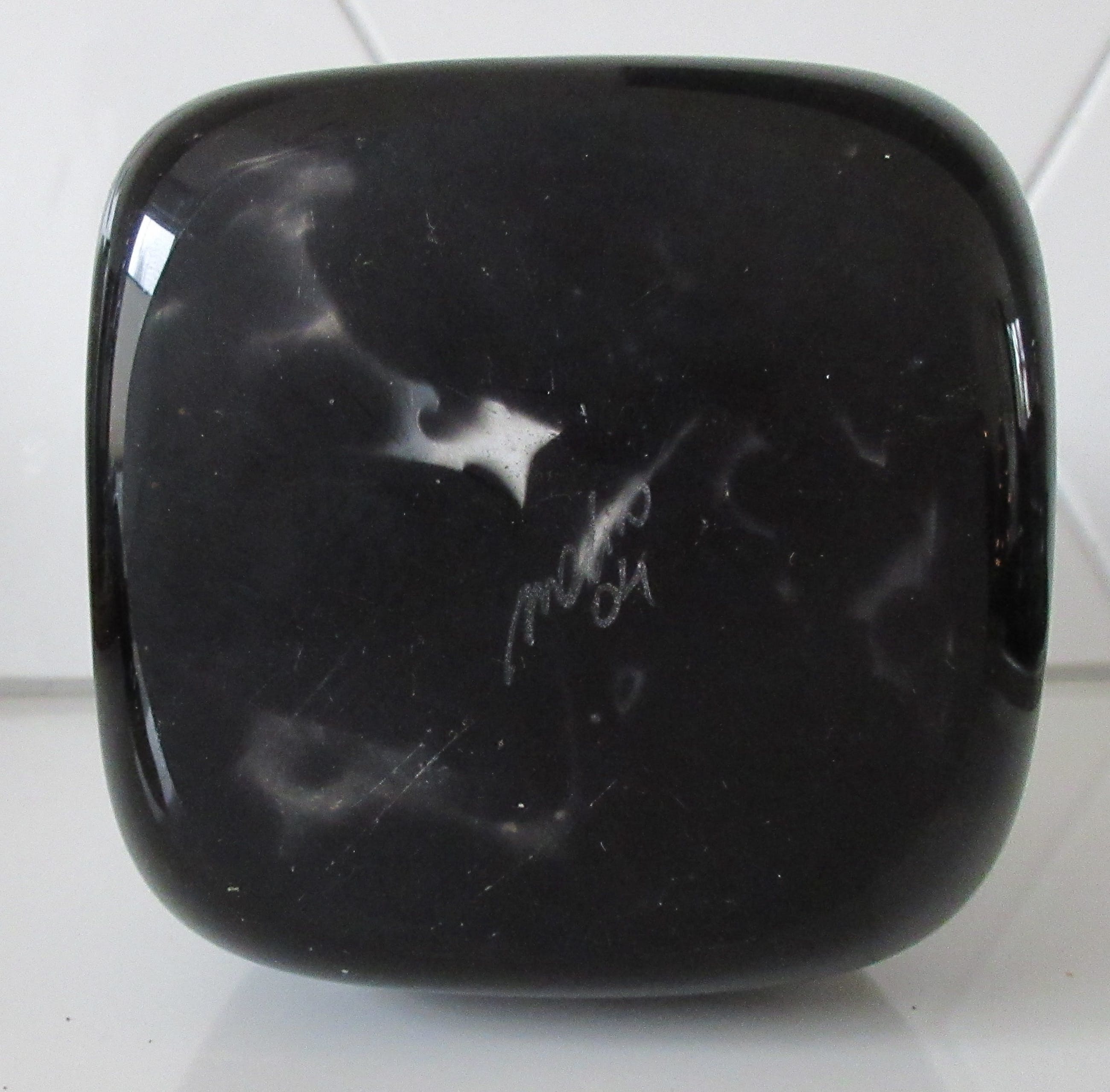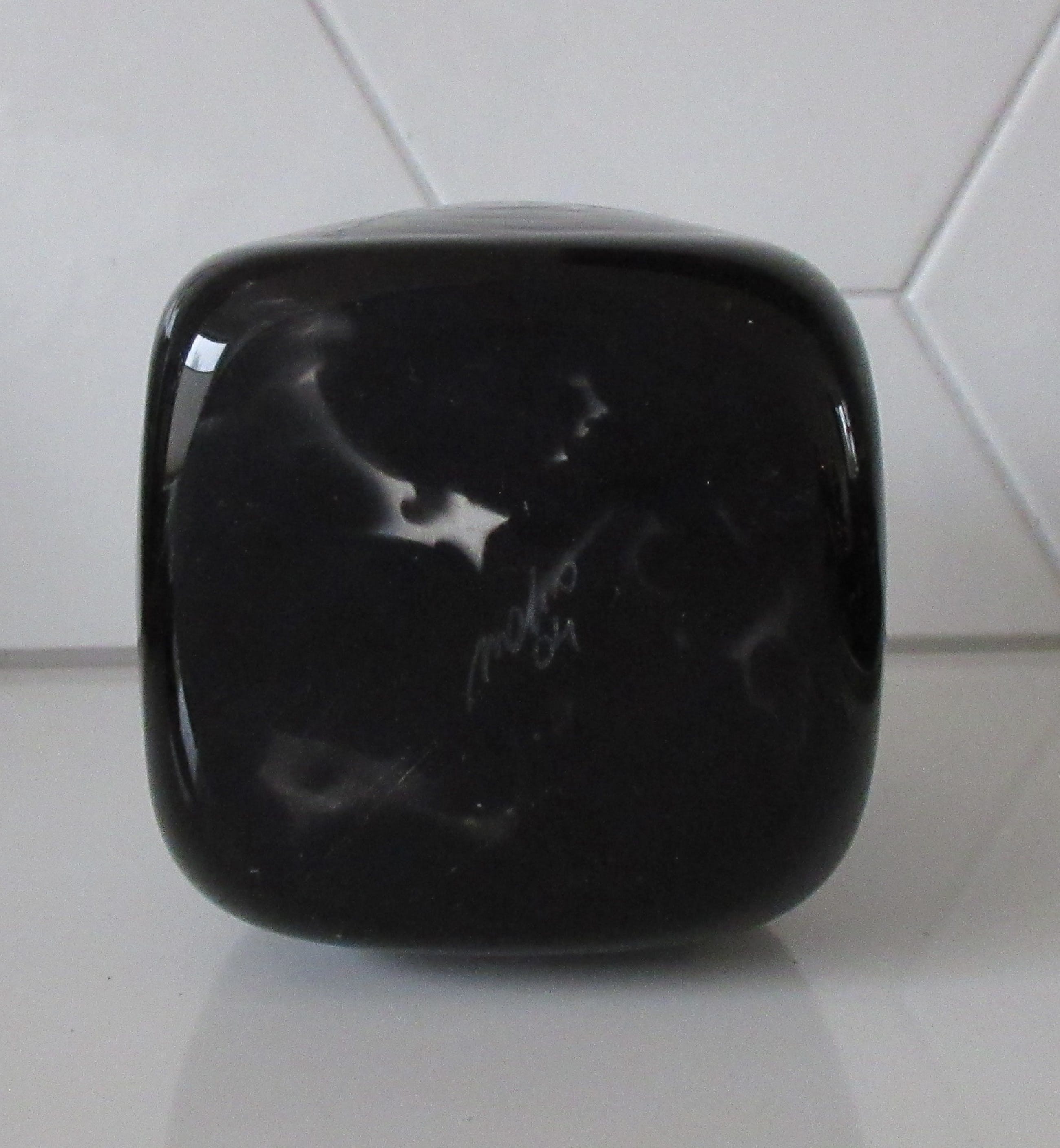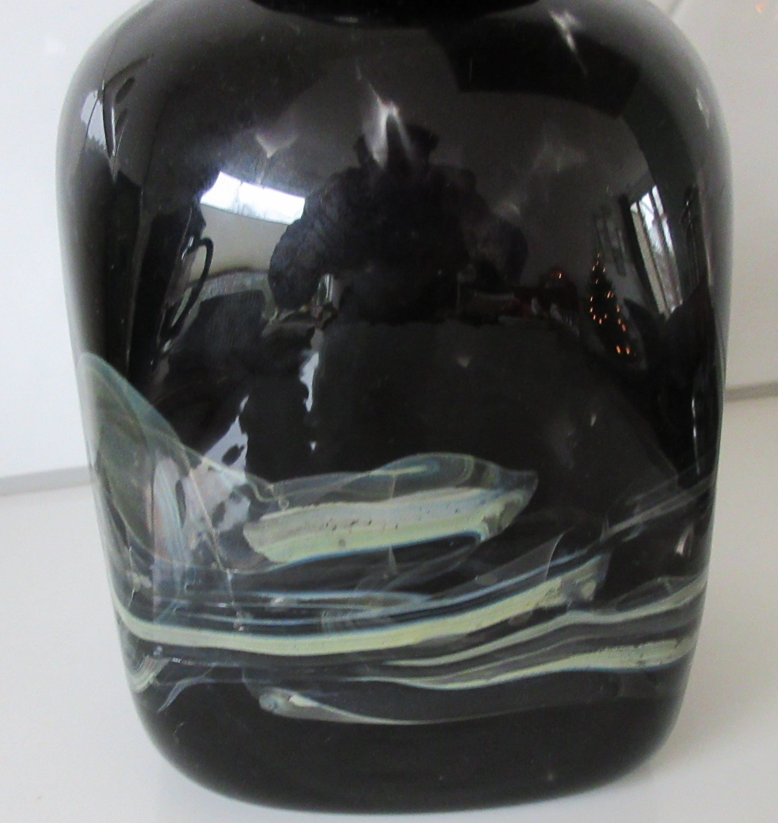 Vierkante zwarte studio glazen karaf met luster decoratie uitvoering Mdina kunstglas uit Malta. Glasblazerij opgezet door de Brit Michael Harris in de jaren'60. Deze karaf is uit 2004 en in prima onbeschadigde conditie, gesigneerd Mdina, '04. Op voorzijde nog voorzien van een merksticker.