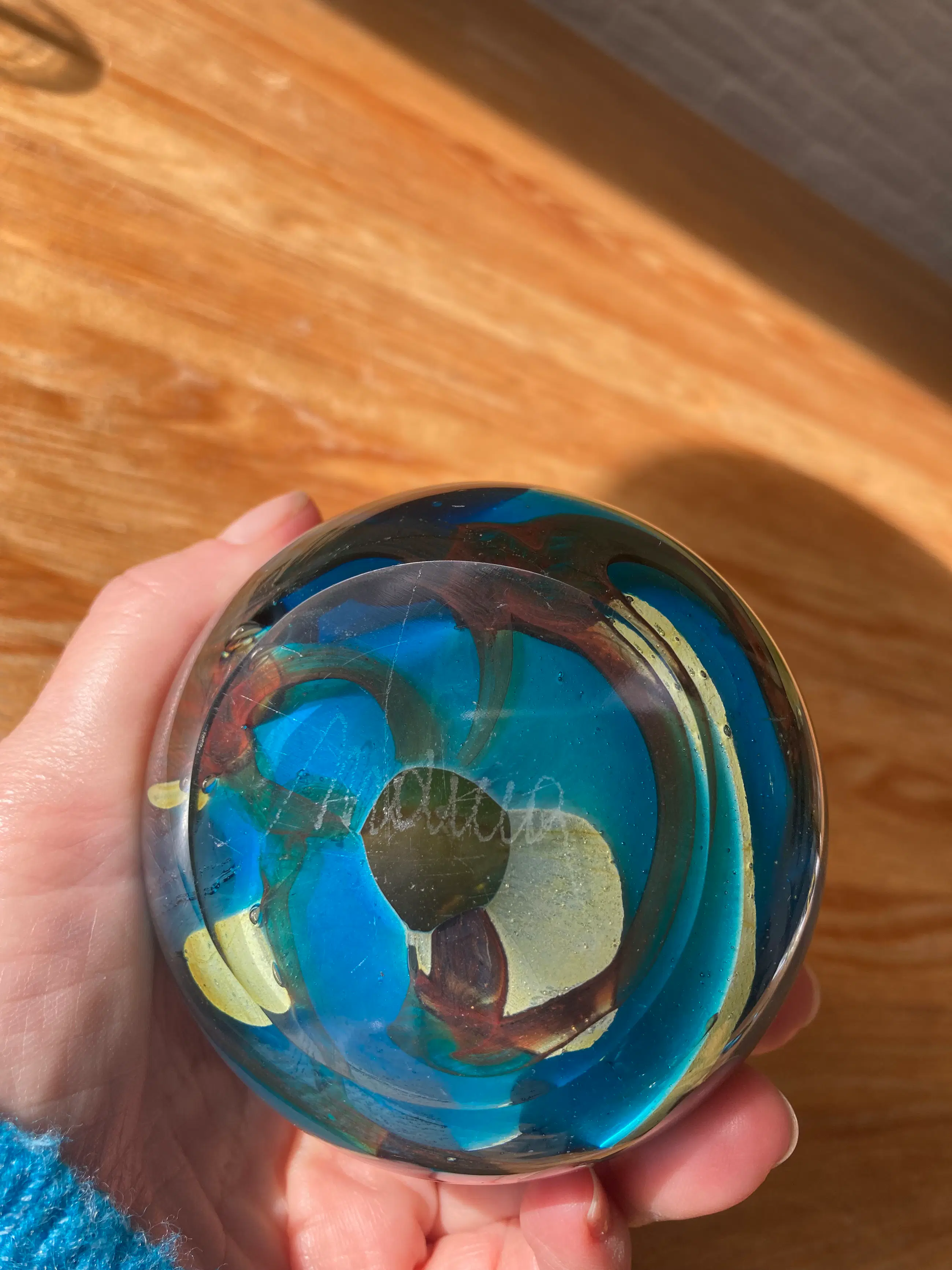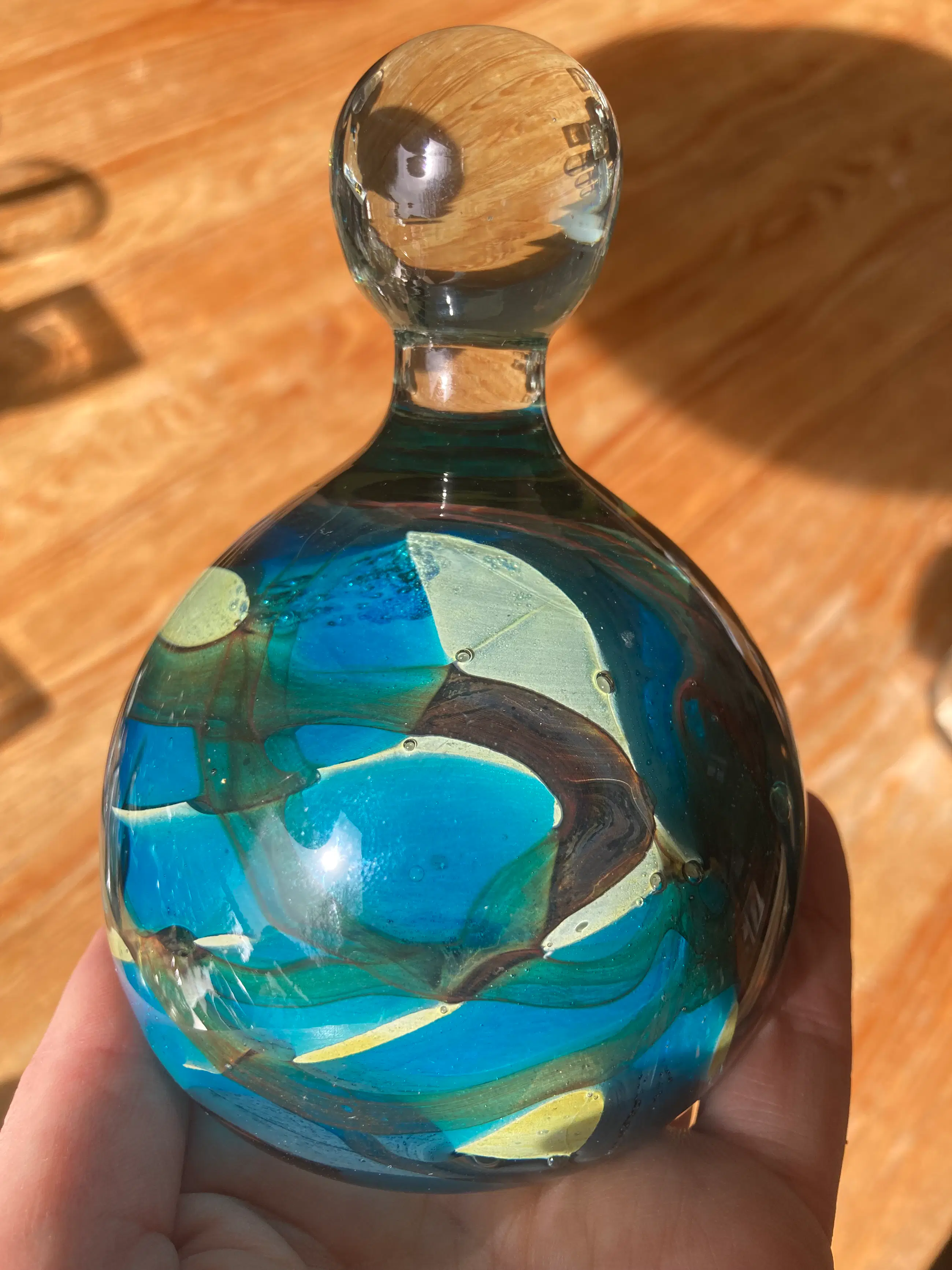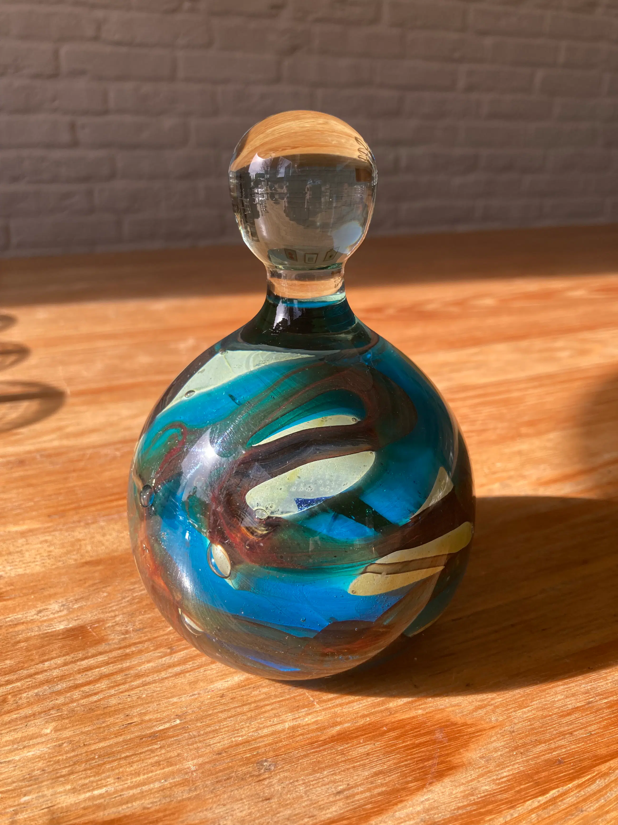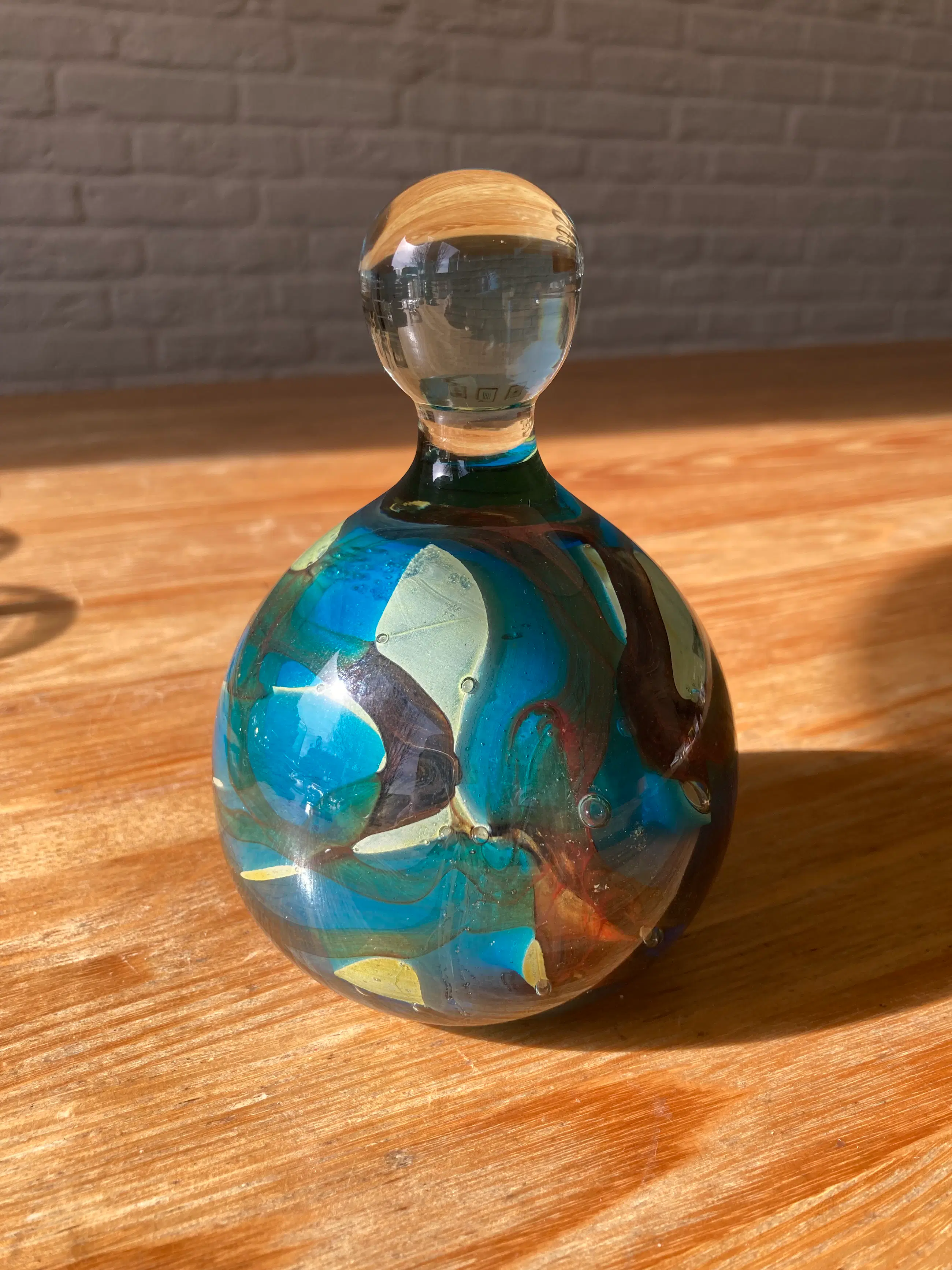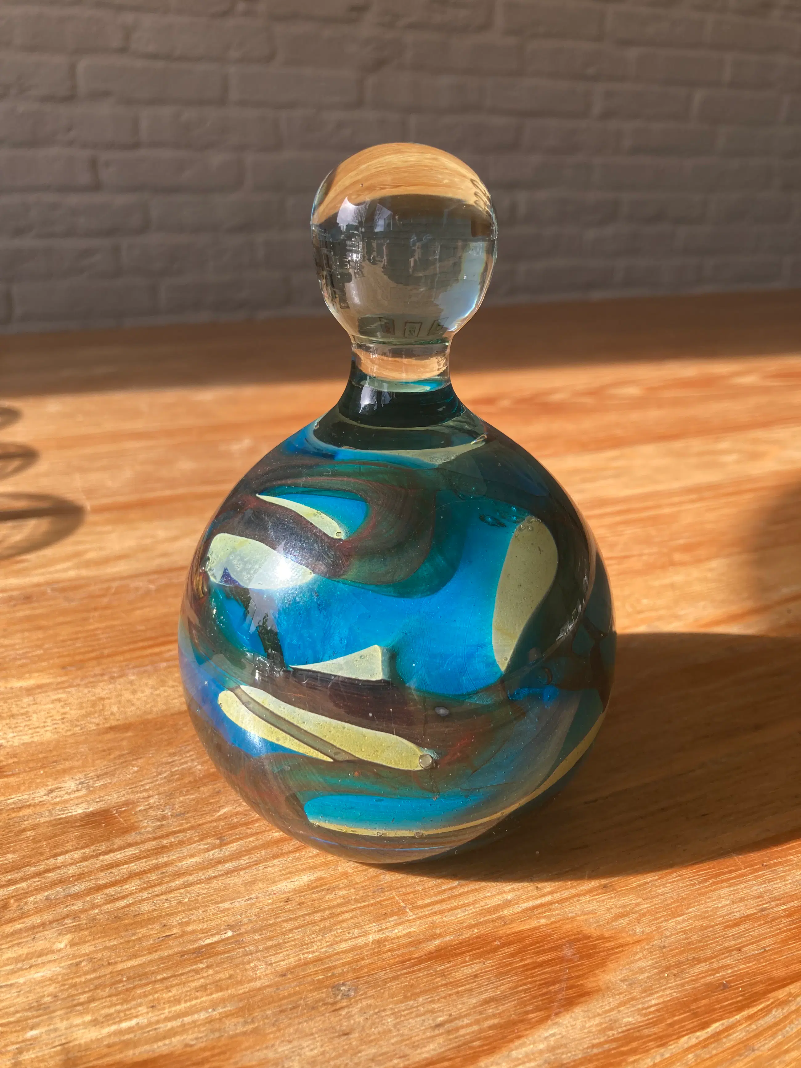 Het stuk is handgemaakt en staat bekend om zijn artistieke gebruik van kleuren, vaak geïnspireerd door de zee en de lucht. Typisch voor Mdina glas zijn de organische vormen en swirls in het glas. Prachtig organisch presse-papier en een object aan zich.