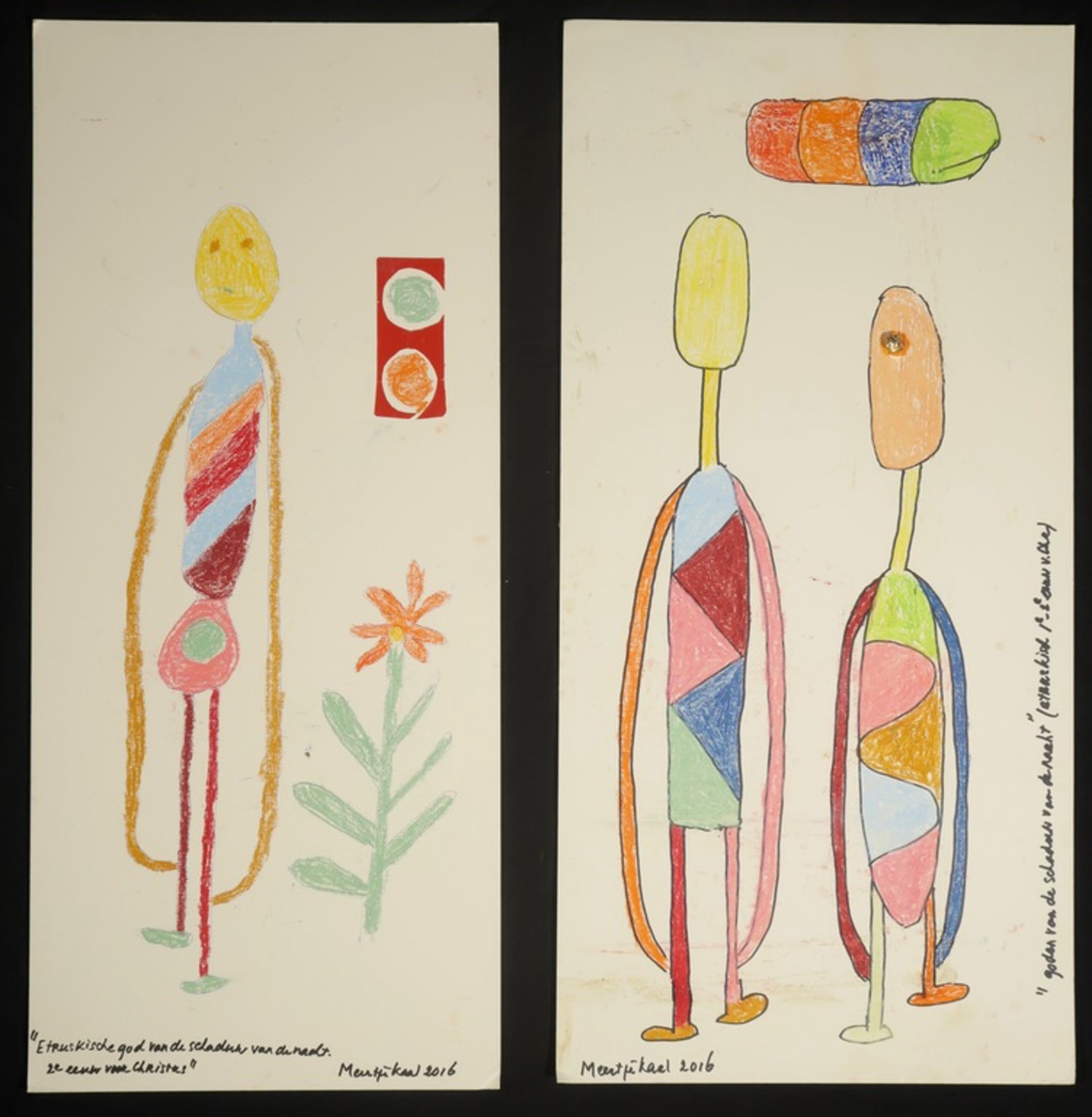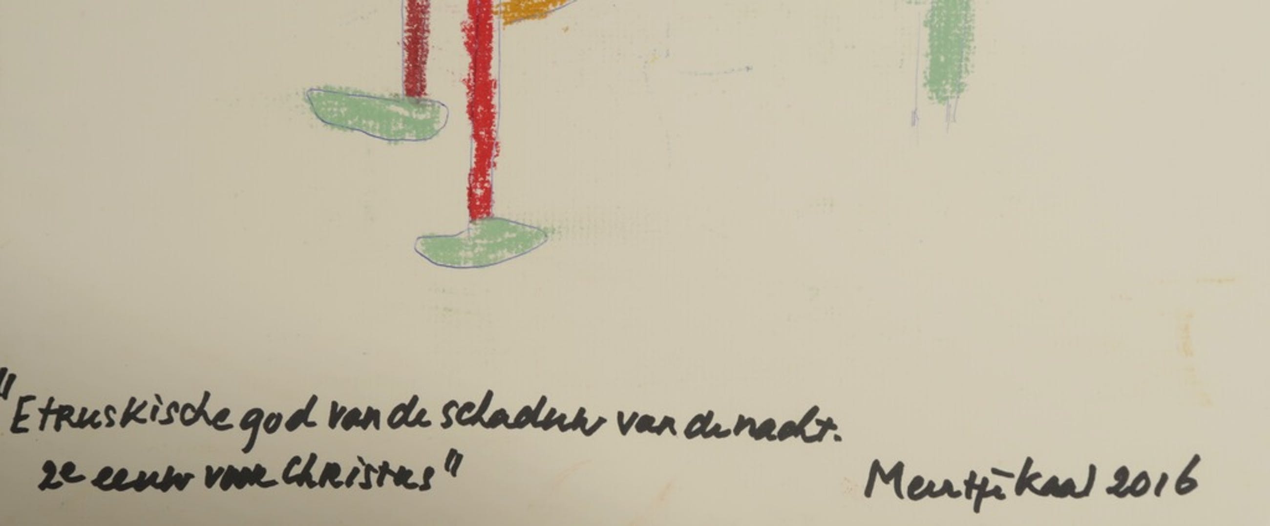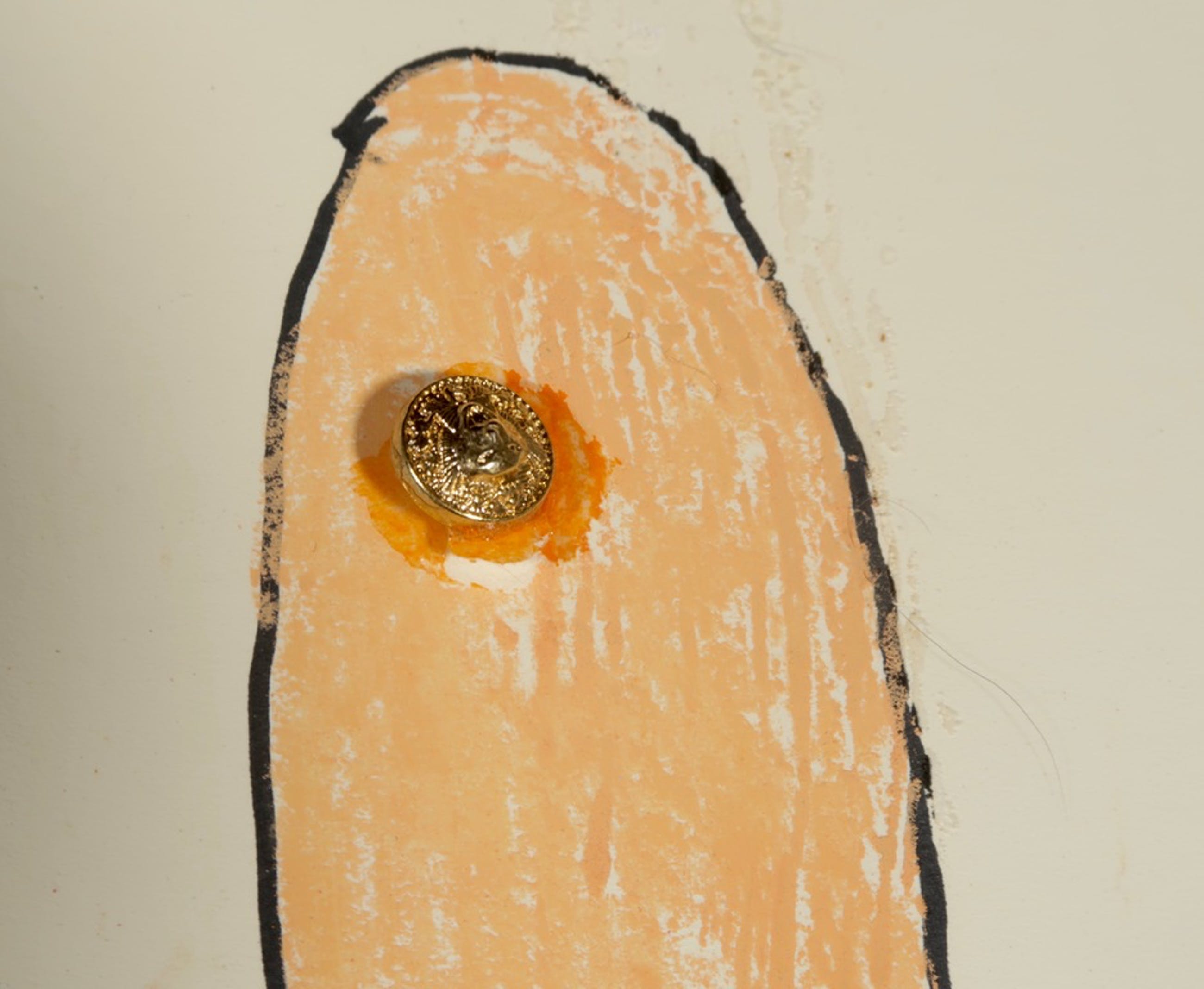 Materiaal: Gemengde techniek op papier, o.a. krijt, stift en een knoop
