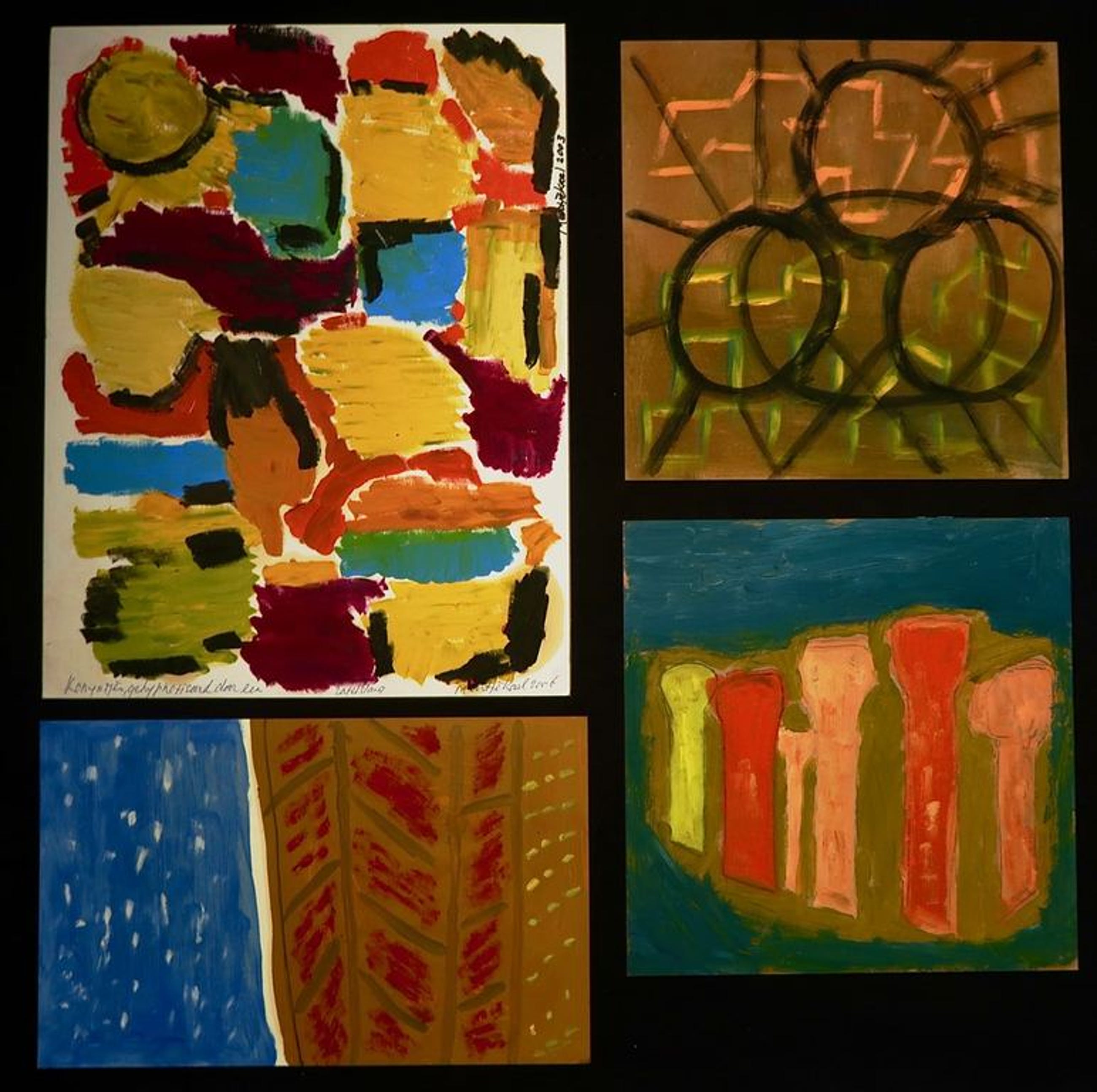 Vier olieverf werken op papier en hout van Meertje Kaal