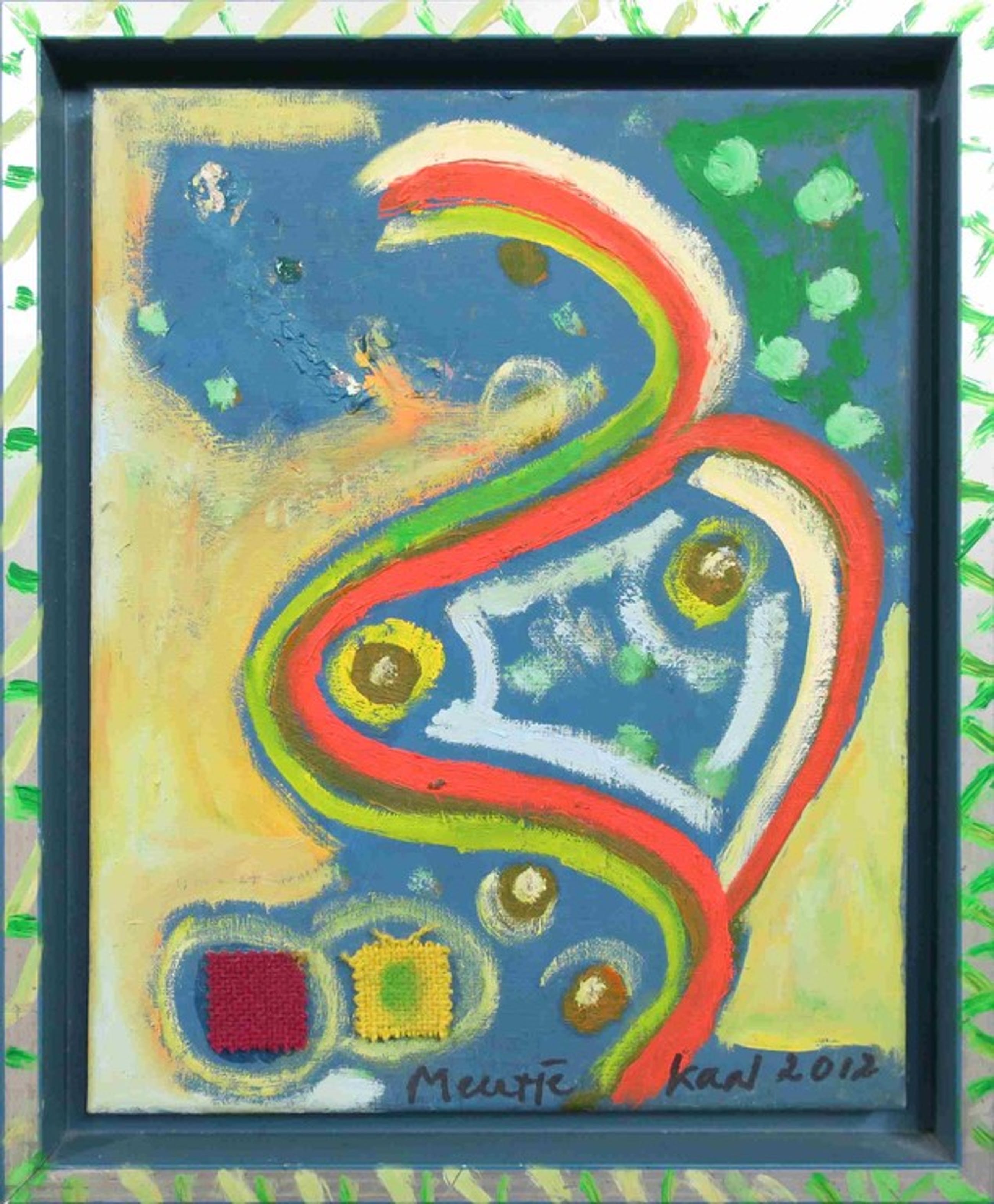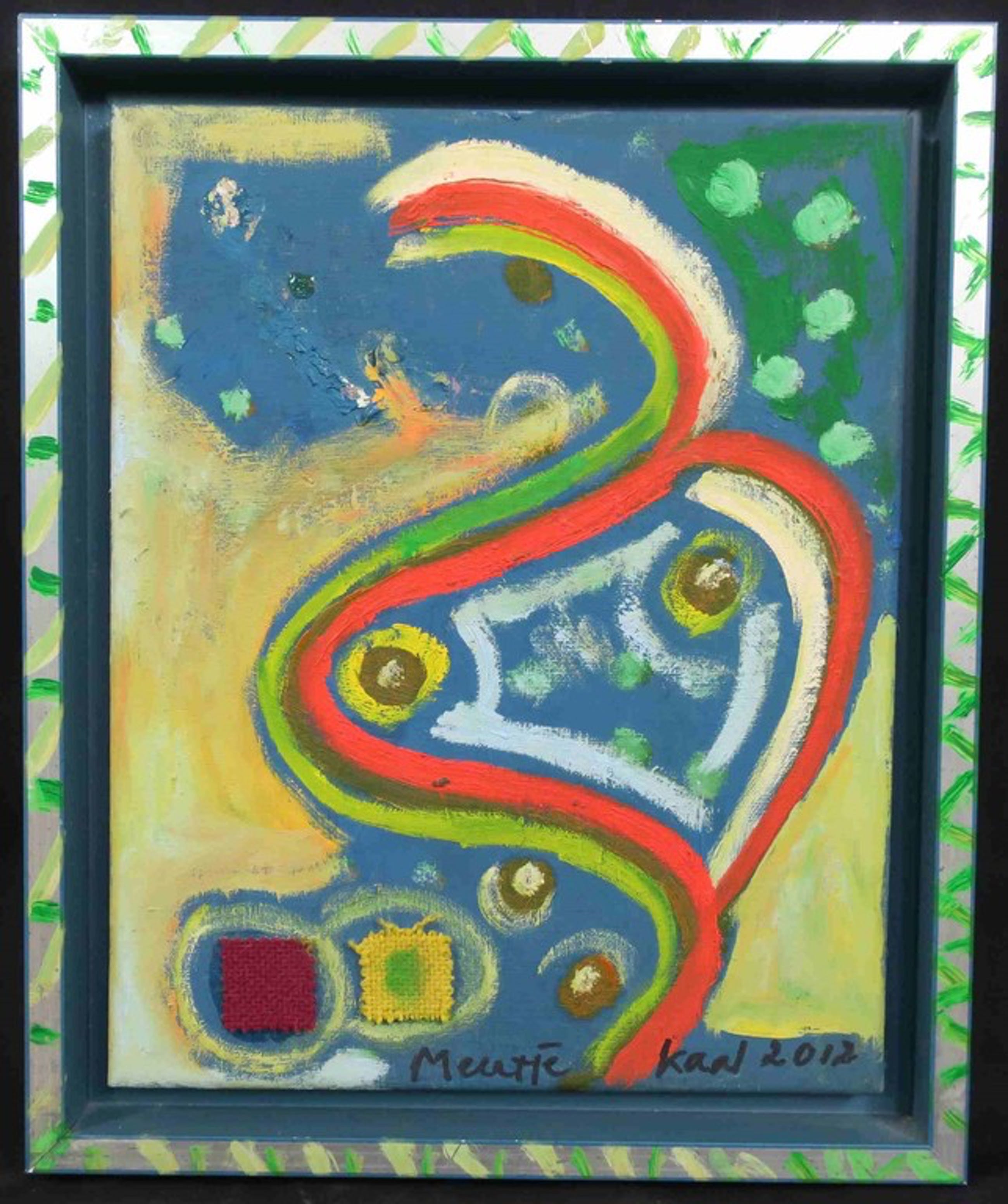 Ingelijst: Ja, in door de kunstenaar beschilderde houten lijst