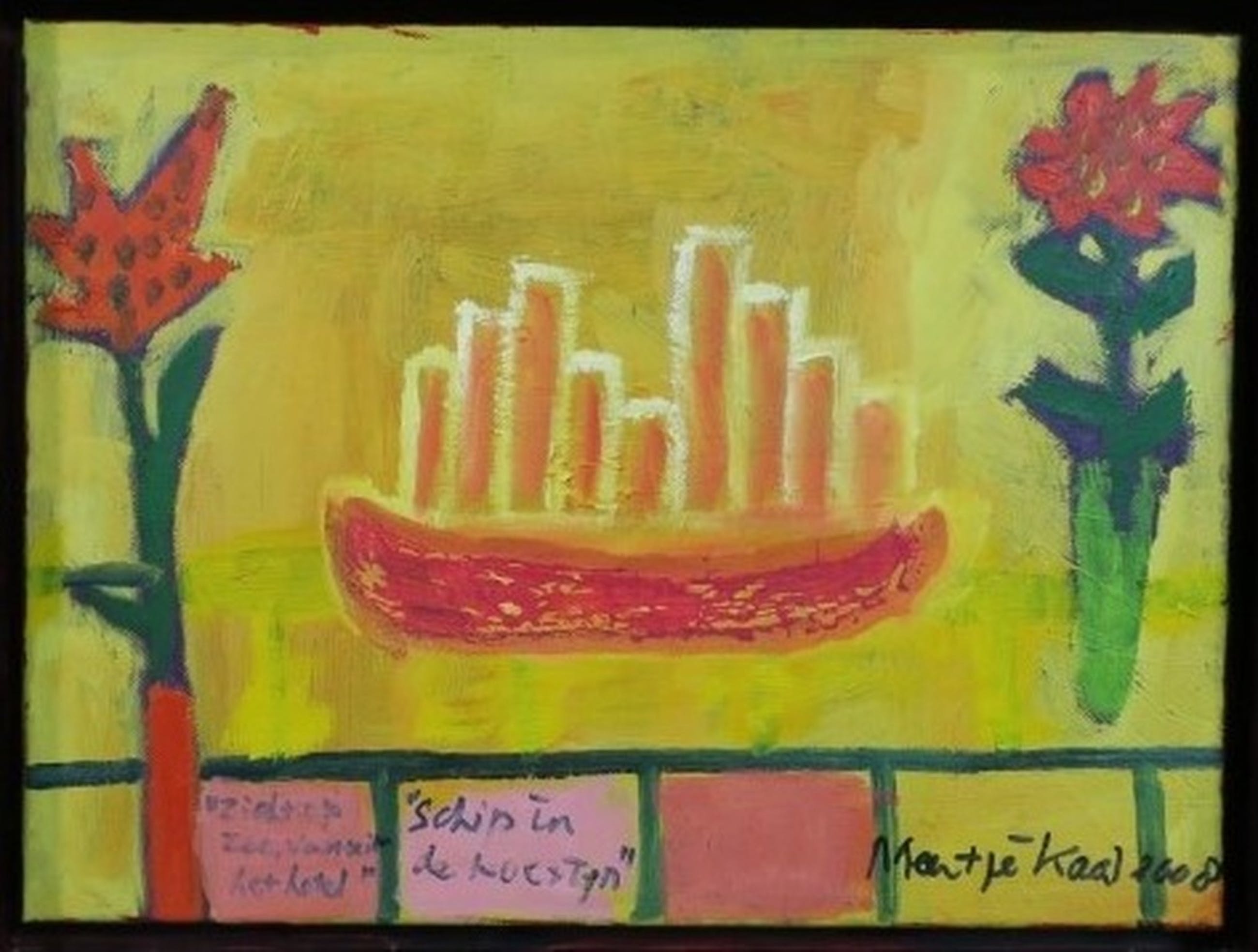 Titel: "Zicht op zee vanuit het hotel" en "Schip in de woestijn"