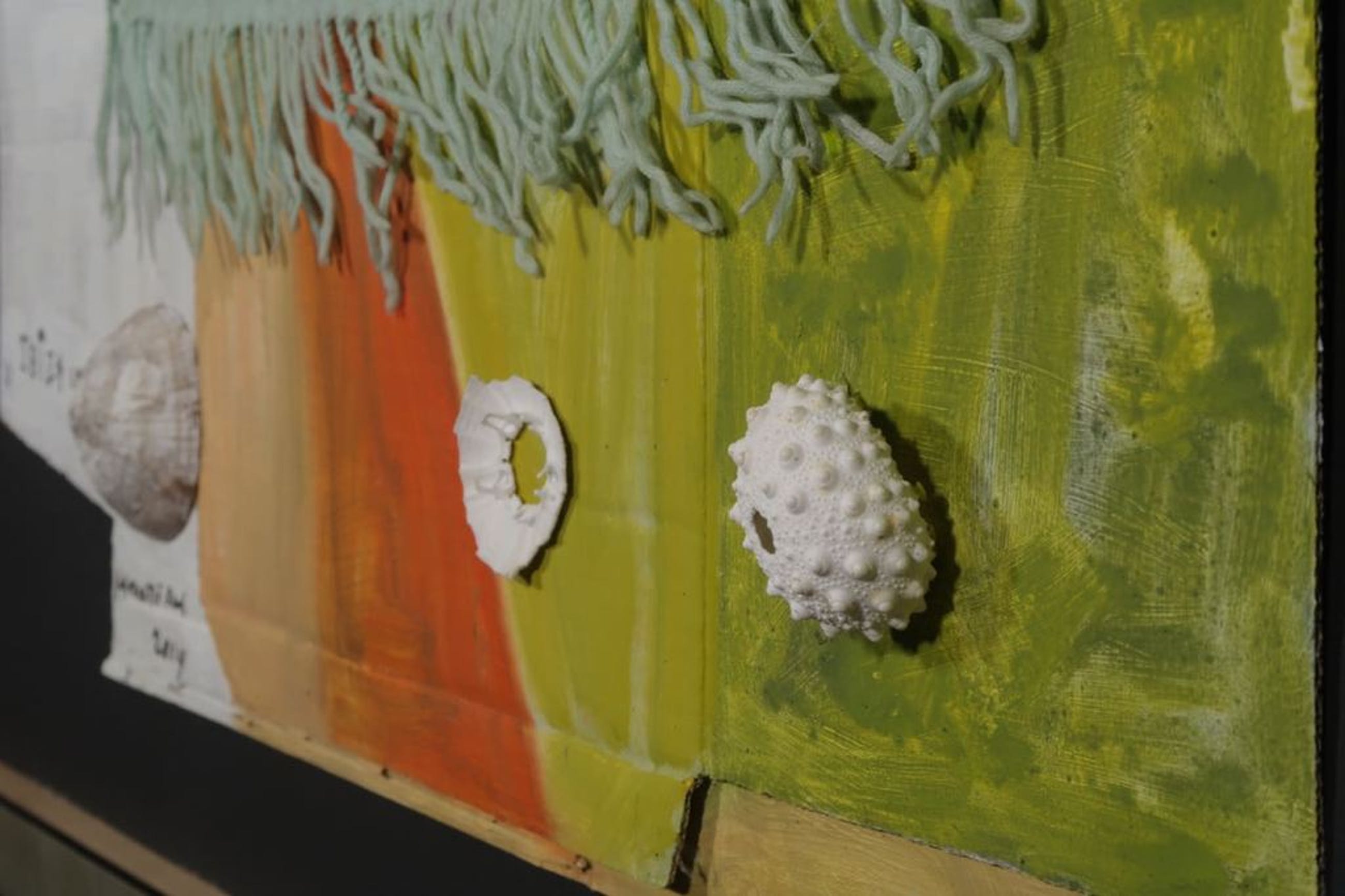 Materiaal: Olieverf en collage op karton, o.a. opgeplakte schelpen