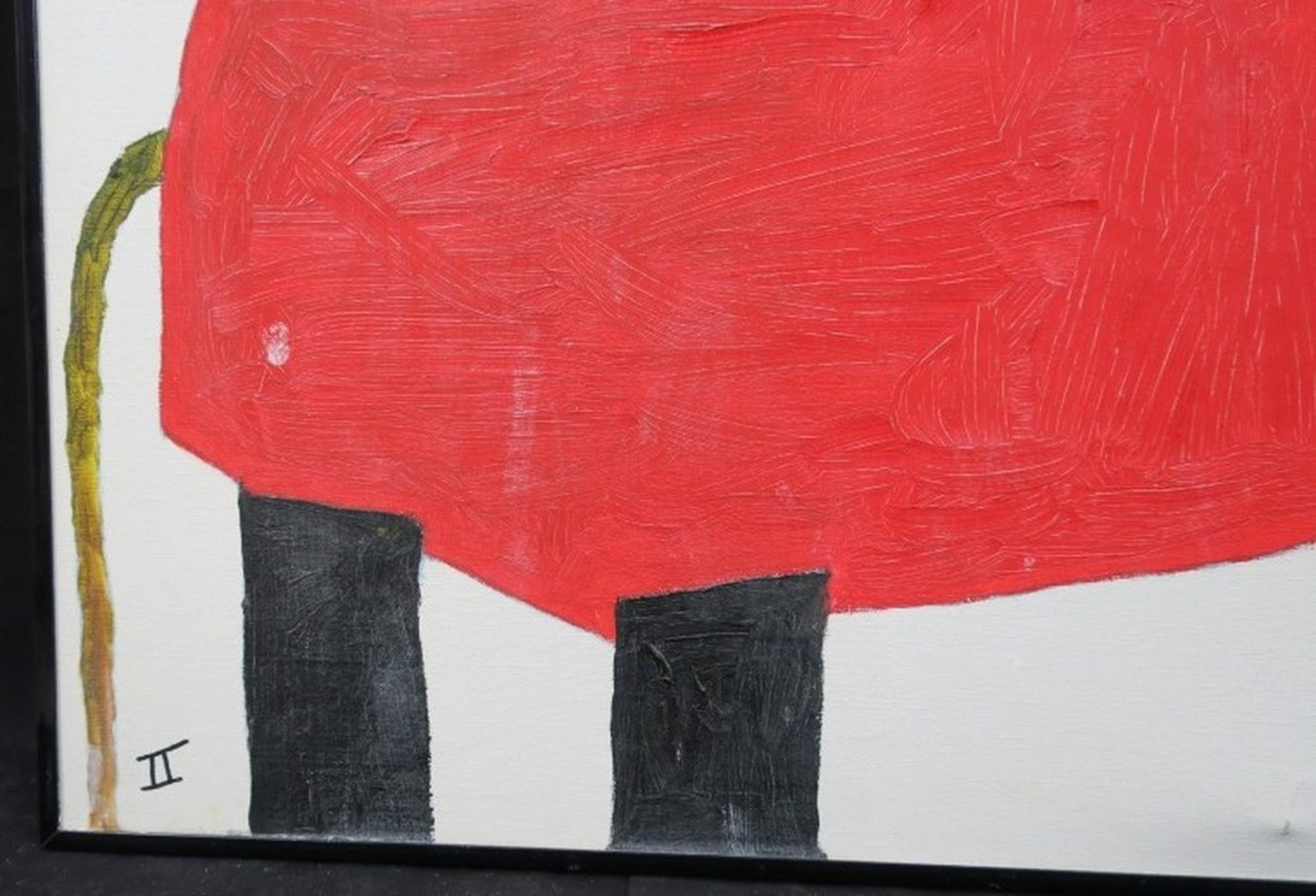 Conditie: In goede staat, maar een stipje verfverlies in de tafelpoot onder, een buts vanaf de achterkant naar voren (midden-onder), plus wat krassen en beschadigingen in het wit en langs de randen (zie foto's), schilderij is wat smoezelig.