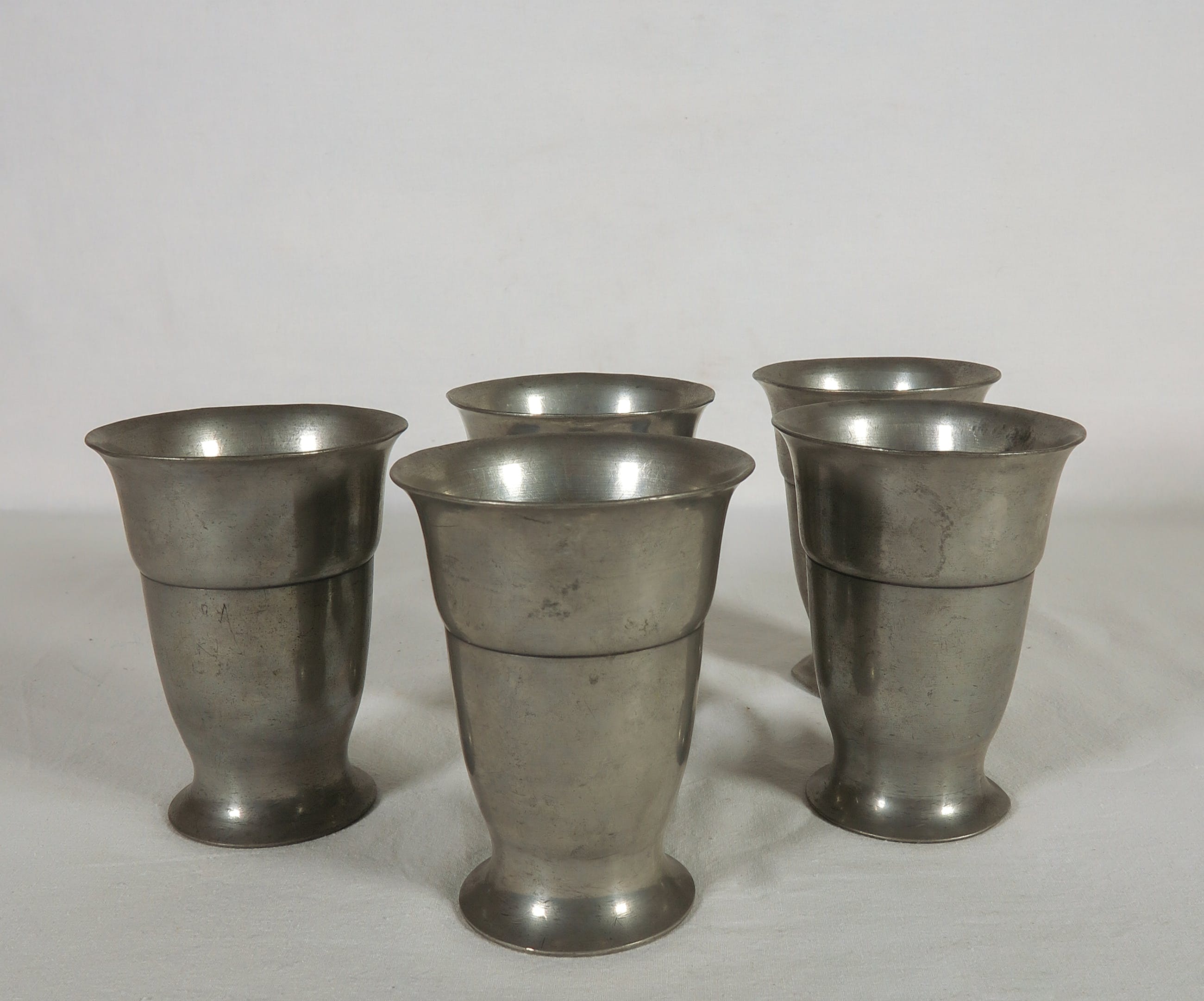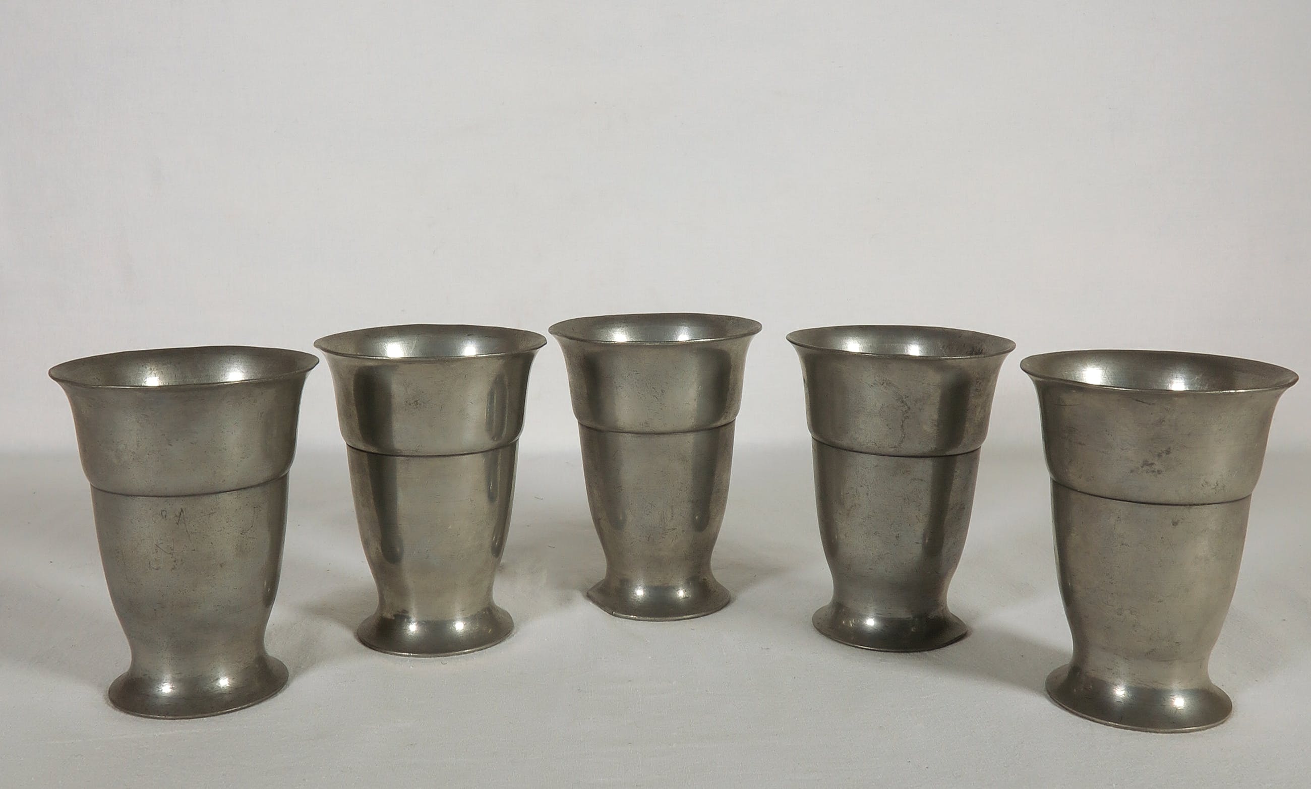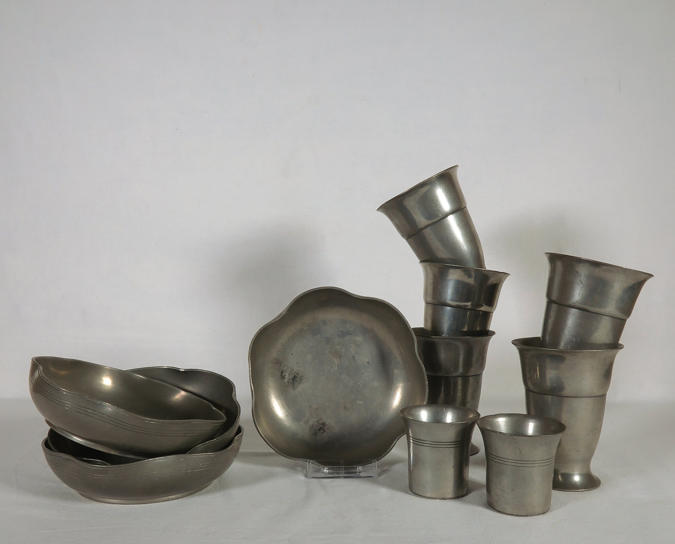 Lot van tin, bestaande uit vijf bekers, vier schalen en twee napjes.
