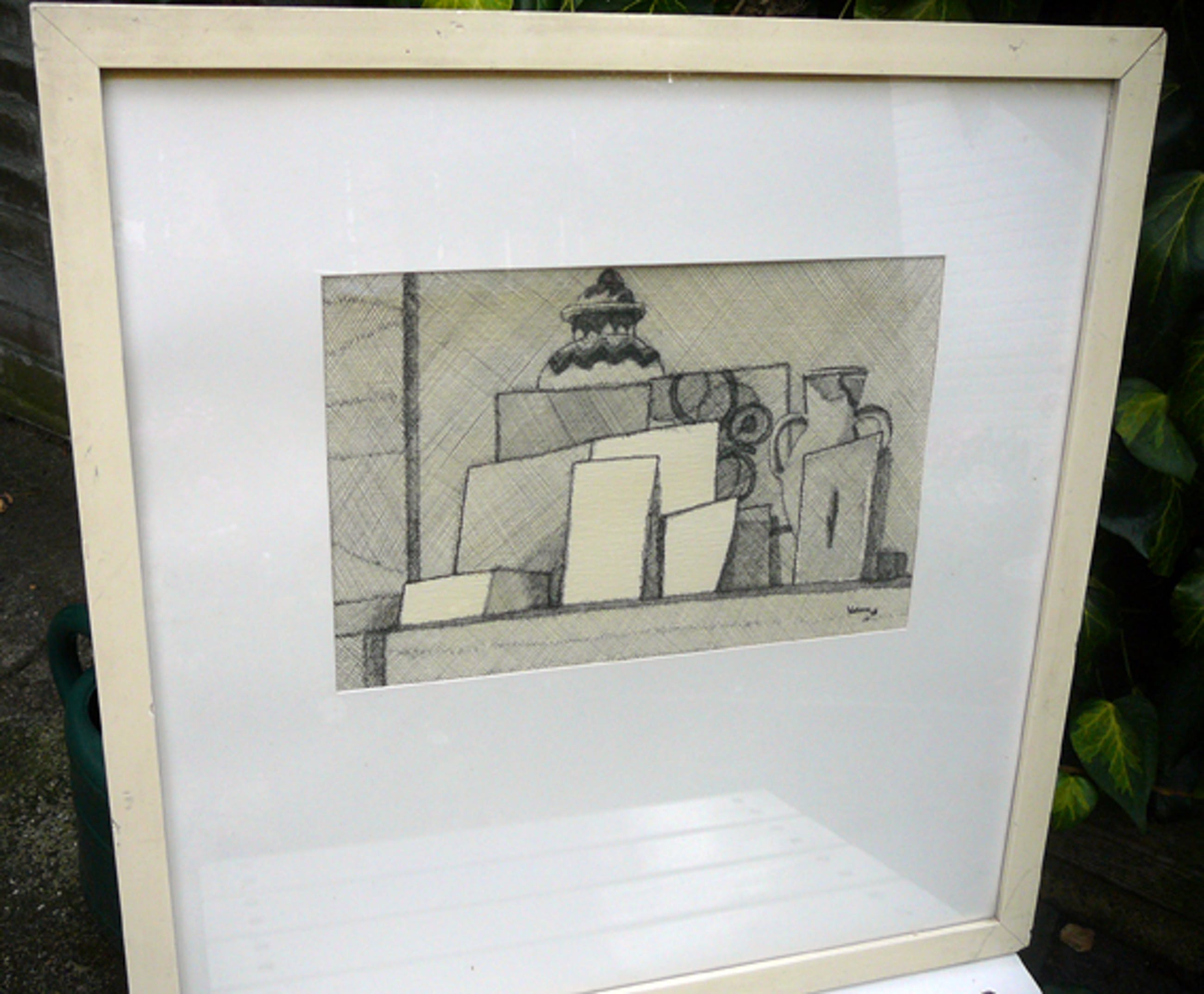Gestyleerd stilleven, pentekening met oostindische inkt. Rechtsonder gesigneerd en gedateerd 1966. Aan achterzijde voorzien van diverse labels (BKR). In originele lijst achter glas.
