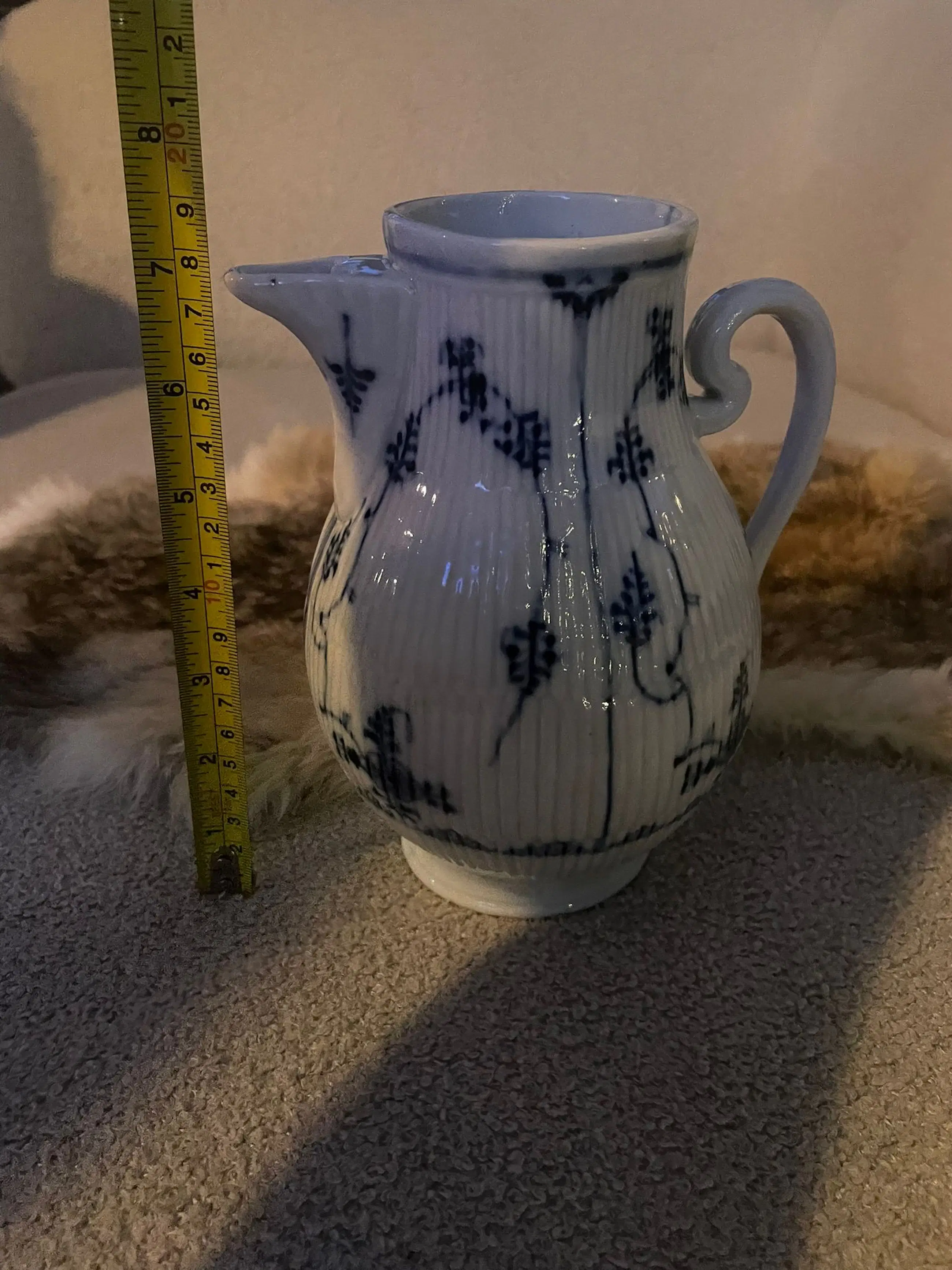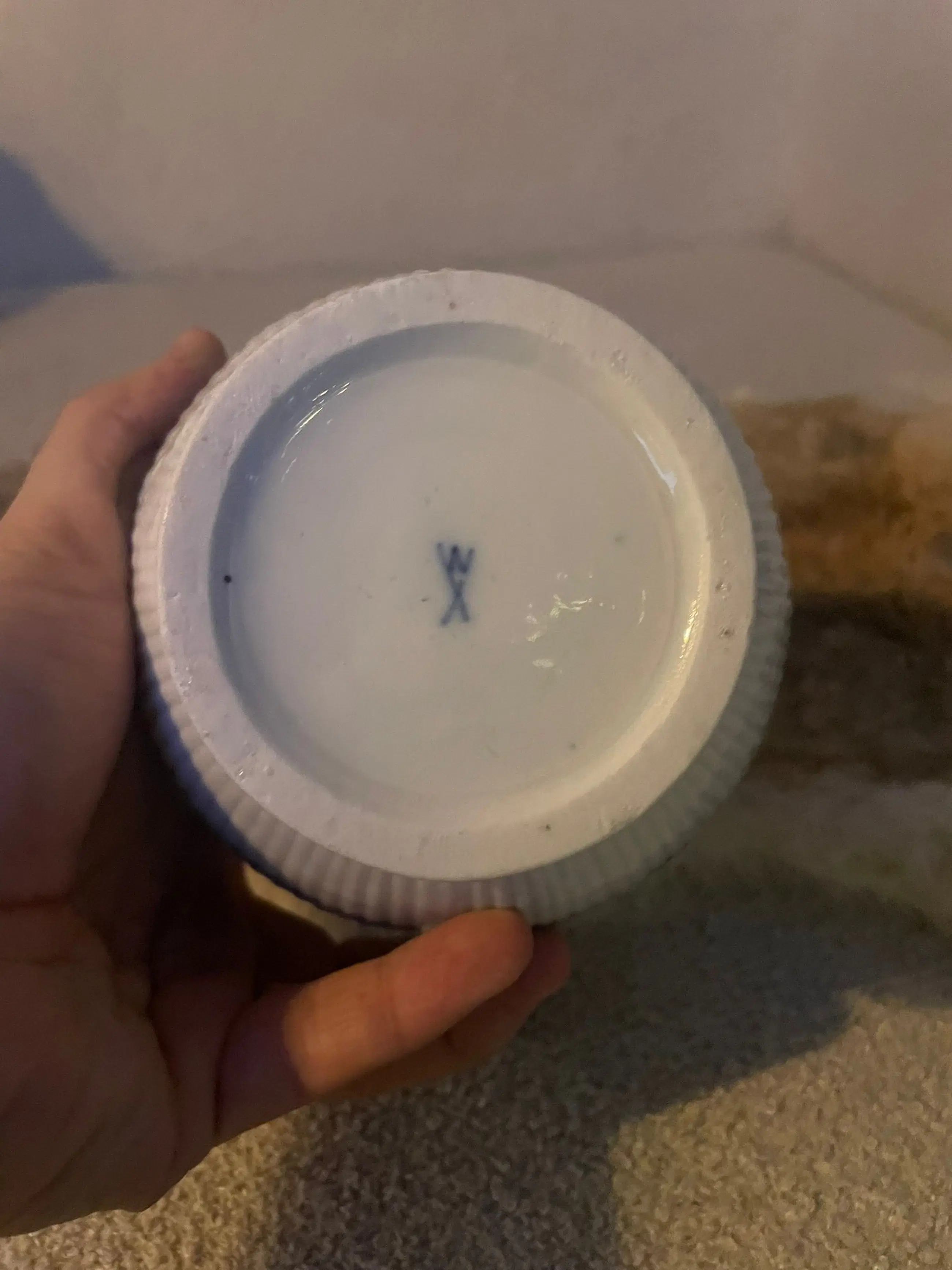 Authentieke antieke Meissen porseleinen kan, 20 cm hoog, voorzien van het blauwe WX-merk. Meissen staat sinds het begin van de 18e eeuw bekend om zijn vakmanschap en het onmiskenbare merksysteem. De WX-stempel is waarschijnlijk een interne kunstenaars- of productcode, wat extra historische en verzamelwaarde toevoegt.