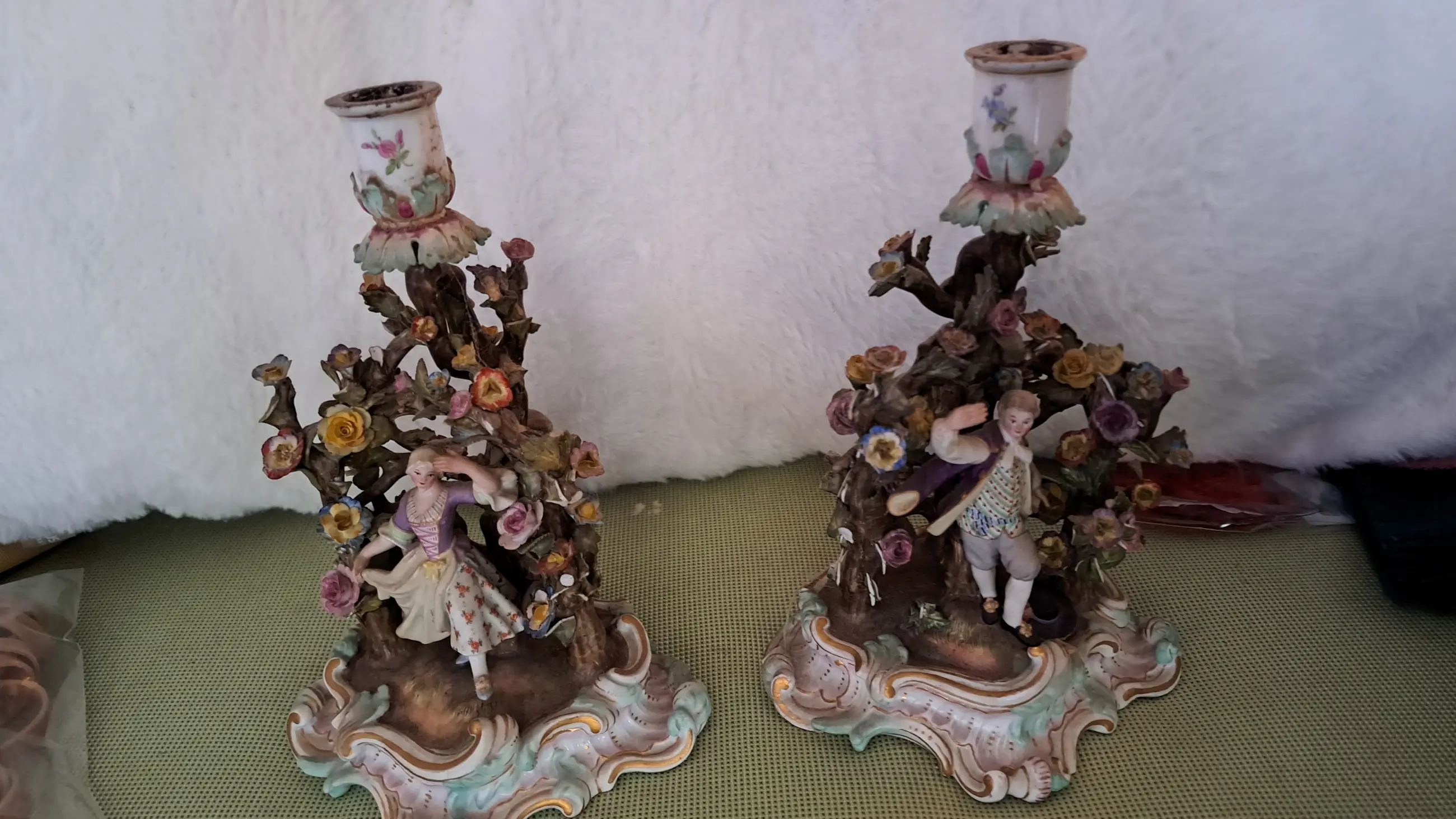 Kandelaars in de vorm van een man en een vrouw. Onder een boom met bloemen.