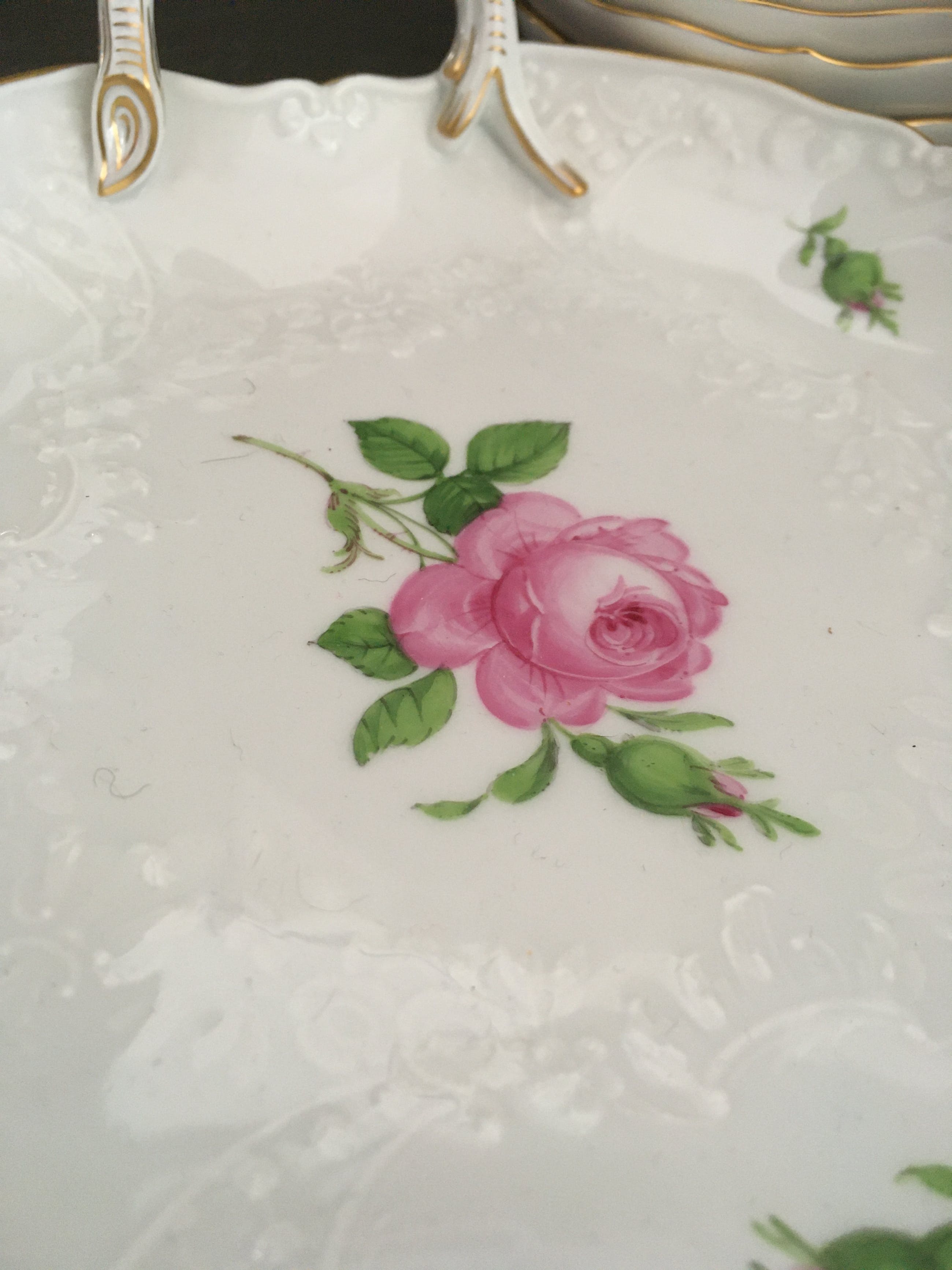 Prachtige set van Meissen kwaliteit porselein met lichtroze roos decor in uitstekende staat.