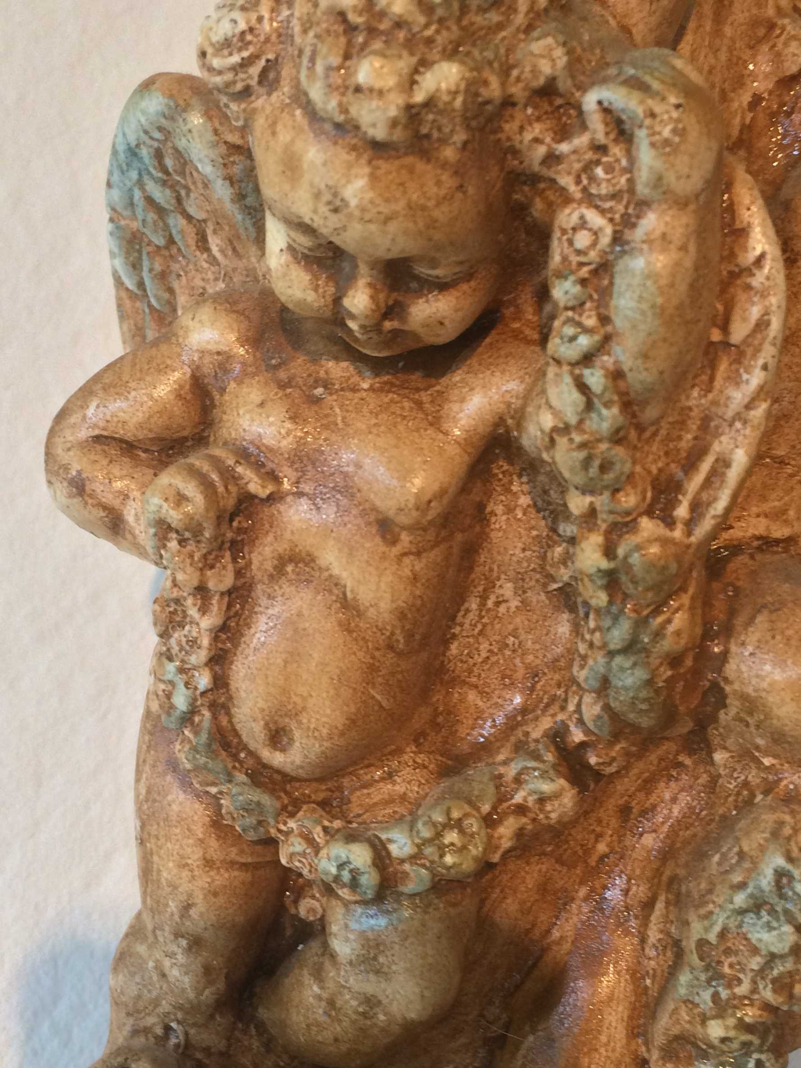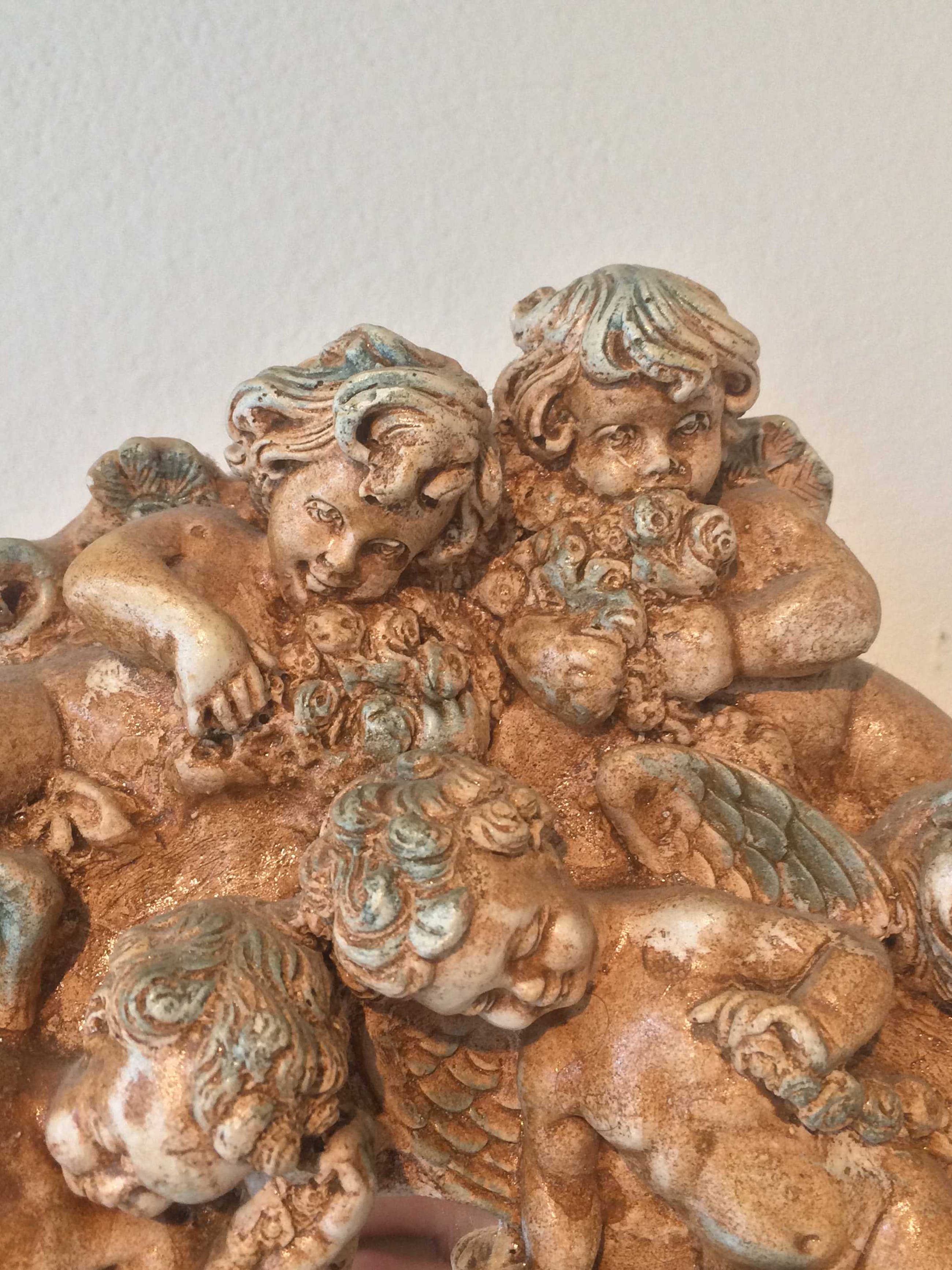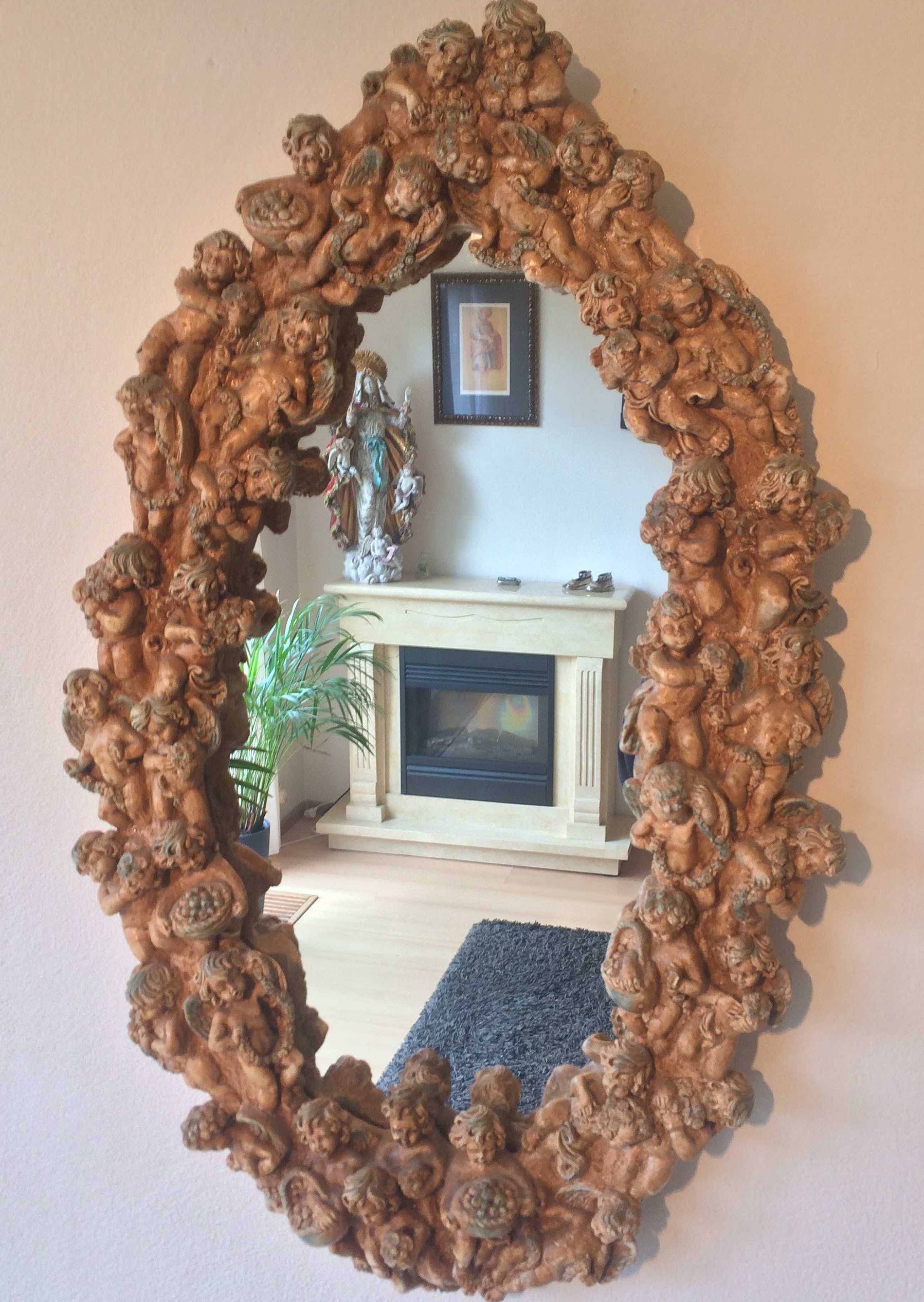 Een unieke handgemaakte spiegel,geen enkele cherub is het zelfde gemaakt. Zit een mooie patina laag op,De spiegel is vervangen (zie foto achterkant)