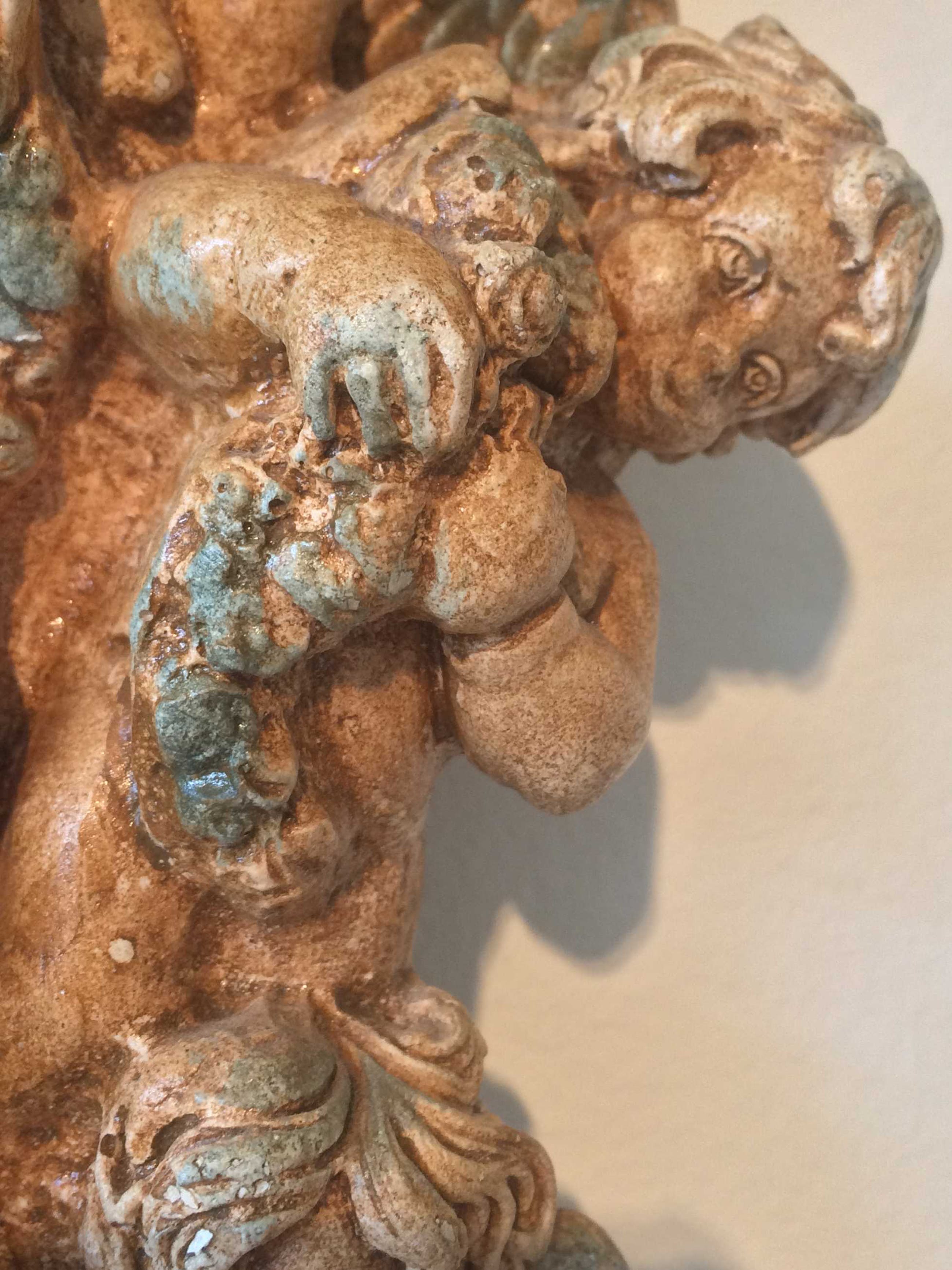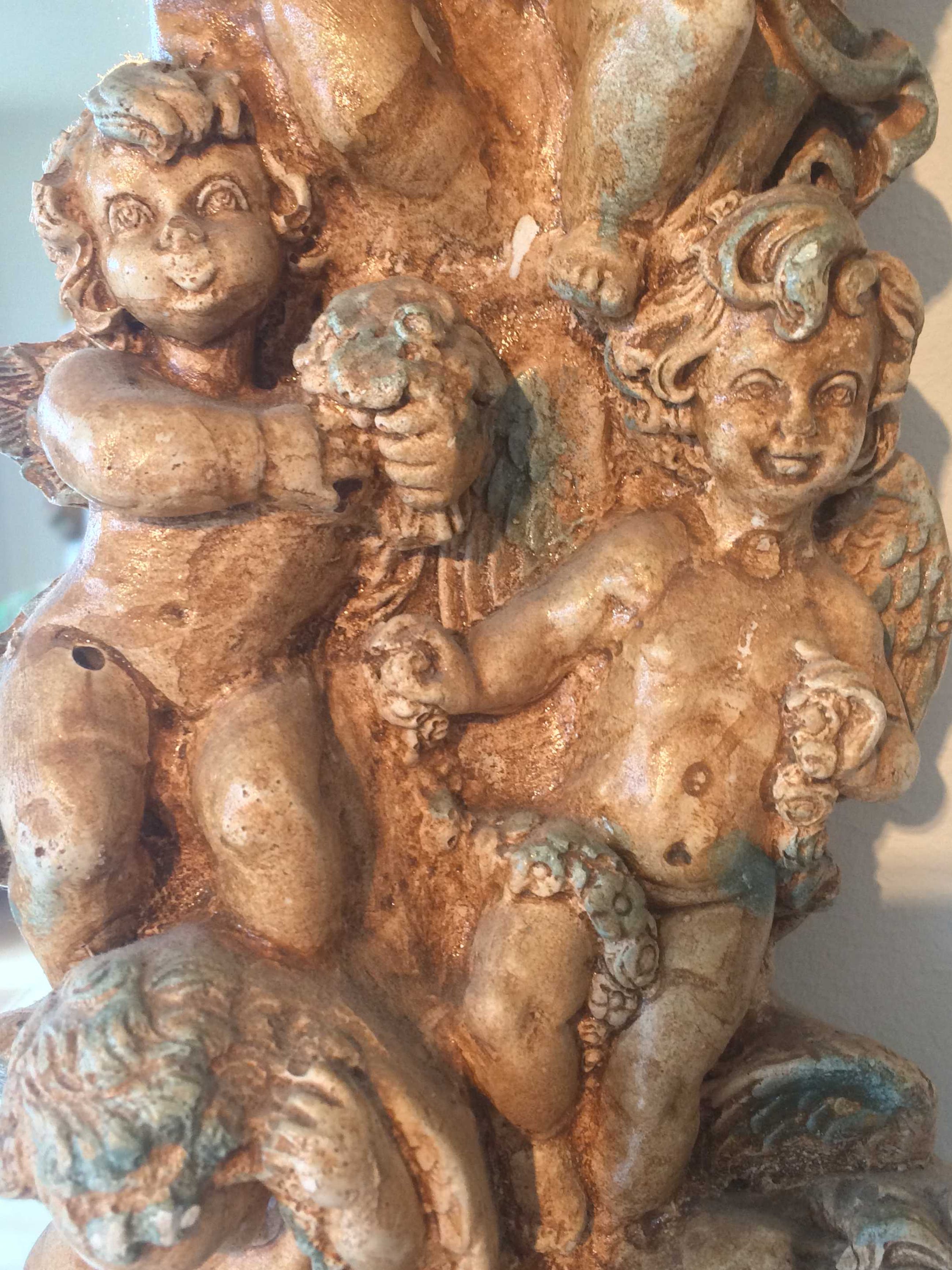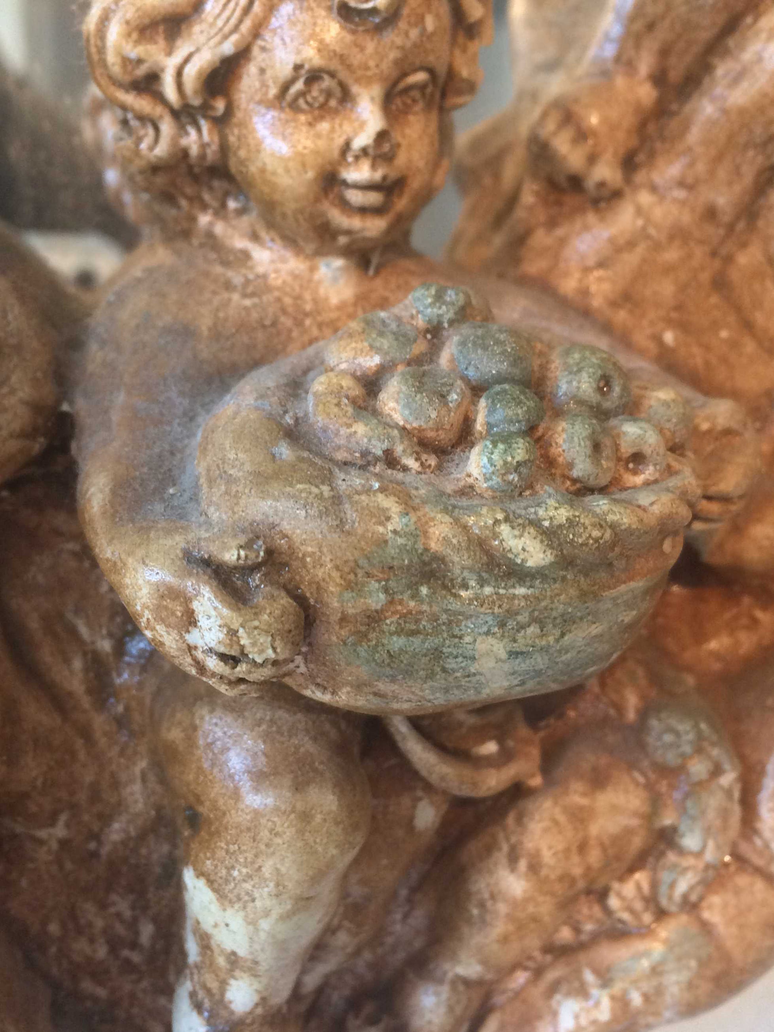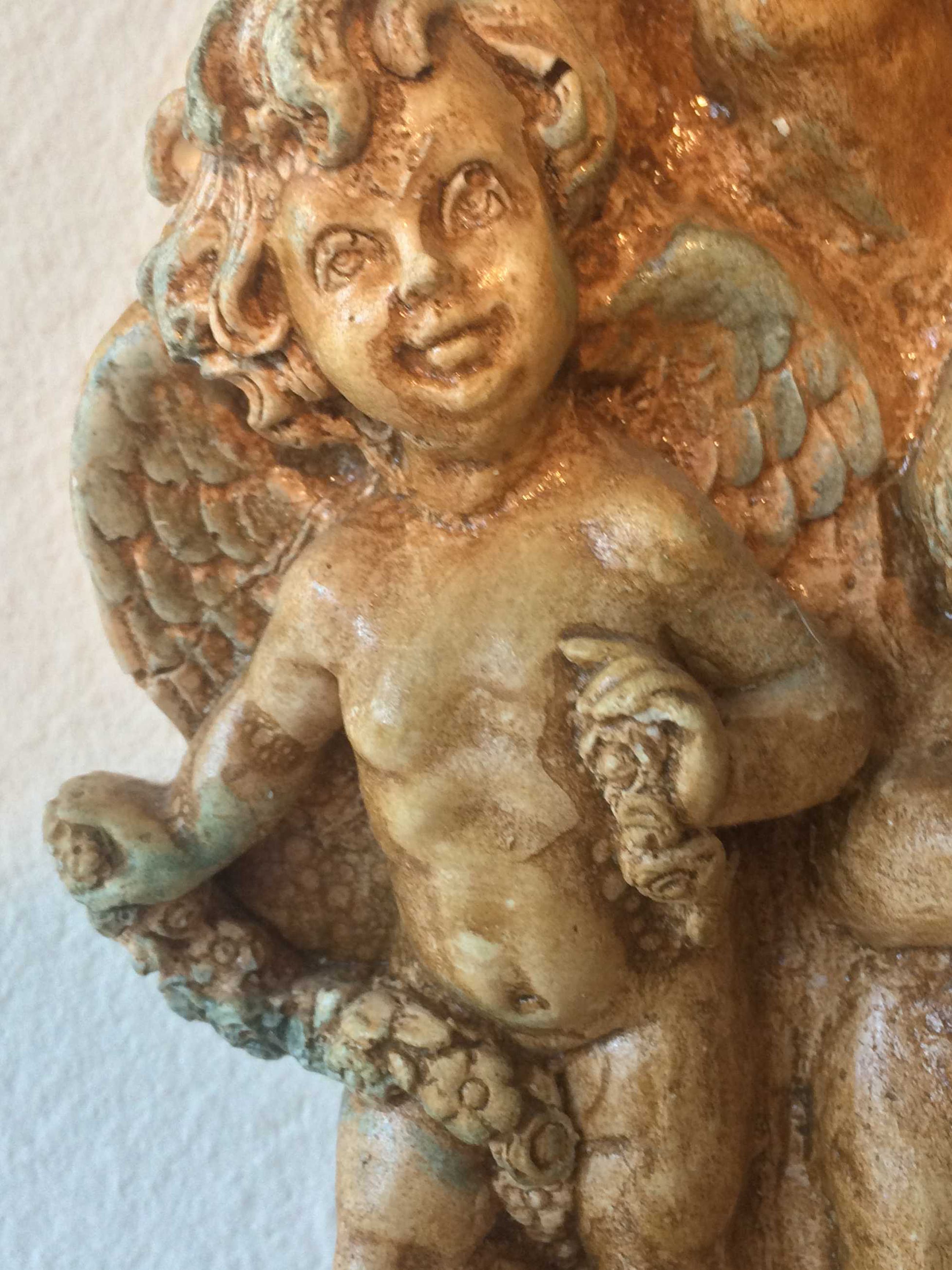 Een unieke handgemaakte spiegel,geen enkele cherub is het zelfde gemaakt. Zit een mooie patina laag op,De spiegel is vervangen (zie foto achterkant)