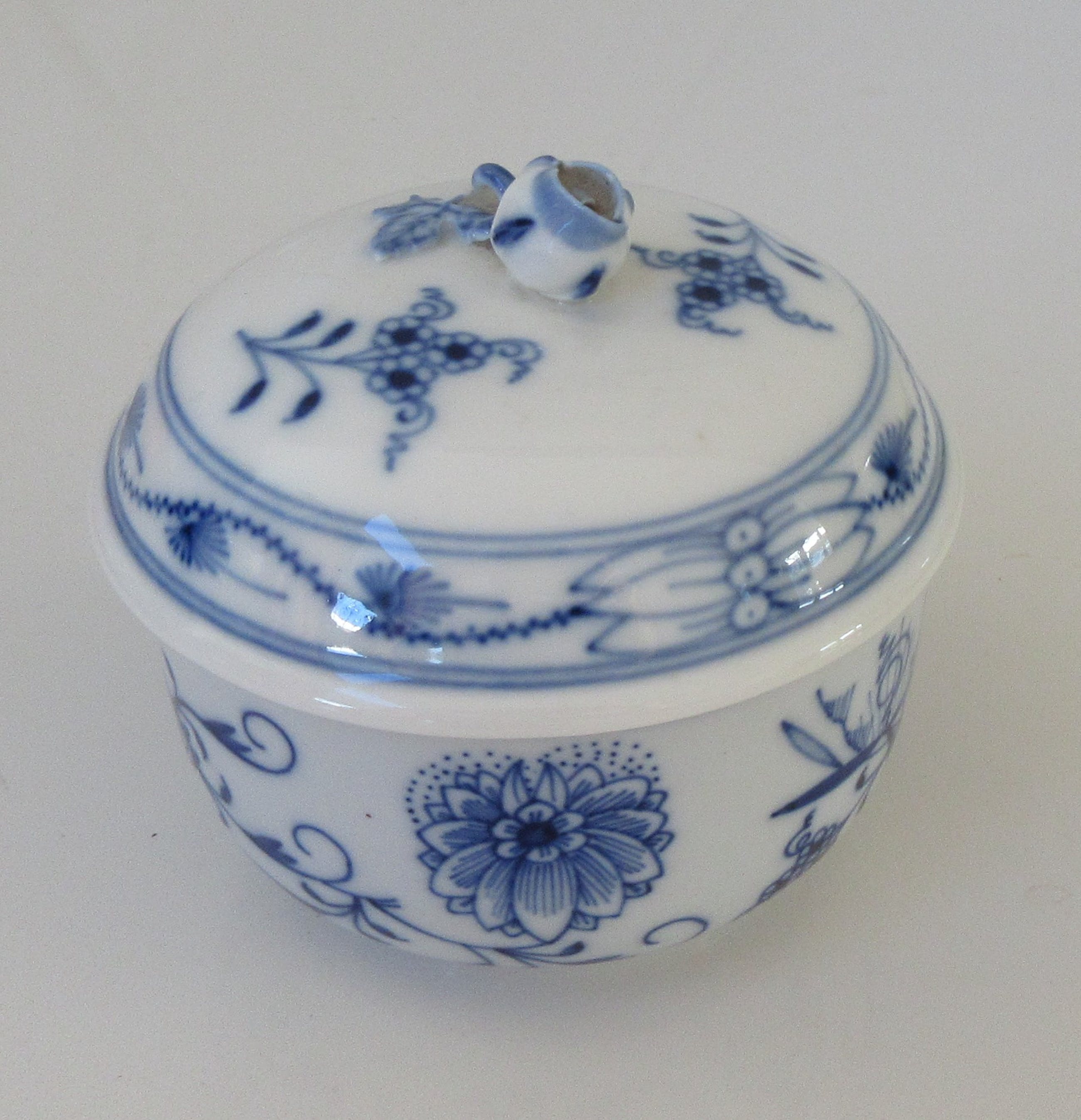 Suikerpot met deksel in het beroemde blauw witte Zwiebelmuster decor - 1e keus. In onbeschadigde conditie. Gemerkt aan de onderzijde met het bekende merk van de gekruiste zwaarden.