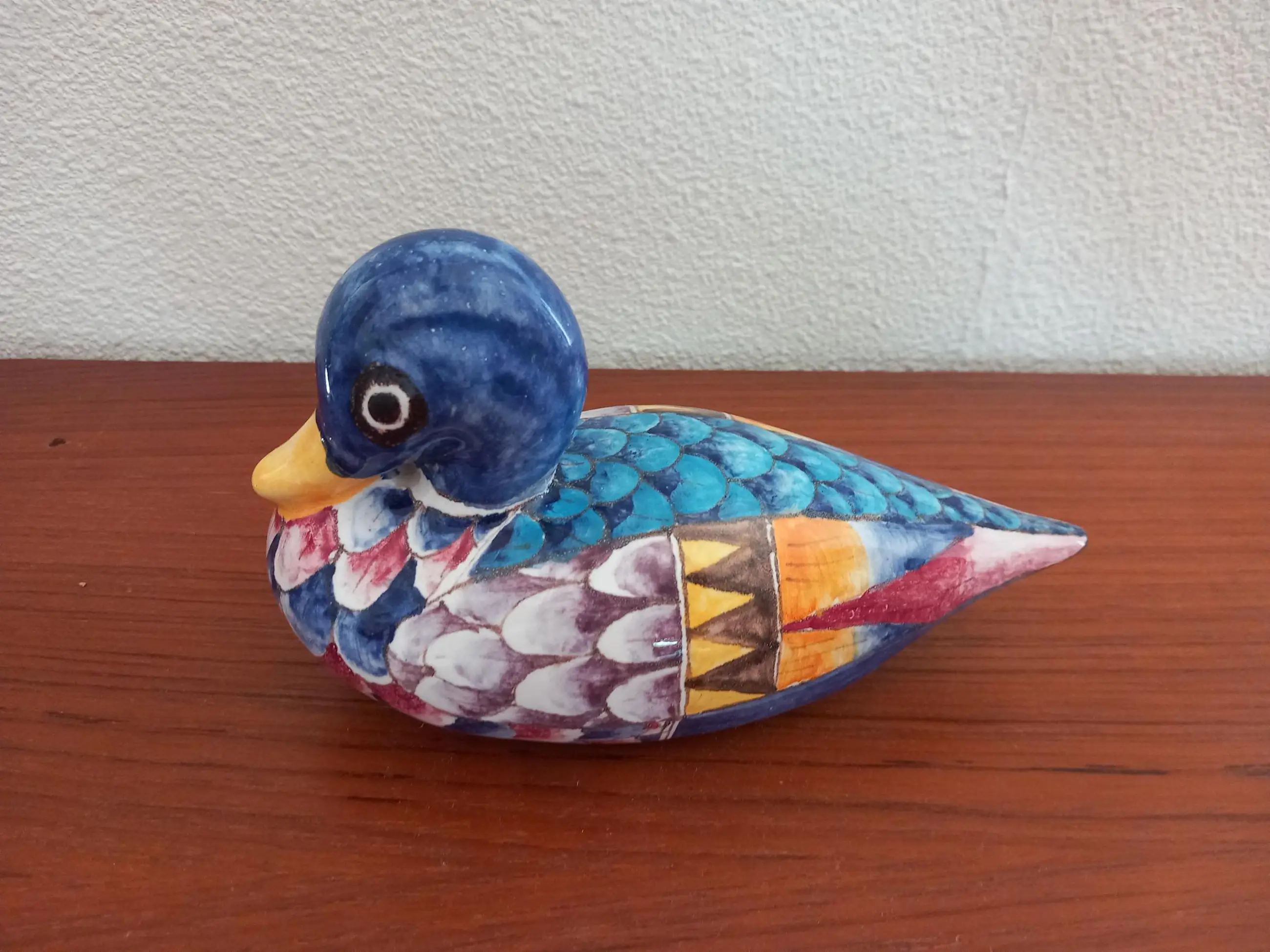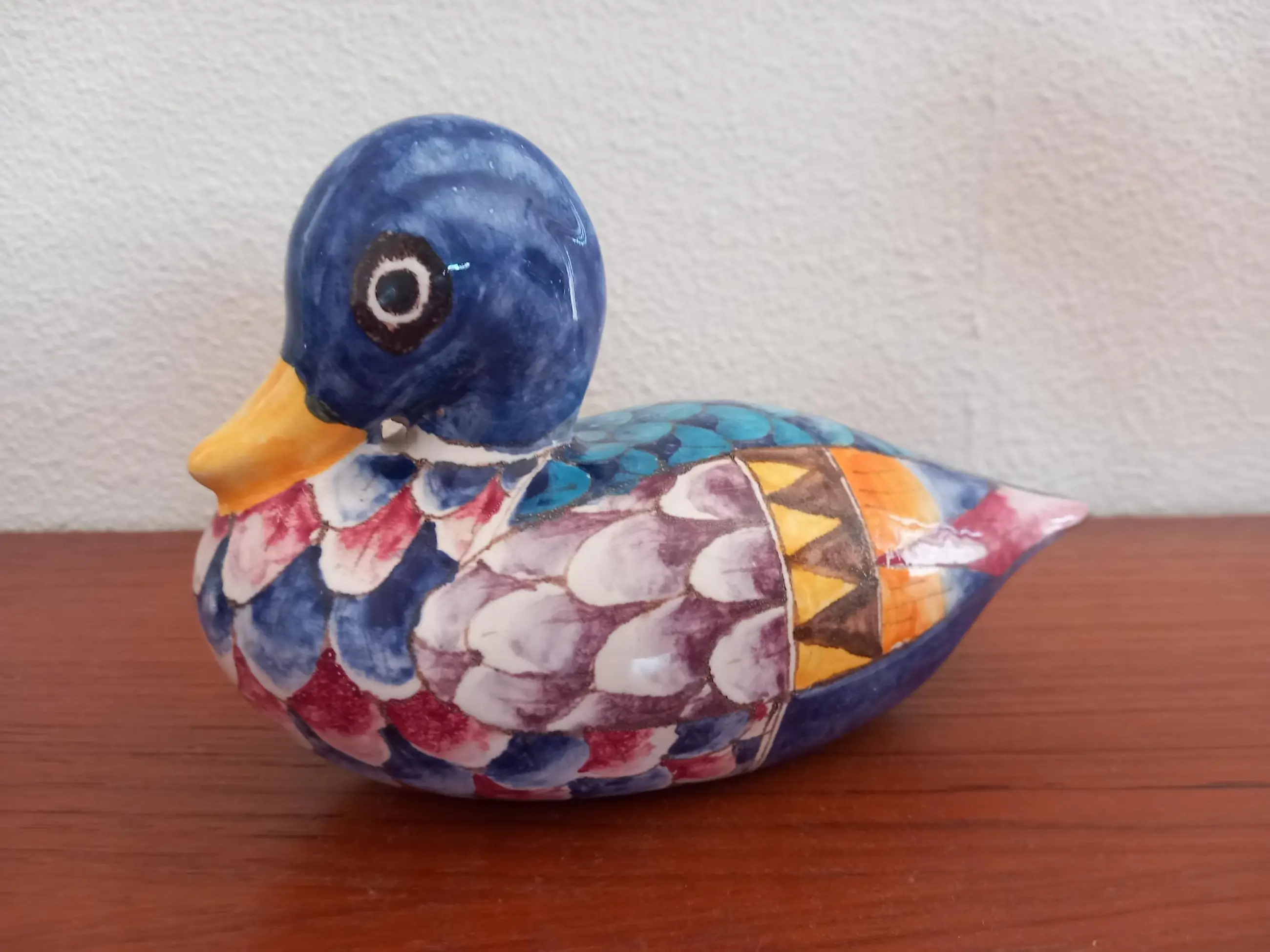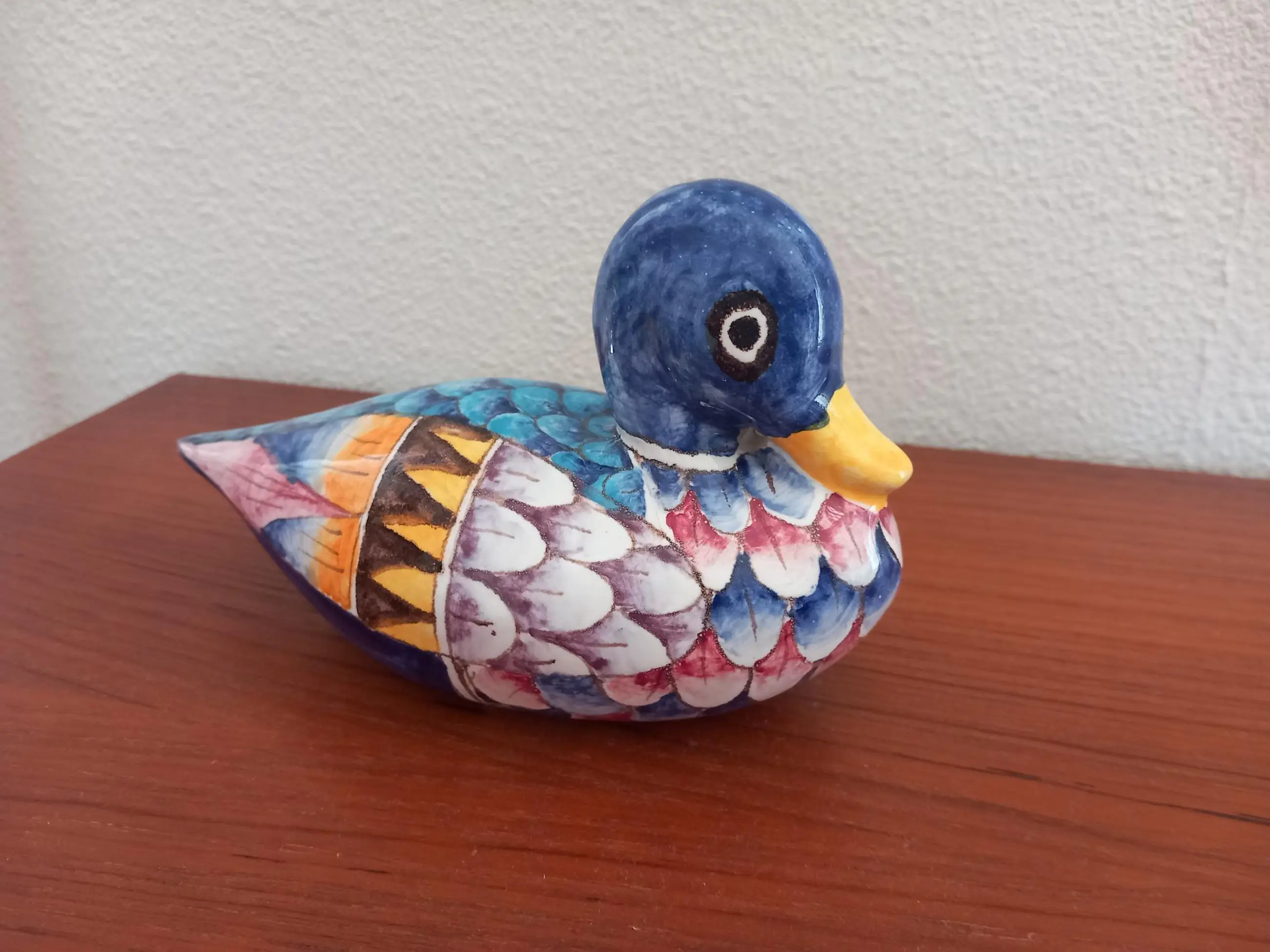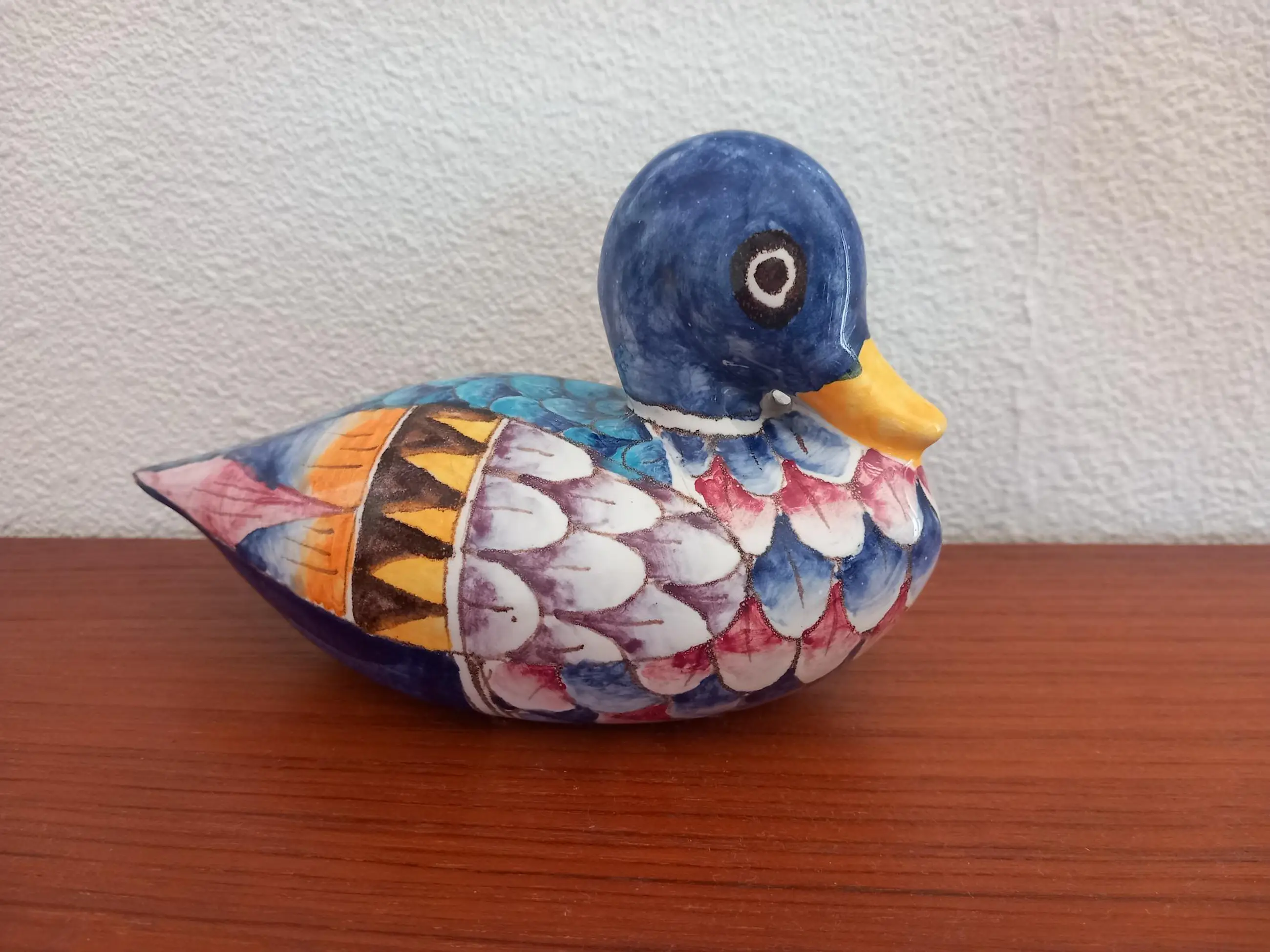 Dit prachtige, kleurrijke beeldje van een eend is in Italië gemaakt door Pottenbakkerij Melior in Sesto Fiorentino, een buitenwijk van Florence. De ingewikkelde details en levendige handgeschilderde afwerking maken het tot een uniek kunstwerk dat elke ruimte zal opfleuren. Het stuk is gemaakt van hoogwaardig keramiek en is vervaardigd met behulp van traditionele aardewerktechnieken. Het is een must-have voor liefhebbers van Italiaanse keramische kunstwerken uit de jaren ’60 en brengt een vleugje natuurlijke elegantie in huis.