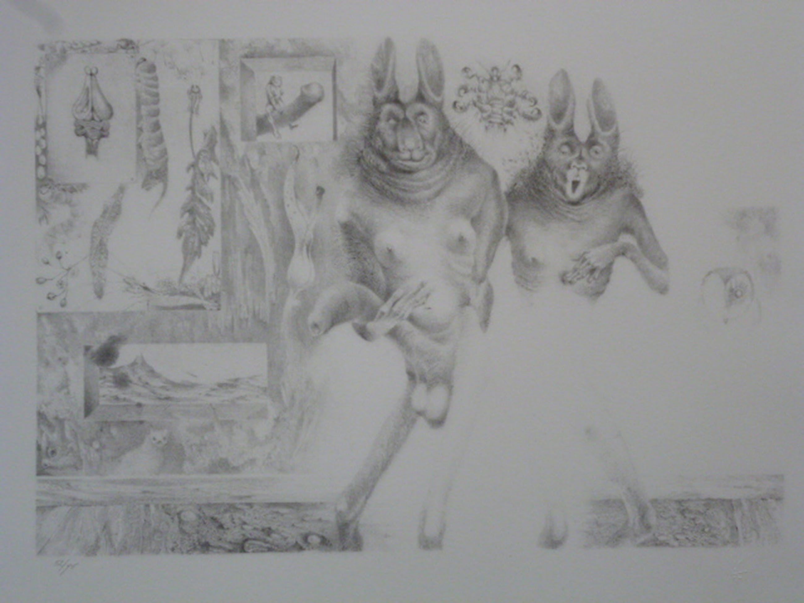 Litho met dierfiguren in een erotische surrealistische voorstelling. Gesigneerd met blindstempel rechtsonder. Genummerd 52/75 linksonder.