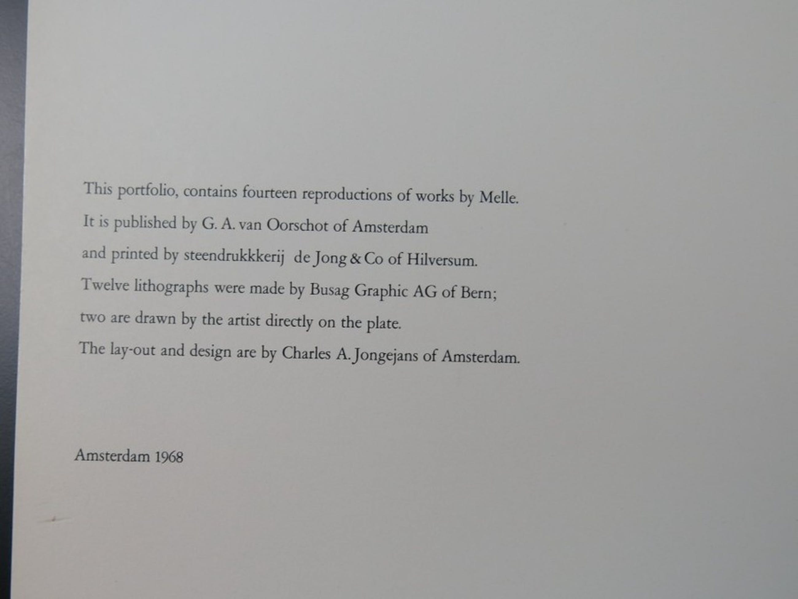 Portfolio met 14 fotolitho's van werken van Melle. Uitgegeven door G.A. van Oorschot te Amsterdam en gedrukt door Steendrukkerij de Jong & Co te Hilversum. 12 litho's zijn gemaakt door Busag Graphic AG te Bern en 2 zijn door de kunstenaar direct op de steen getekend. Lay-out en design door Charles A. Jongejans te Amsterdam.