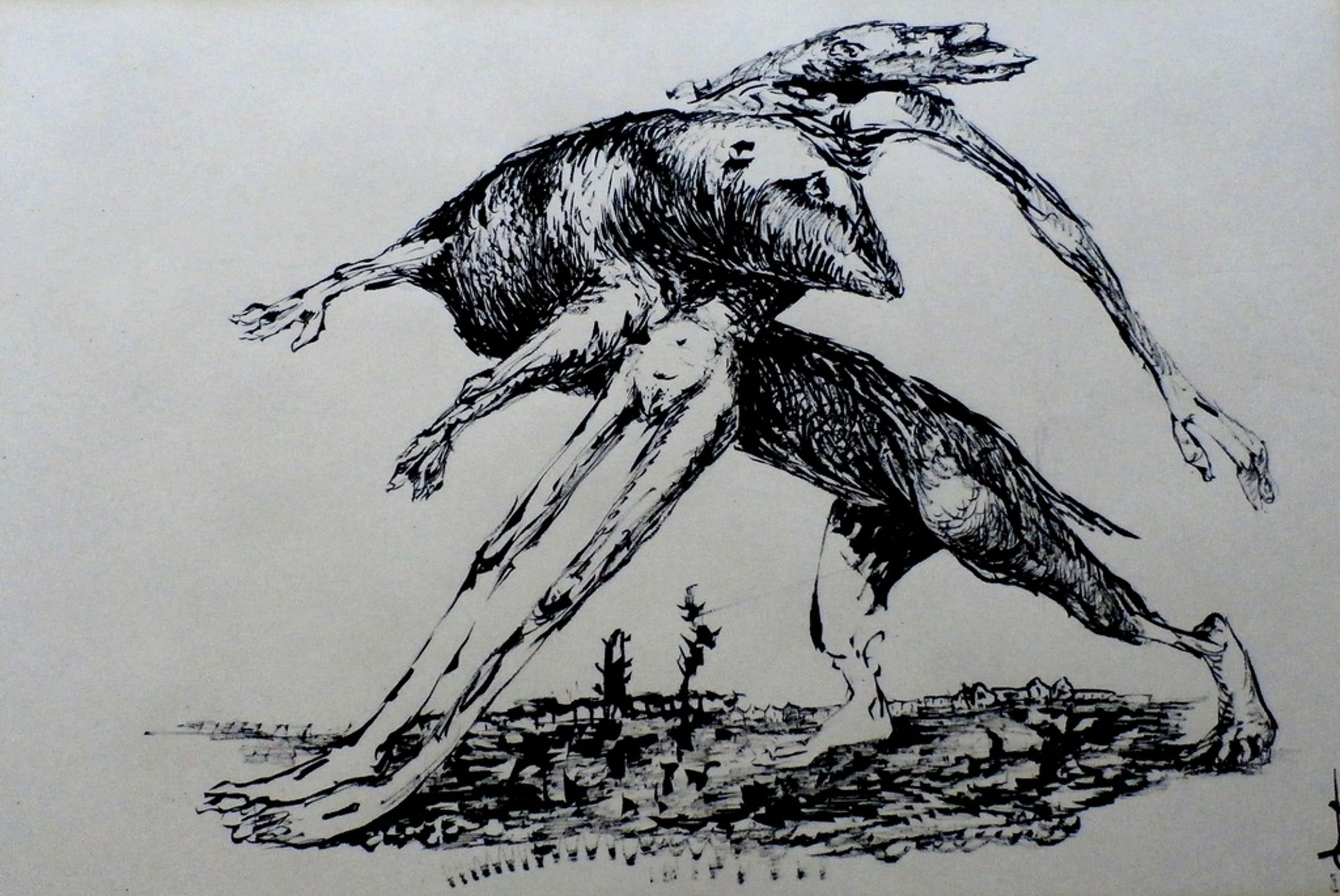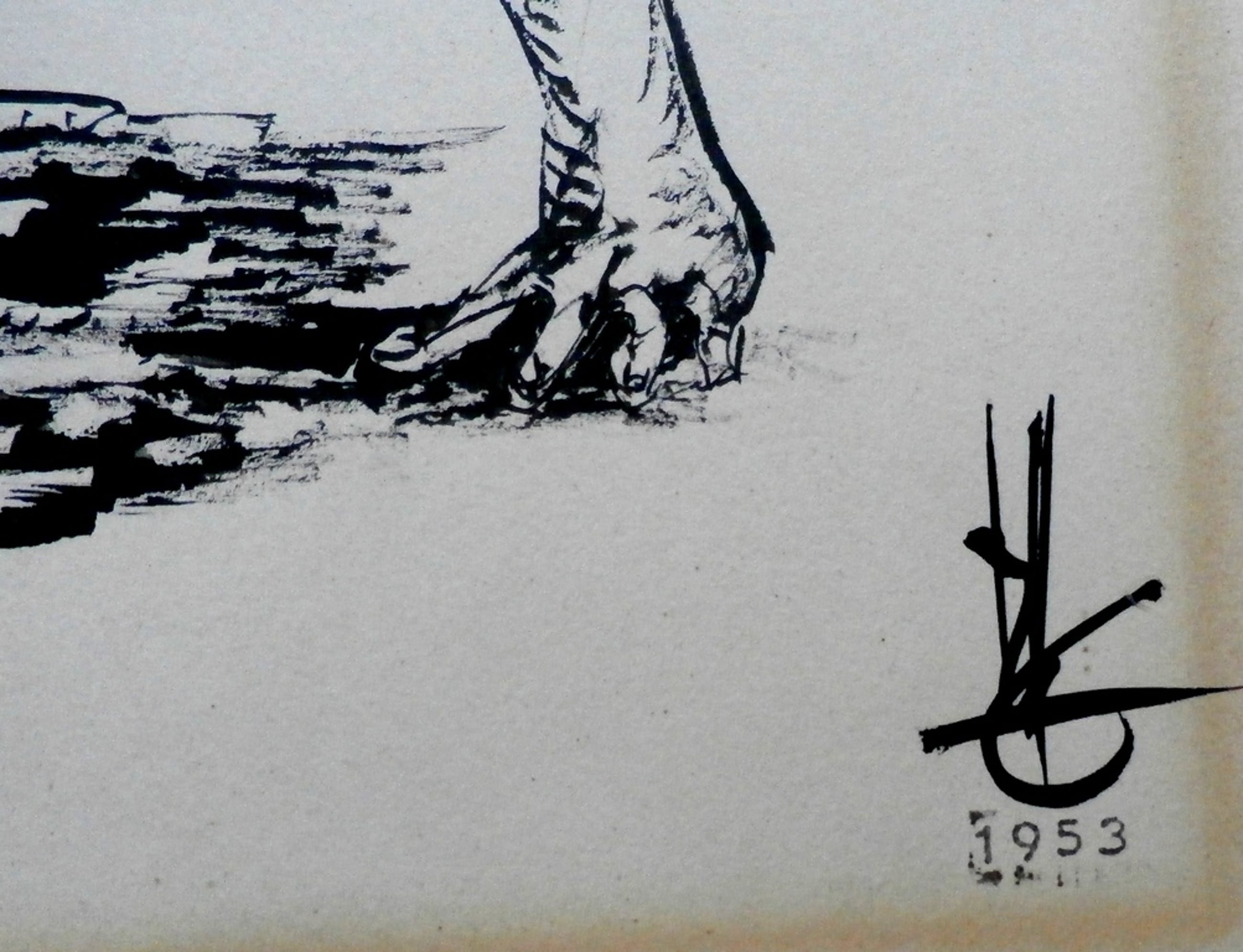 Mooie inkttekening van Melle oldeboerrichter. Jaar: 1953. Titel: vechtende surrealistisch figuren. Afmetingen: H32 x b47 cm. Het werk is rechtsonder door de kunstenaar gesigneerd.