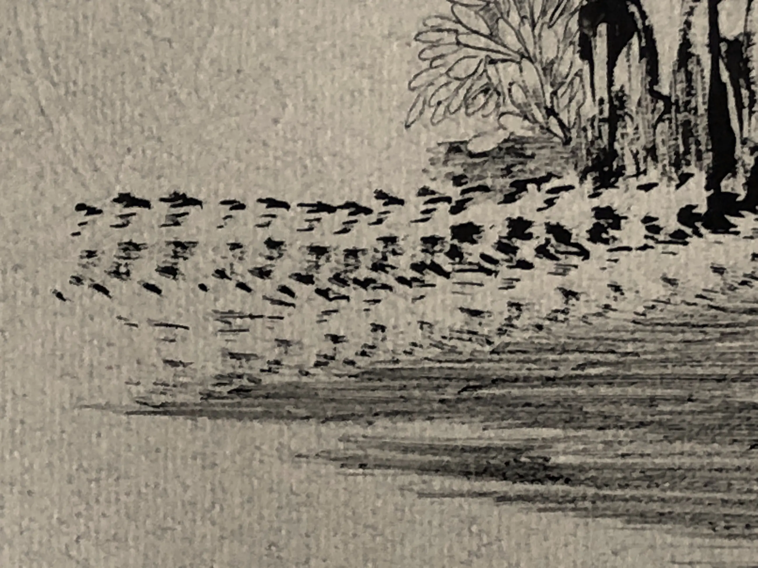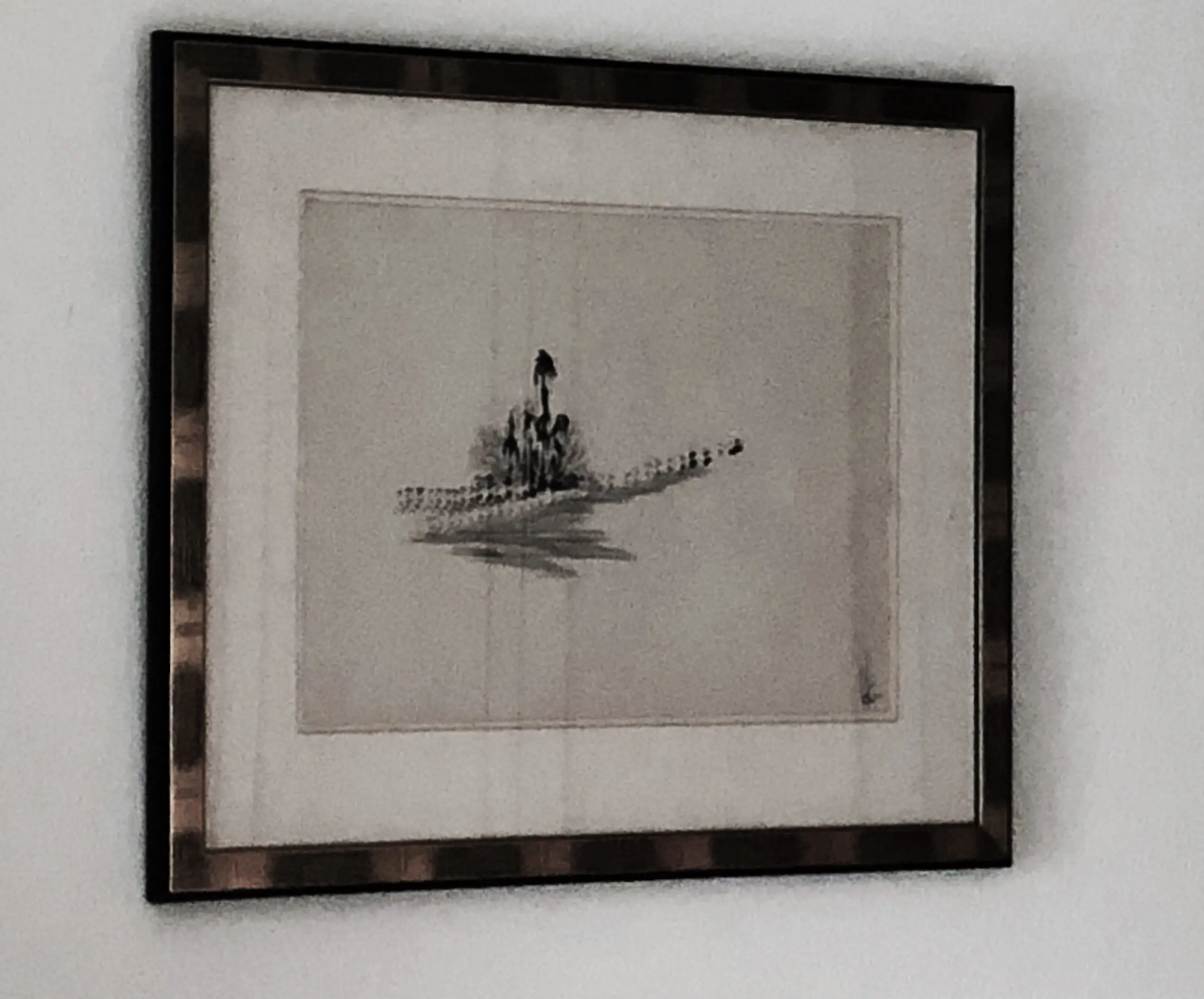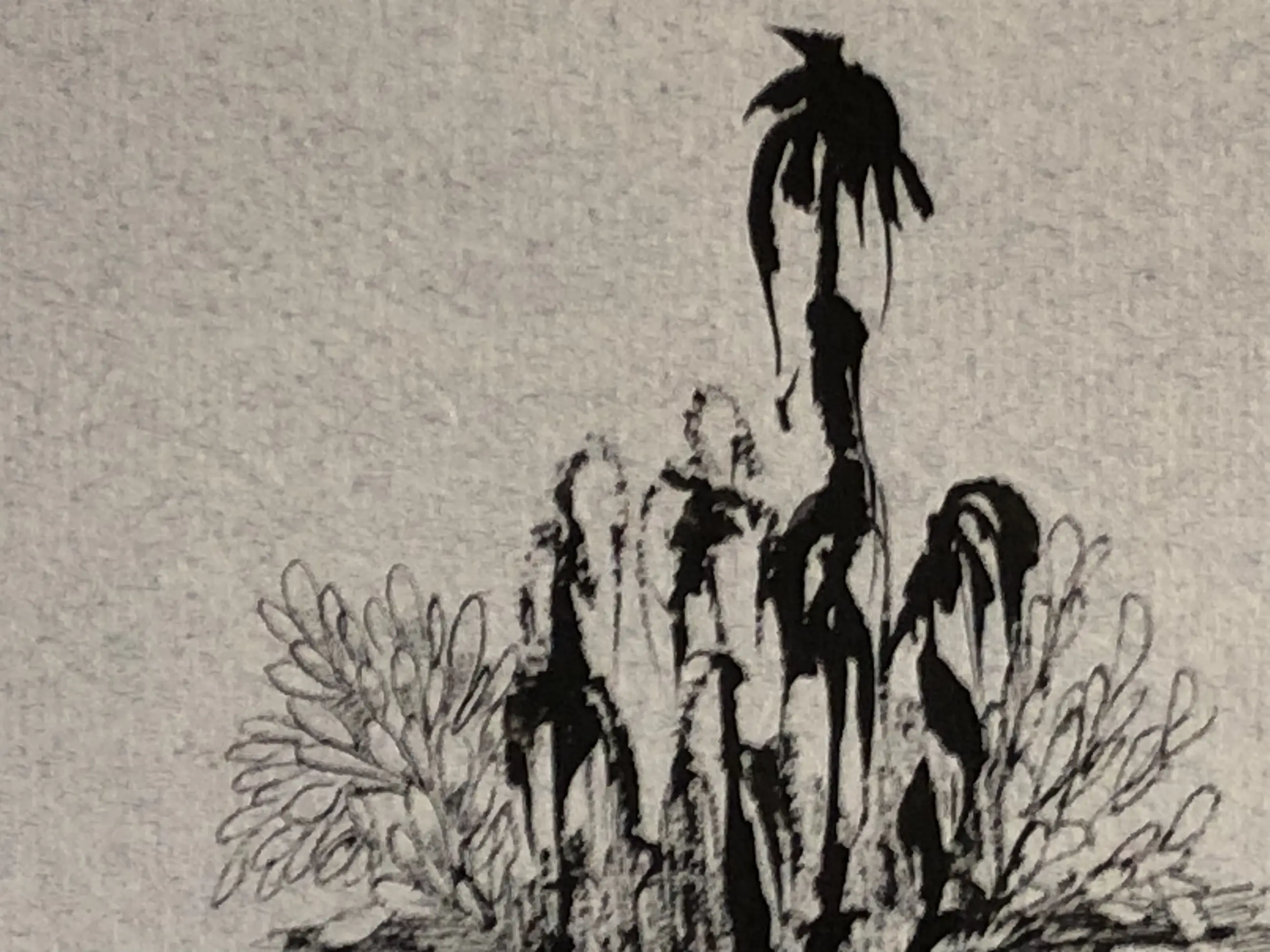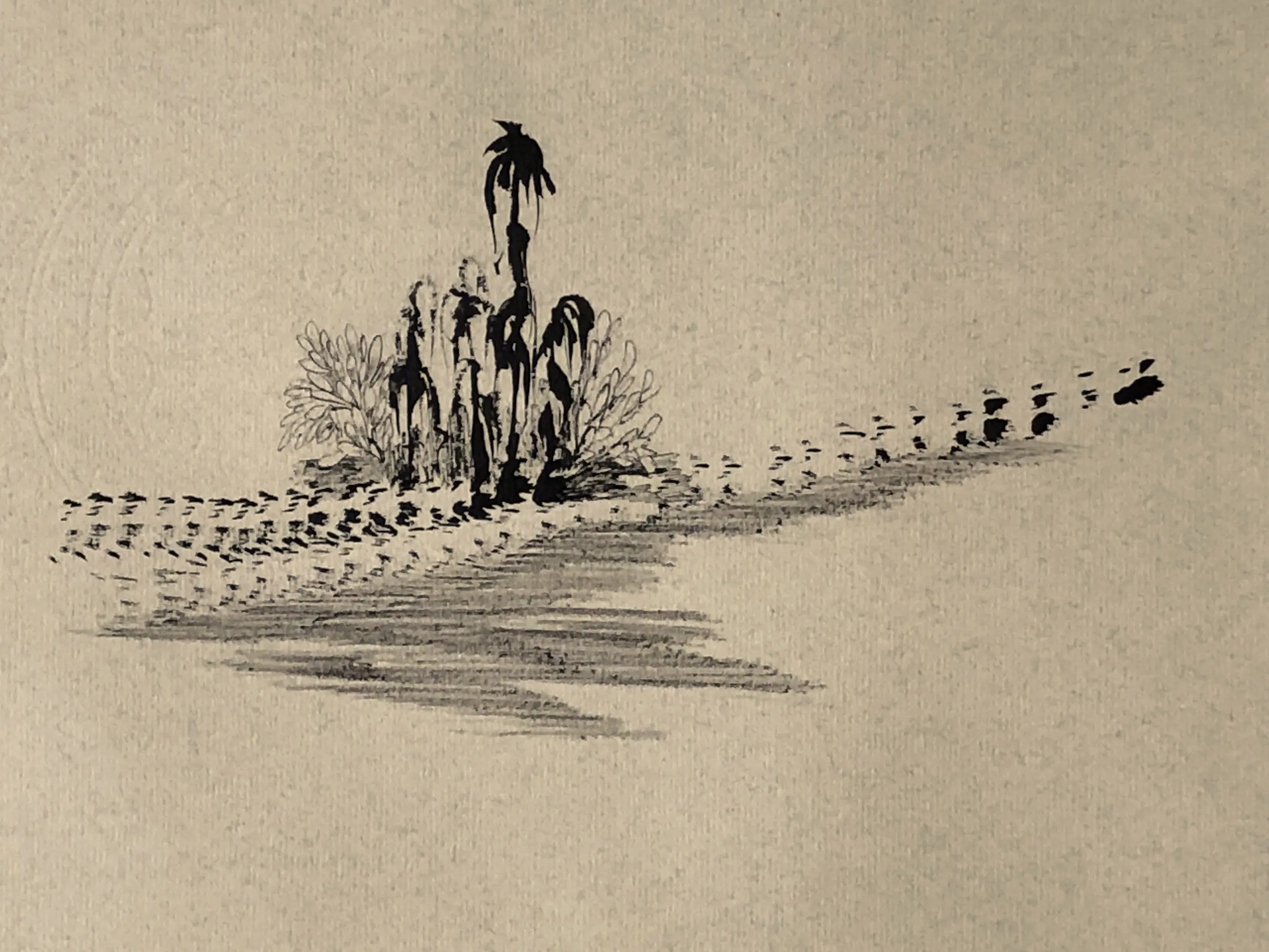 “Grote loopvogels die rusten bij een kleine oase”. Ieder mag zelf de betekenis van deze droom- of fantasievoorstelling van Melle bedenken. Inkttekening, te dateren jaren ’50.