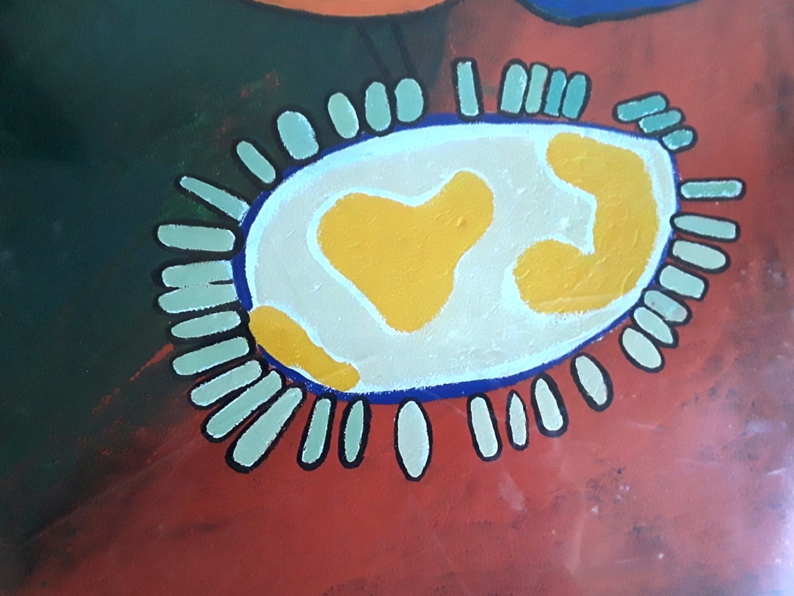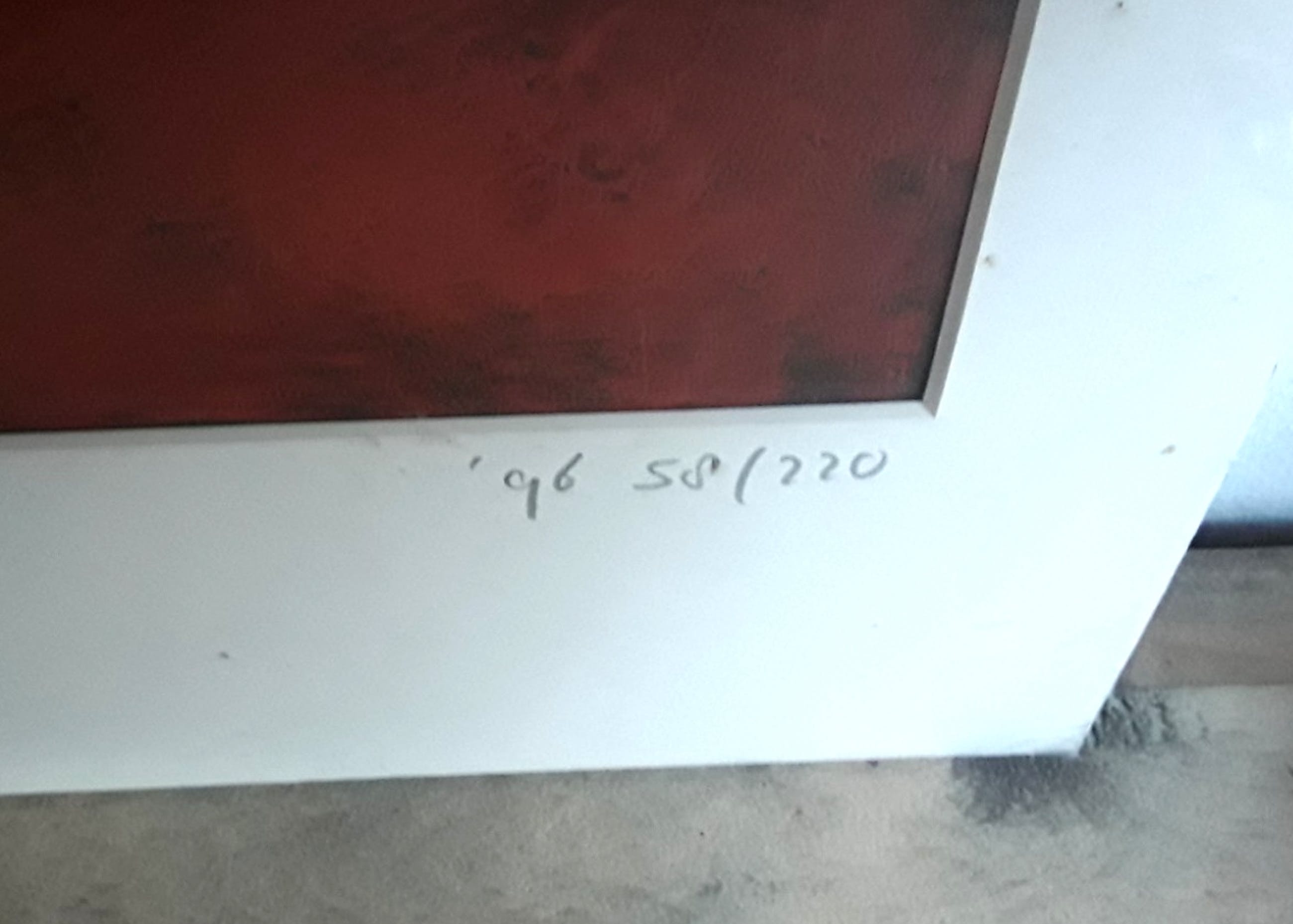 Beetje lastig fotograferen door de folie (schittering en wat fletse kleuren). Kunstwerk geleverd met passe-partout, zonder lijst.