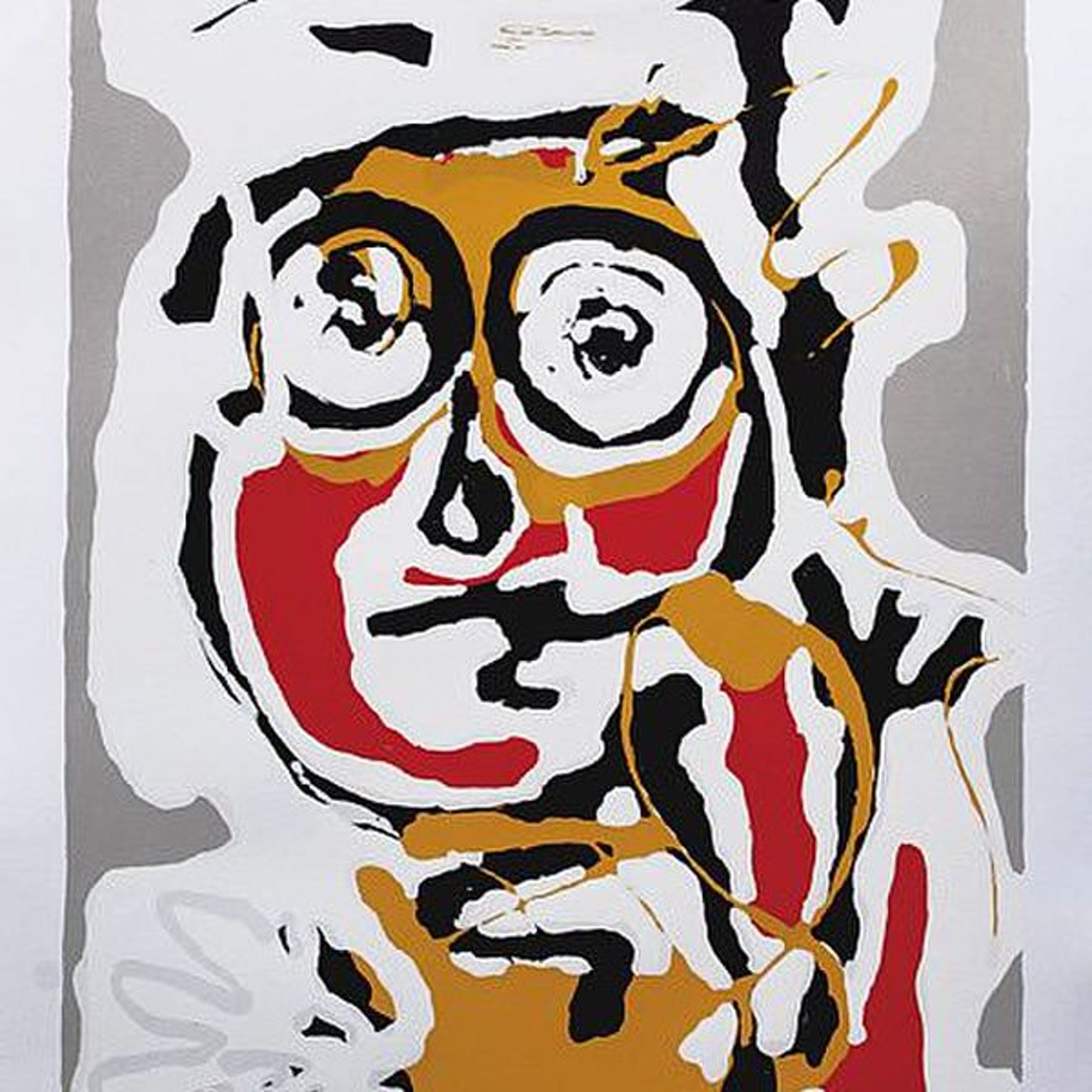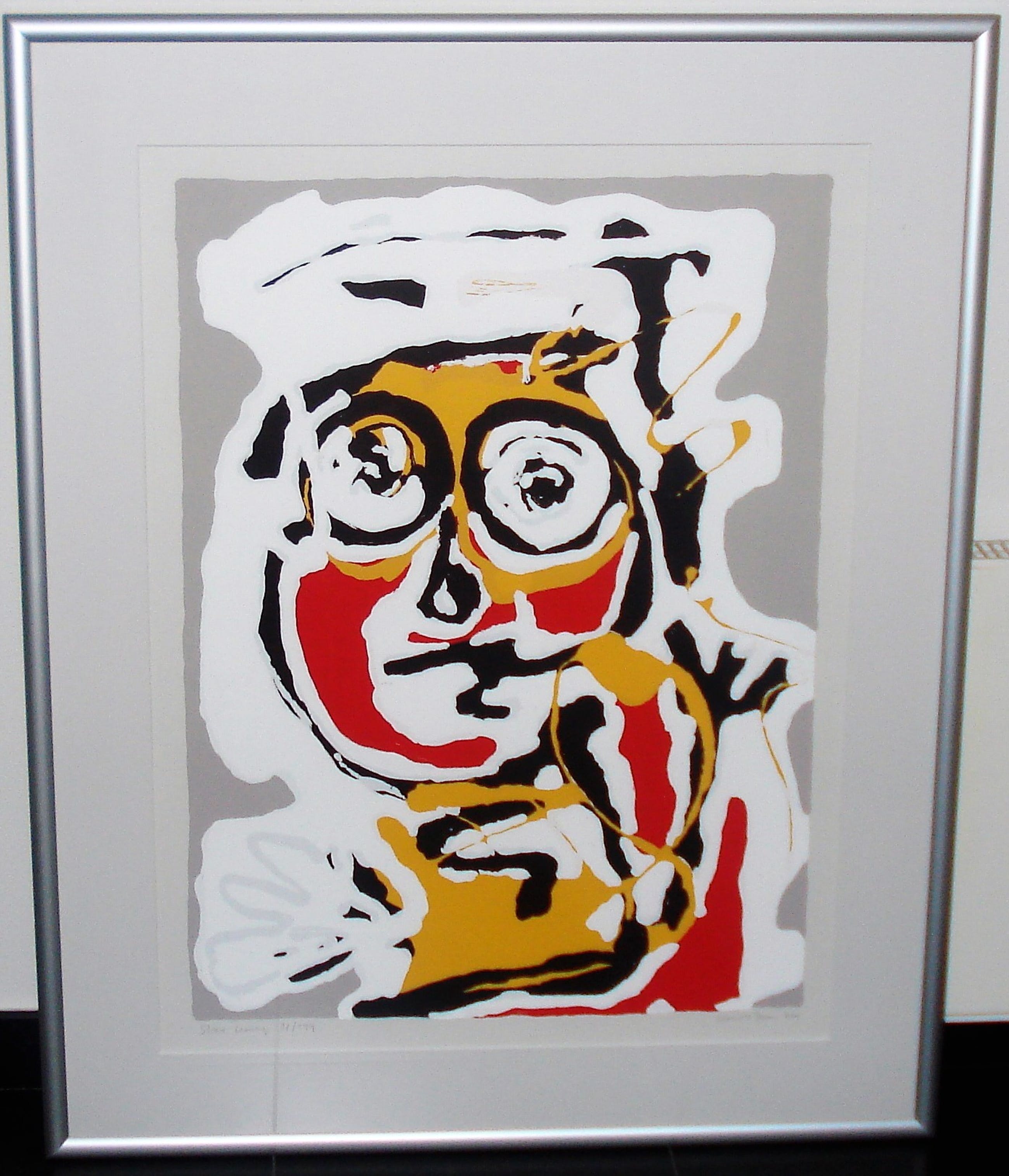 Stoere Koning, grote zeefdruk van Menno Baars Gelijst in strakke aluminium lijst en passepartout Baars' werken lokken verschillende reacties uit, mar de mooiste is nog wel: 'Karel Appel is dood, de nieuwe meester is Baars.... Hij is springlevend'.