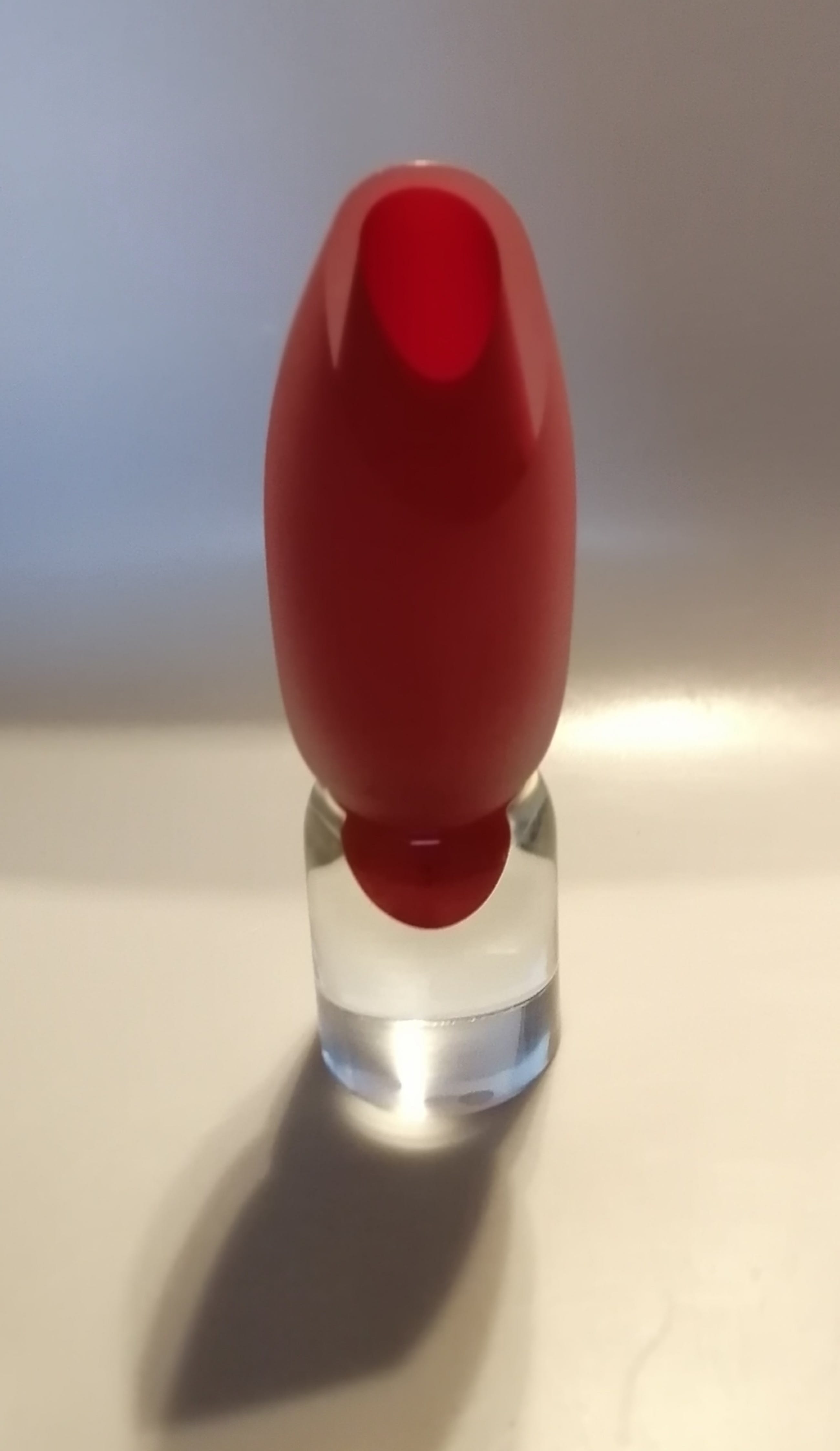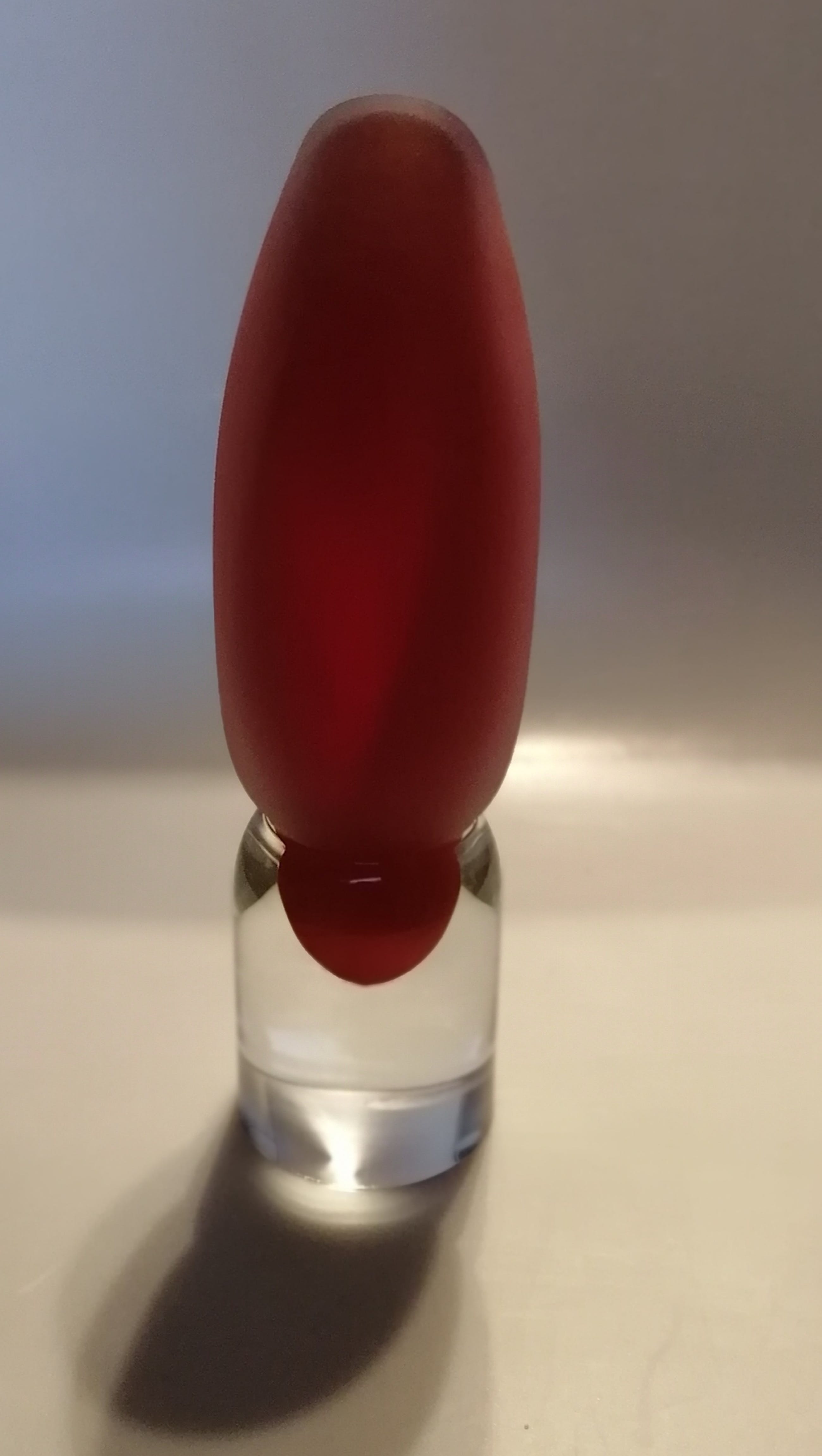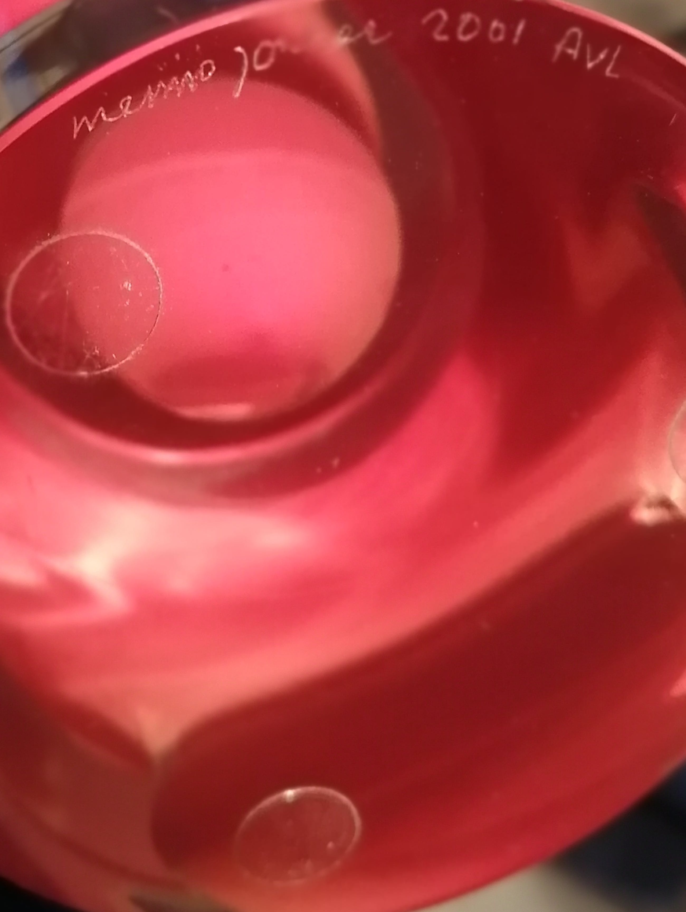 Uiterst fraai glasobject van Menno Jonker uit 2001, geblazen bij de glasblazerij van Nationaal Glasmuseum Leerdam door meesterglasblazer Arie van Loopik. Is handgesigneerd