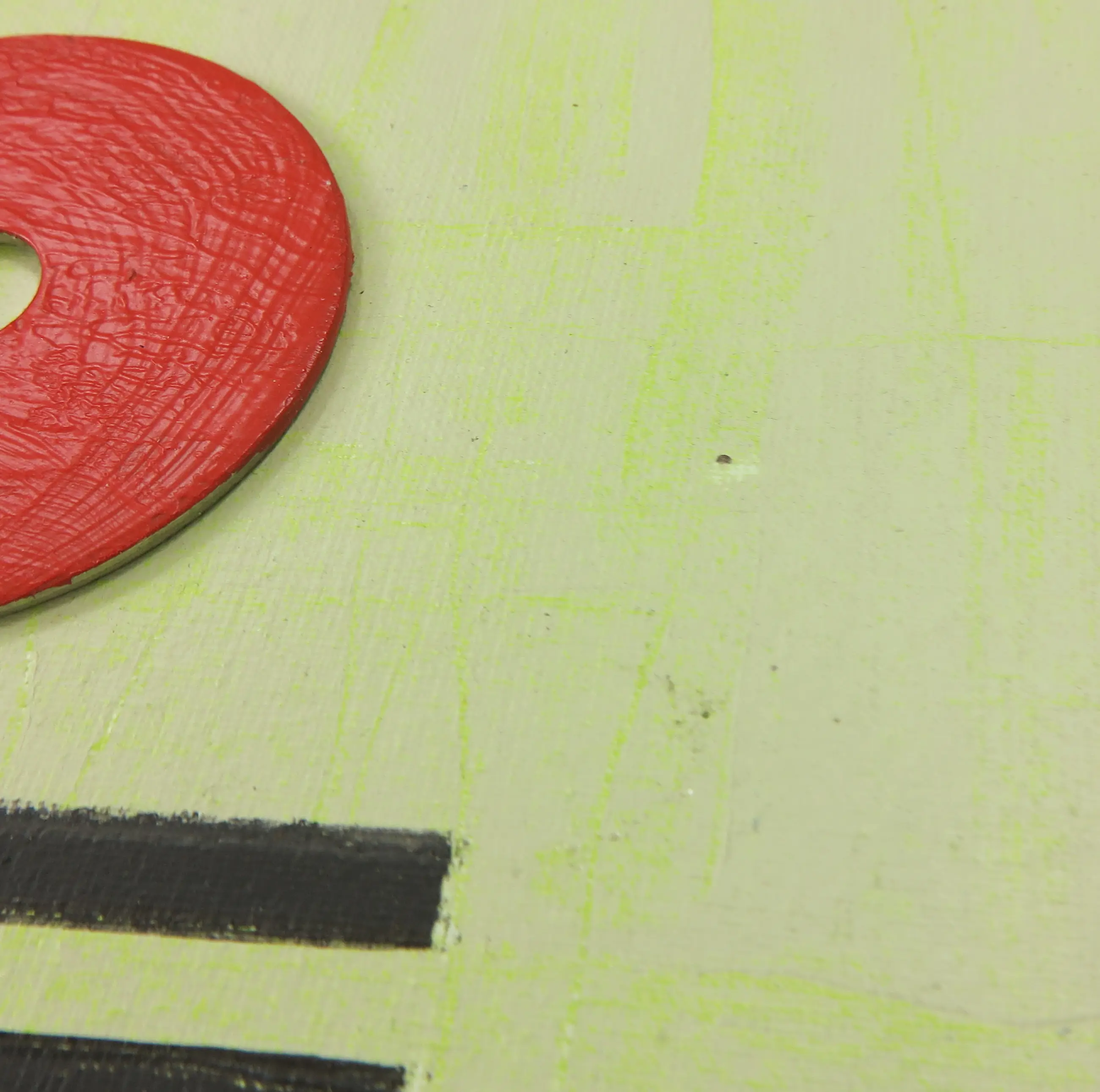 Drie werken in gemengde techniek (verf, stift, metaal) op paneel (midden) en doek van Menno Meijer. Afmetingen betreft het grootste werk.
