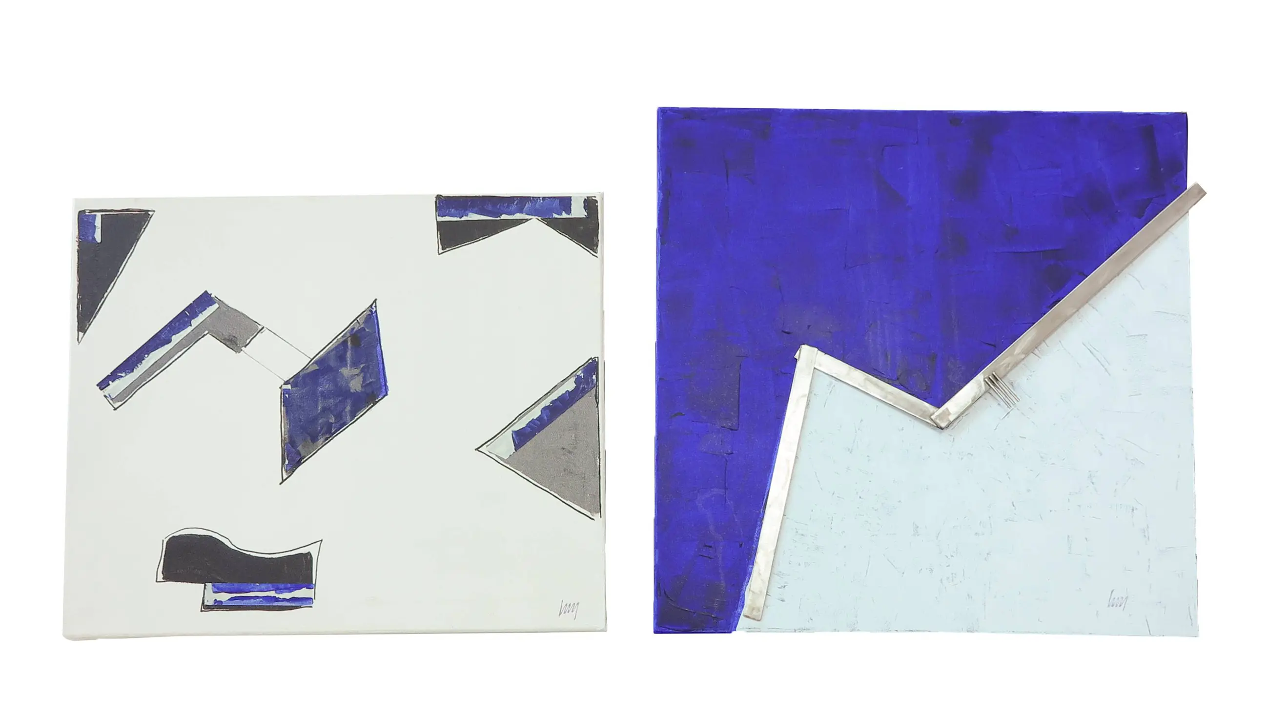 Twee werken in gemengde techniek (verf, stift, metaal) op doek van Menno Meijer. Afmetingen betreft het grootste werk.