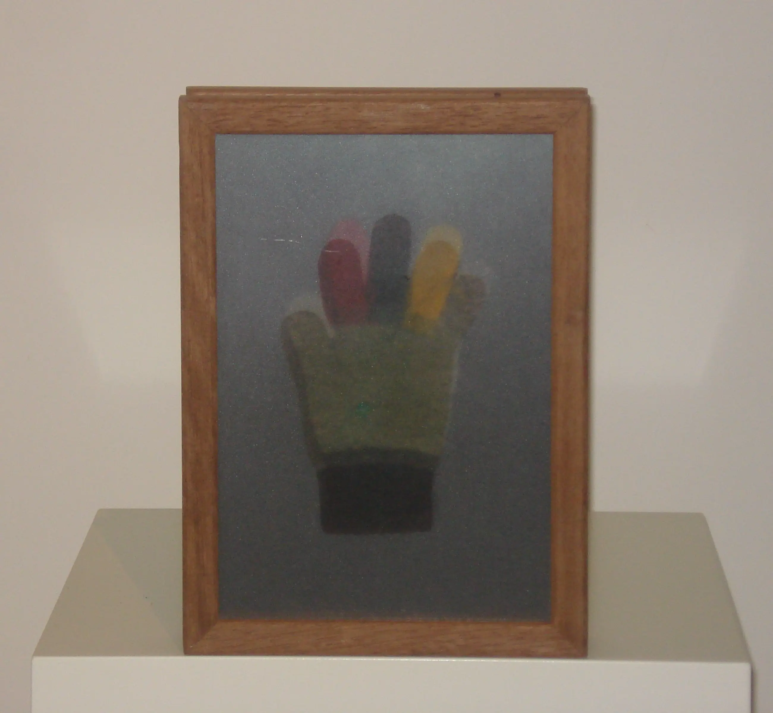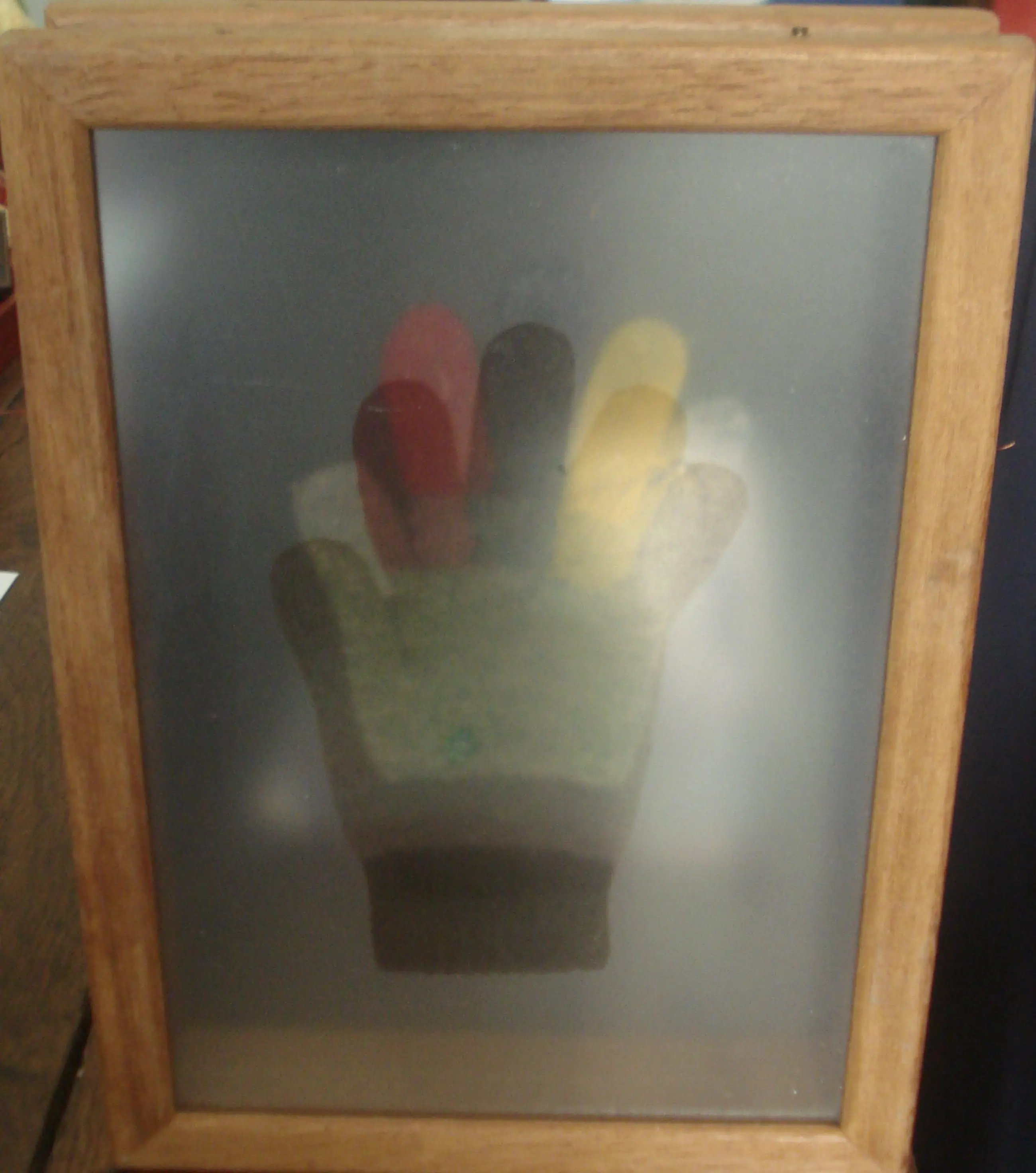 Merbau of meranti 'vitrinekastje' met daarin handschoen in kleuren geel/groen/rood/grijs. Bovenop plexiglas met aan de binnenkant afdruk van handschoen in dezelfde kleuren.
