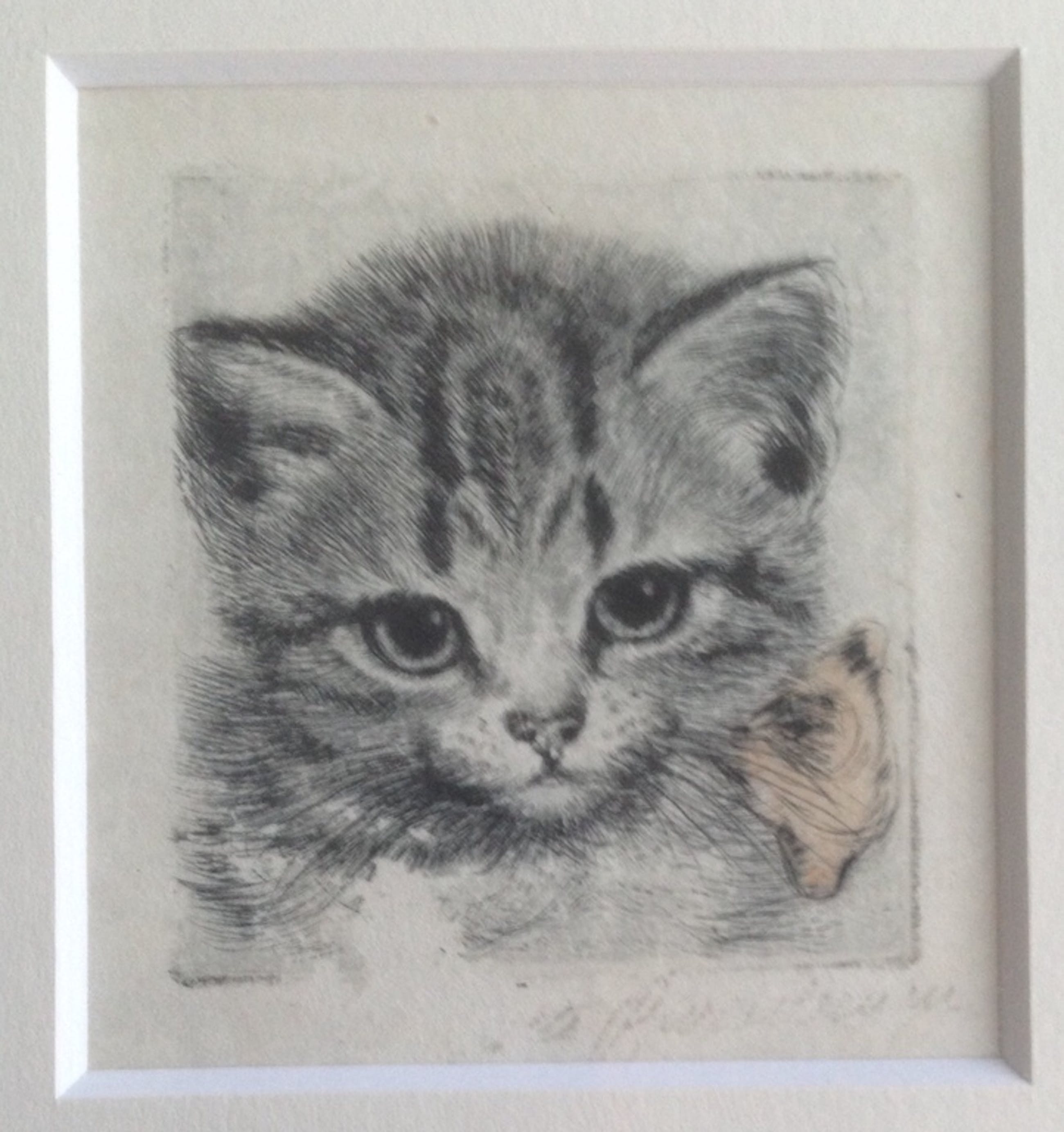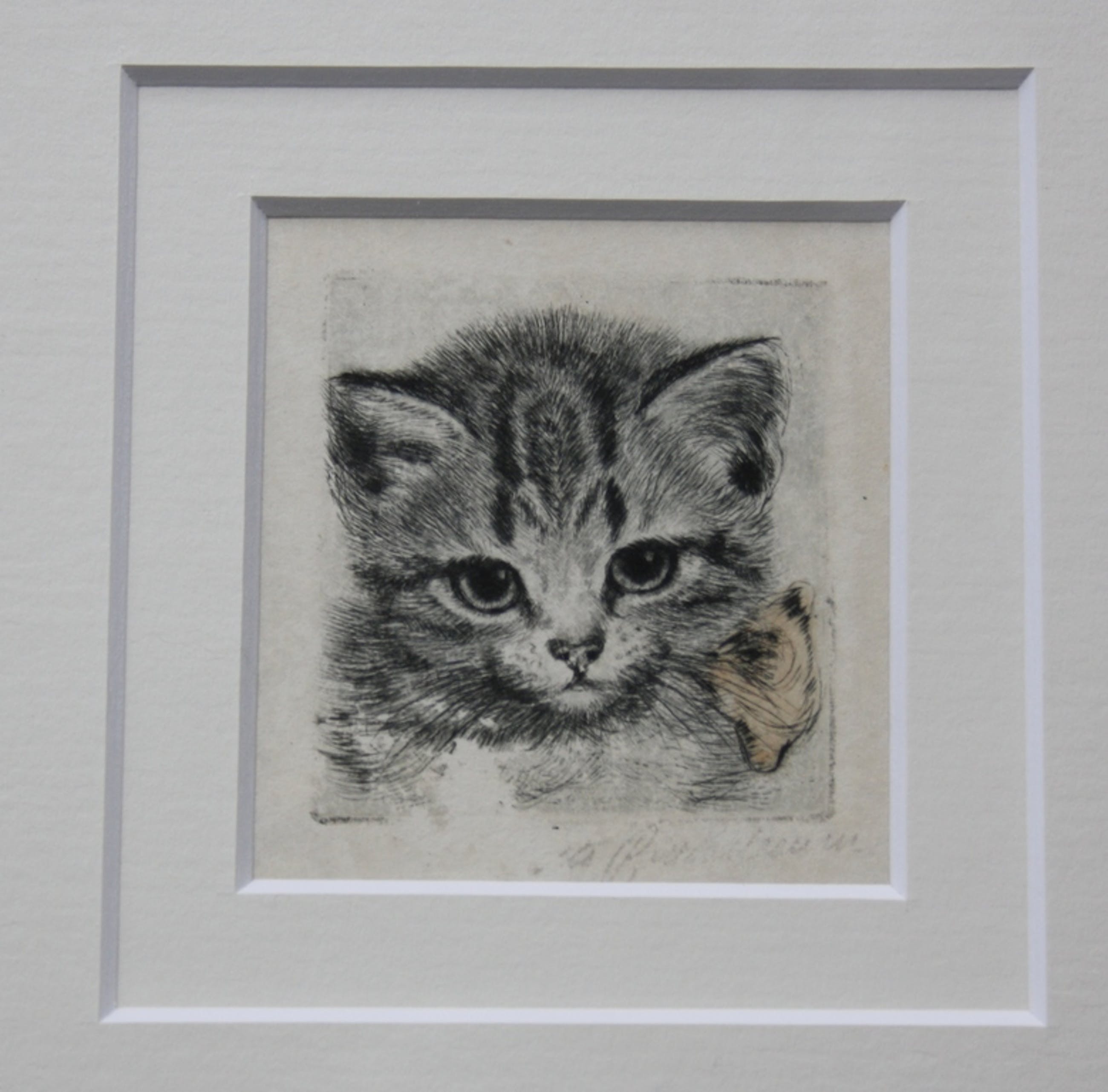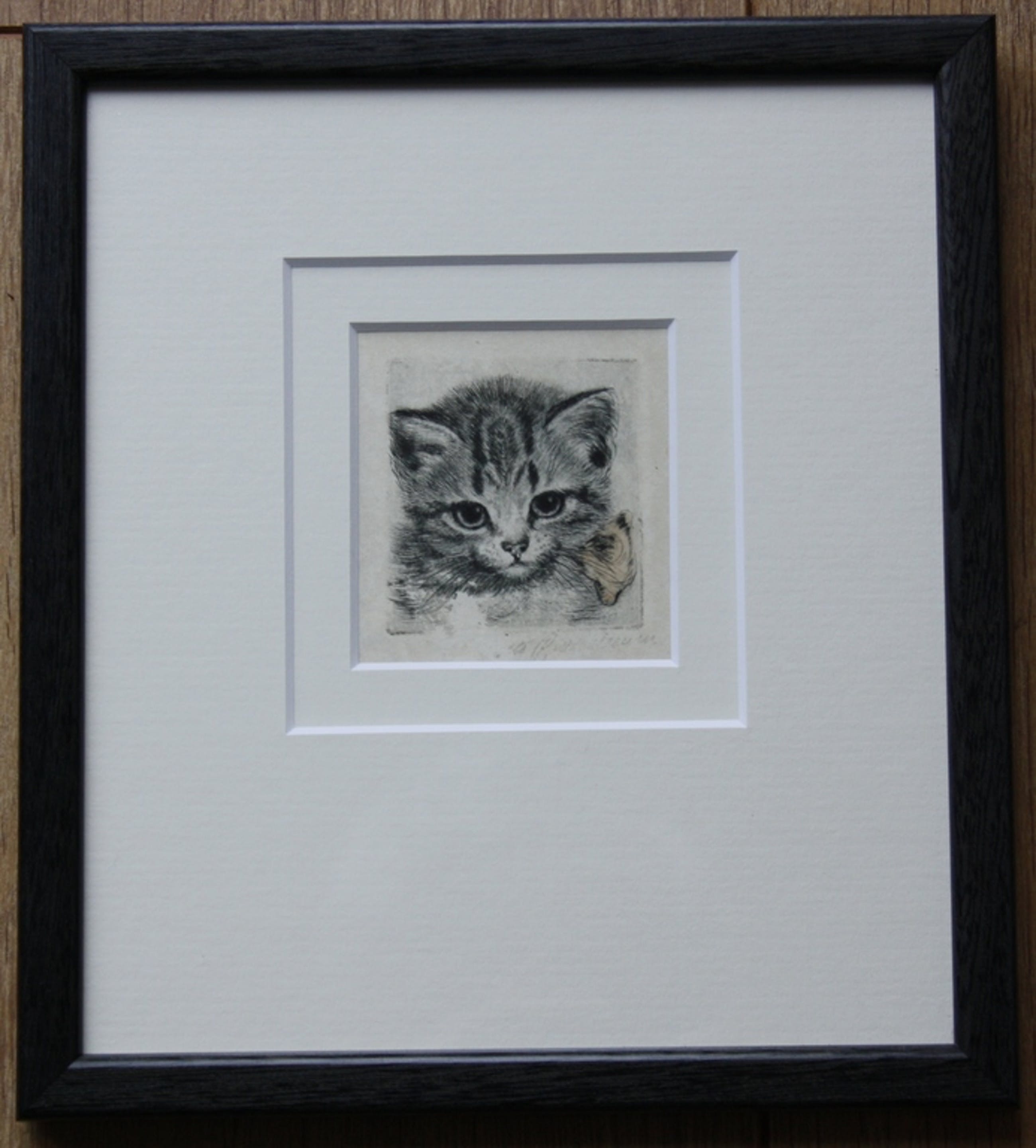 Ets met een voorstelling van een kitten door de bekende Duitse kunstenares Meta Plückebaum. Deze voorstelling is vrij zeldzaam. Beeldmaat 6 cm x 6 cm en bladmaat 12 cm x 15,5 cm. De ets was losbladig, nu zuurvrij in een nieuwe zwart lijst. Met potlood gesigneerd. De ets moest van ver komen (zie foto's), deze was behoorlijk verkleurd door de jaren heen, maar is nu schoongemaakt. Aan de muur!
