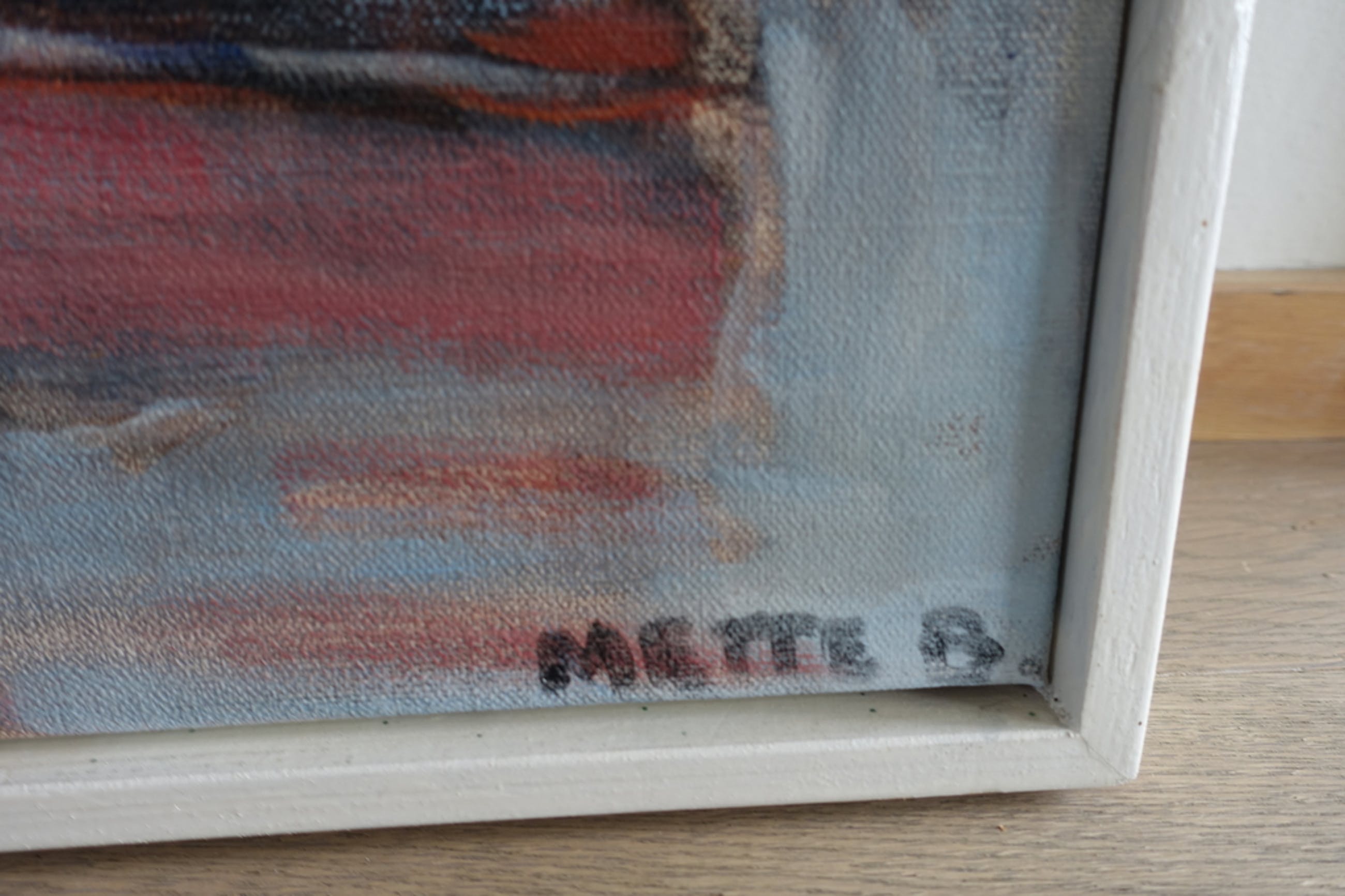 Uniek, fascinerend schilderij van Mette Bauer, 80 x 100 cm, in witte lijst. Rechtstreeks van deze bijzondere kunstenares gekocht door mijn oom. Wegens kleiner wonen nu te koop. Kleurgebruik is schitterend en fris, valt helaas iets weg op deze foto.