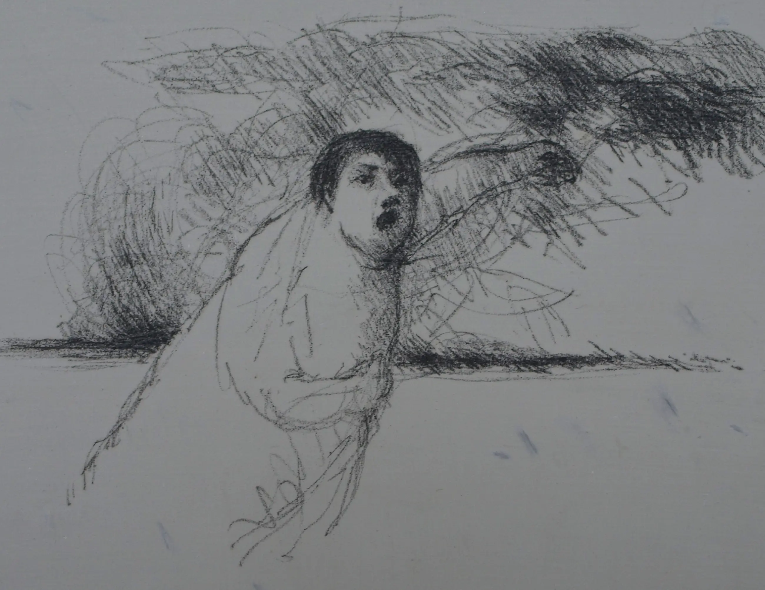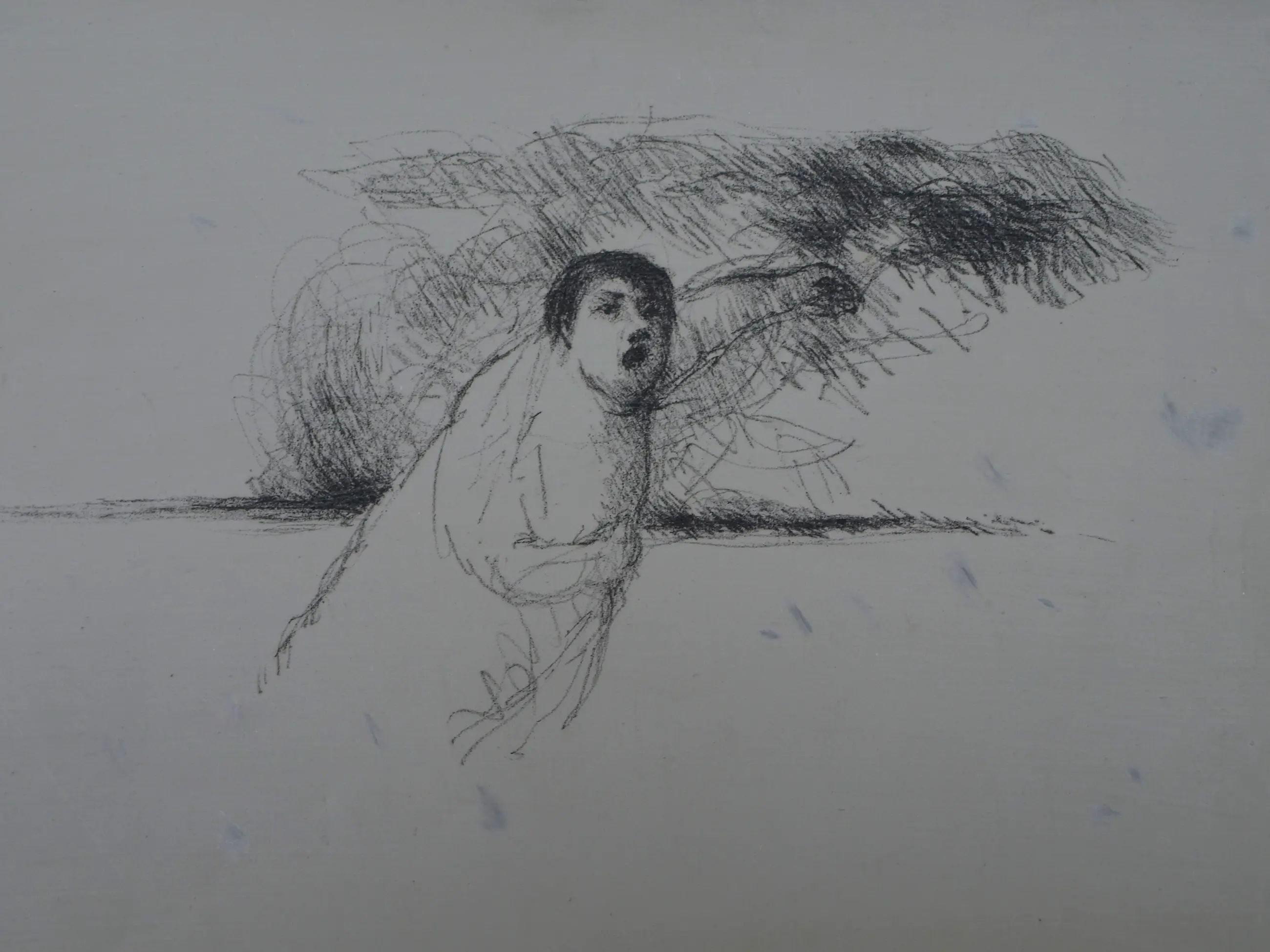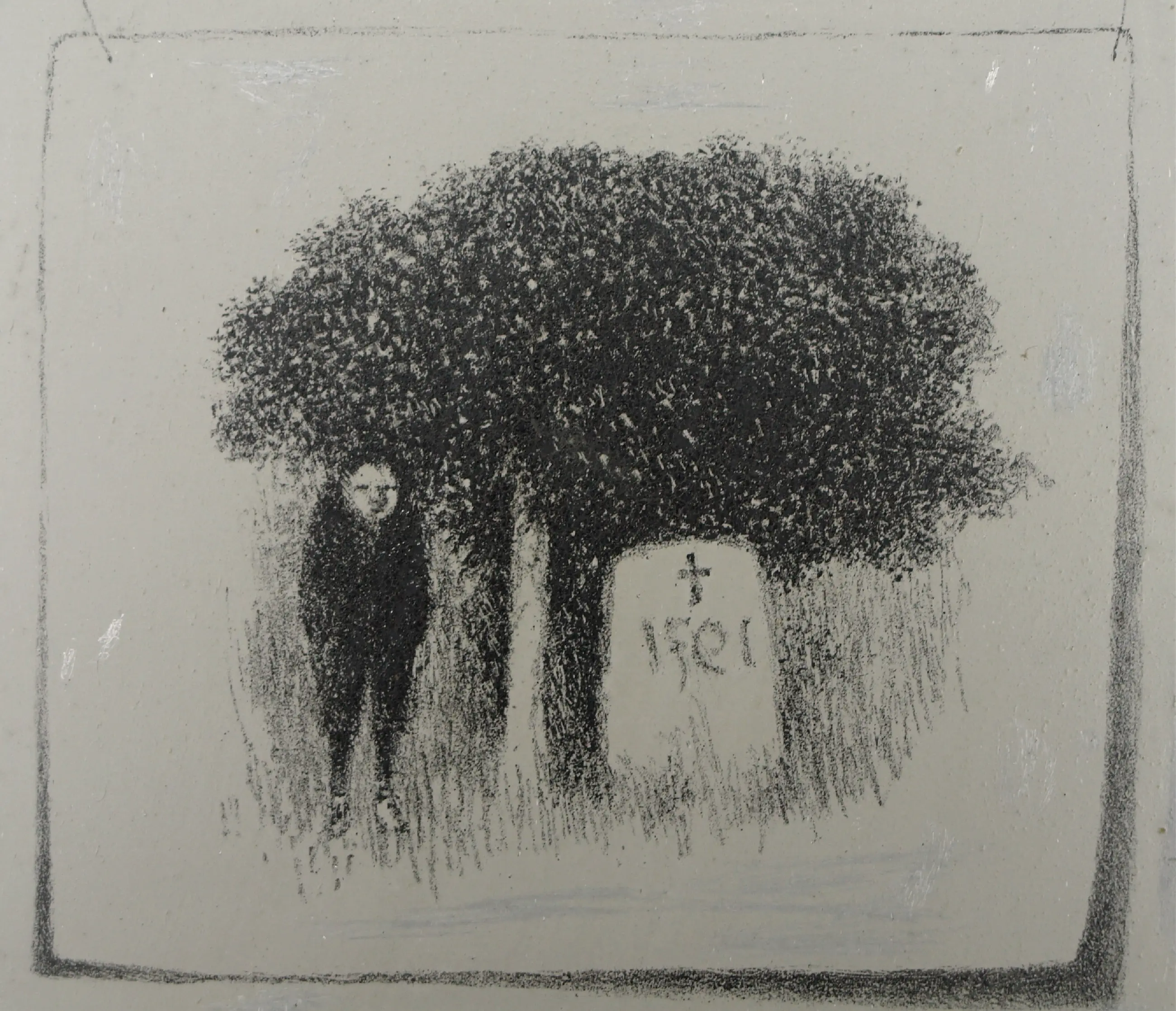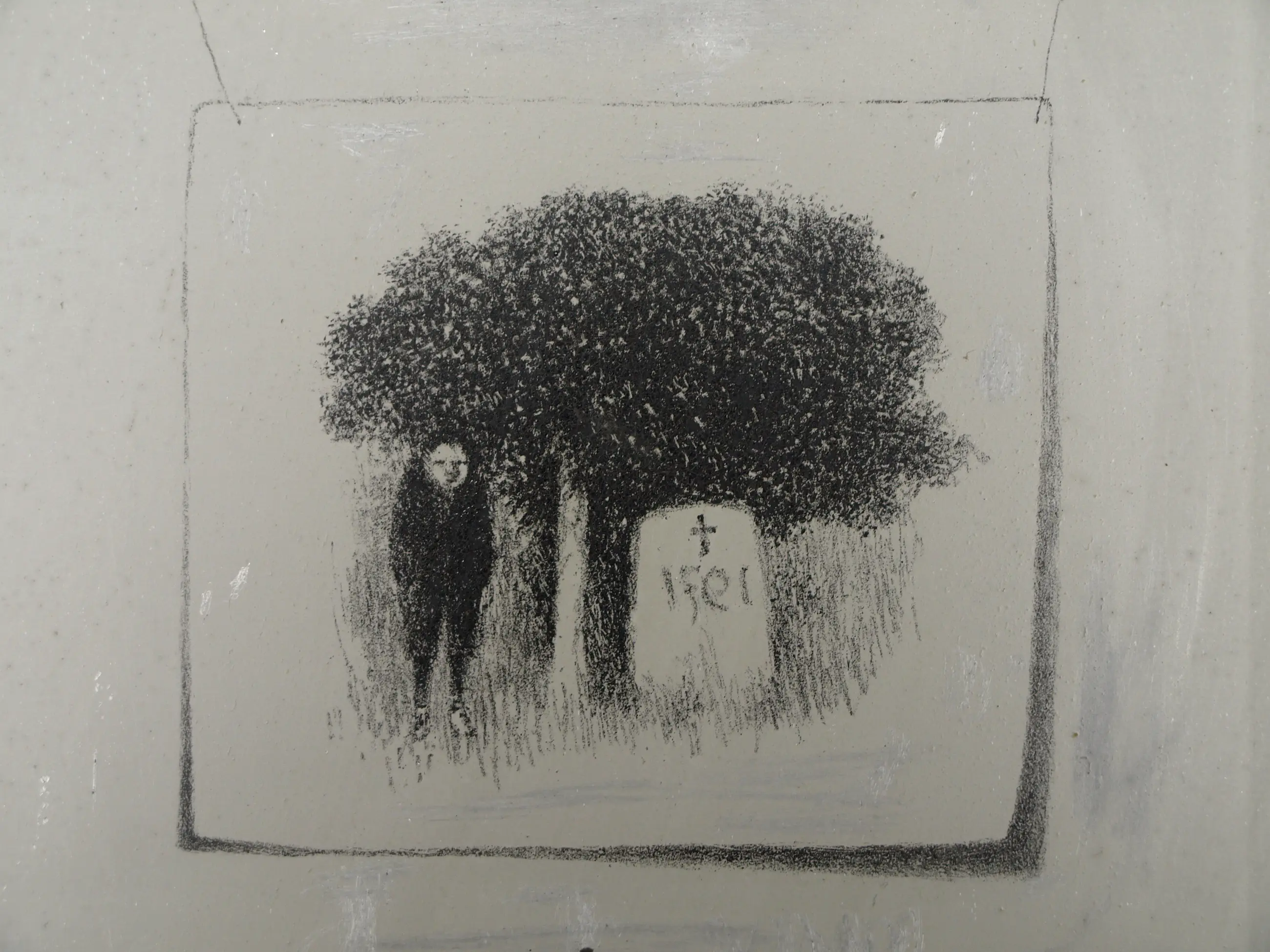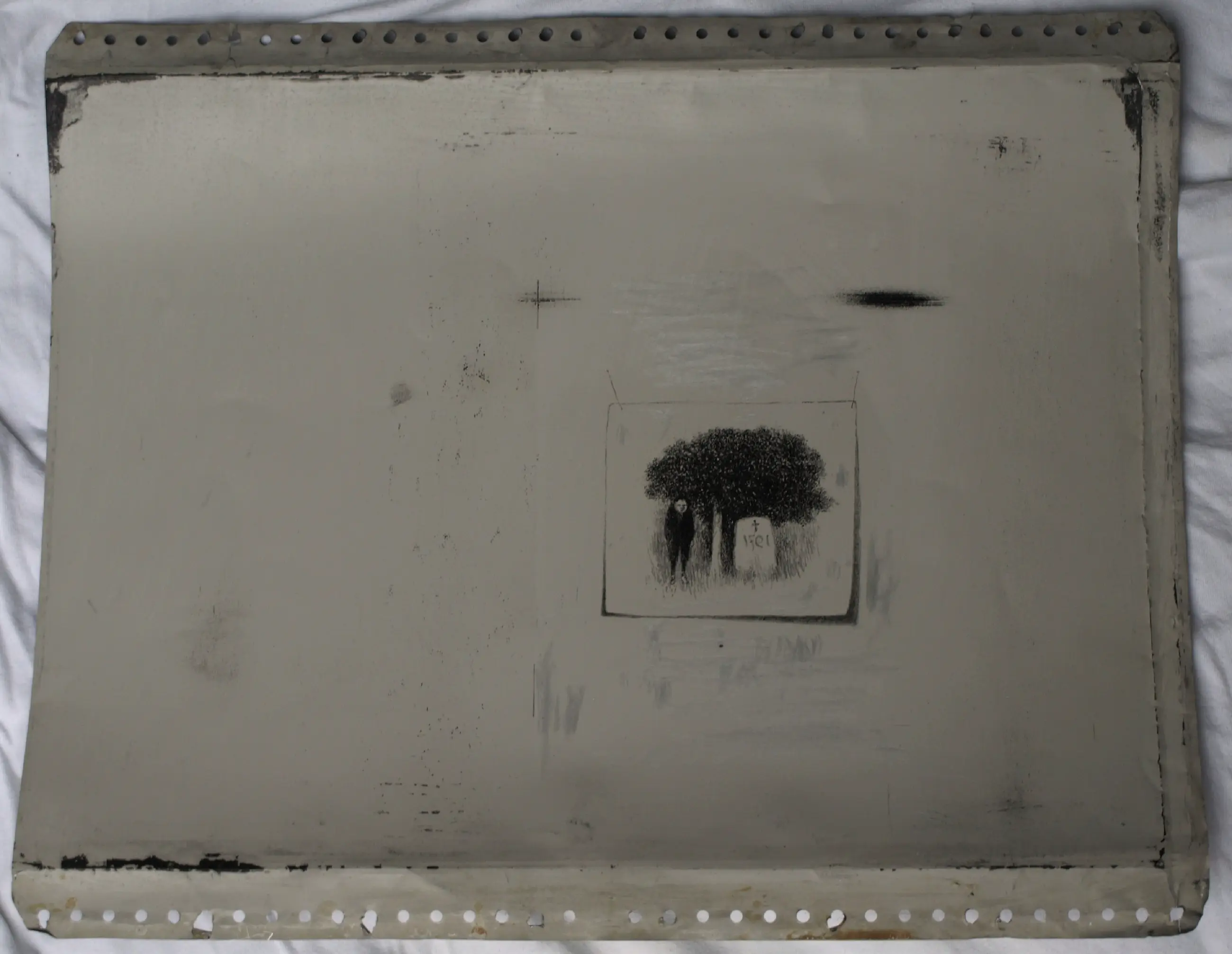 Metten Koornstra maakte zijn tekening rechtstreeks op deze plaat. Op de plaat zit nog de drukinkt, waardoor de afbeelding duidelijk te zien is. De afbeelding op de drukplaat is het spiegelbeeld van de afbeelding op de later gedrukte litho.