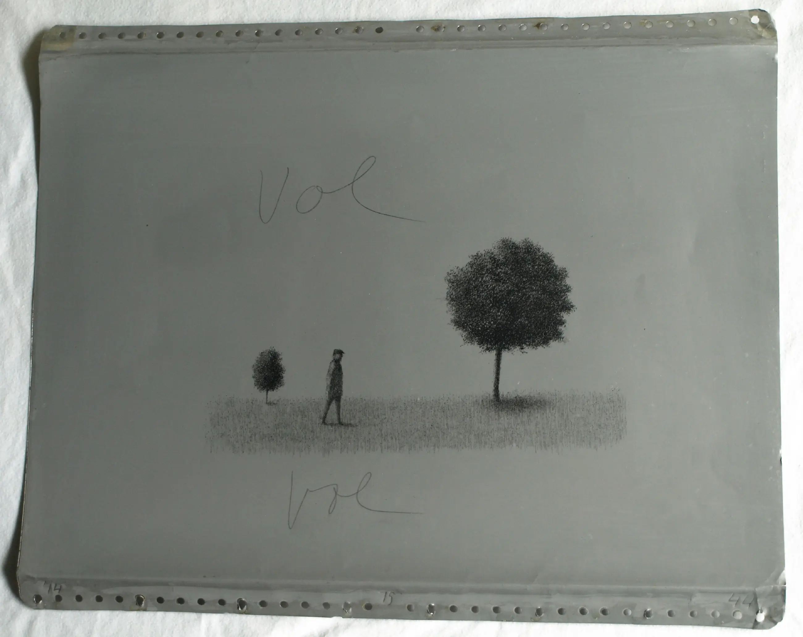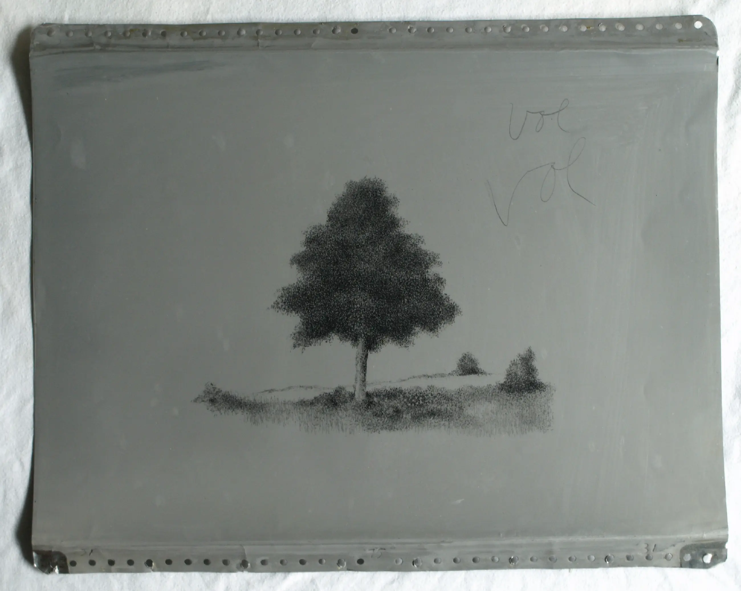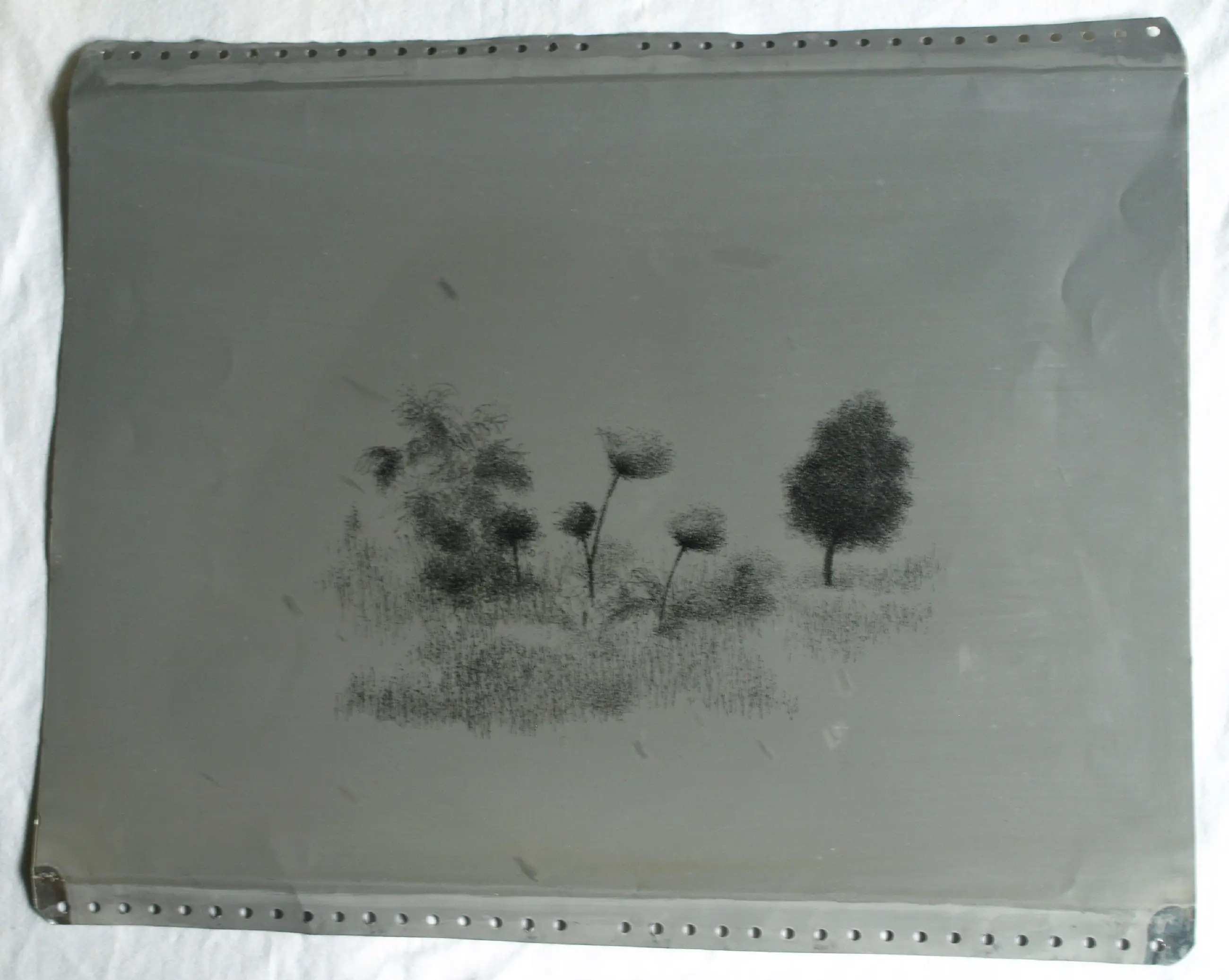 Metten Koornstra maakte zijn tekening rechtstreeks op deze plaat. Op de plaat zit nog de drukinkt, waardoor de afbeelding duidelijk te zien is. De afbeelding op de drukplaat is het spiegelbeeld van de afbeelding op de later gedrukte litho.