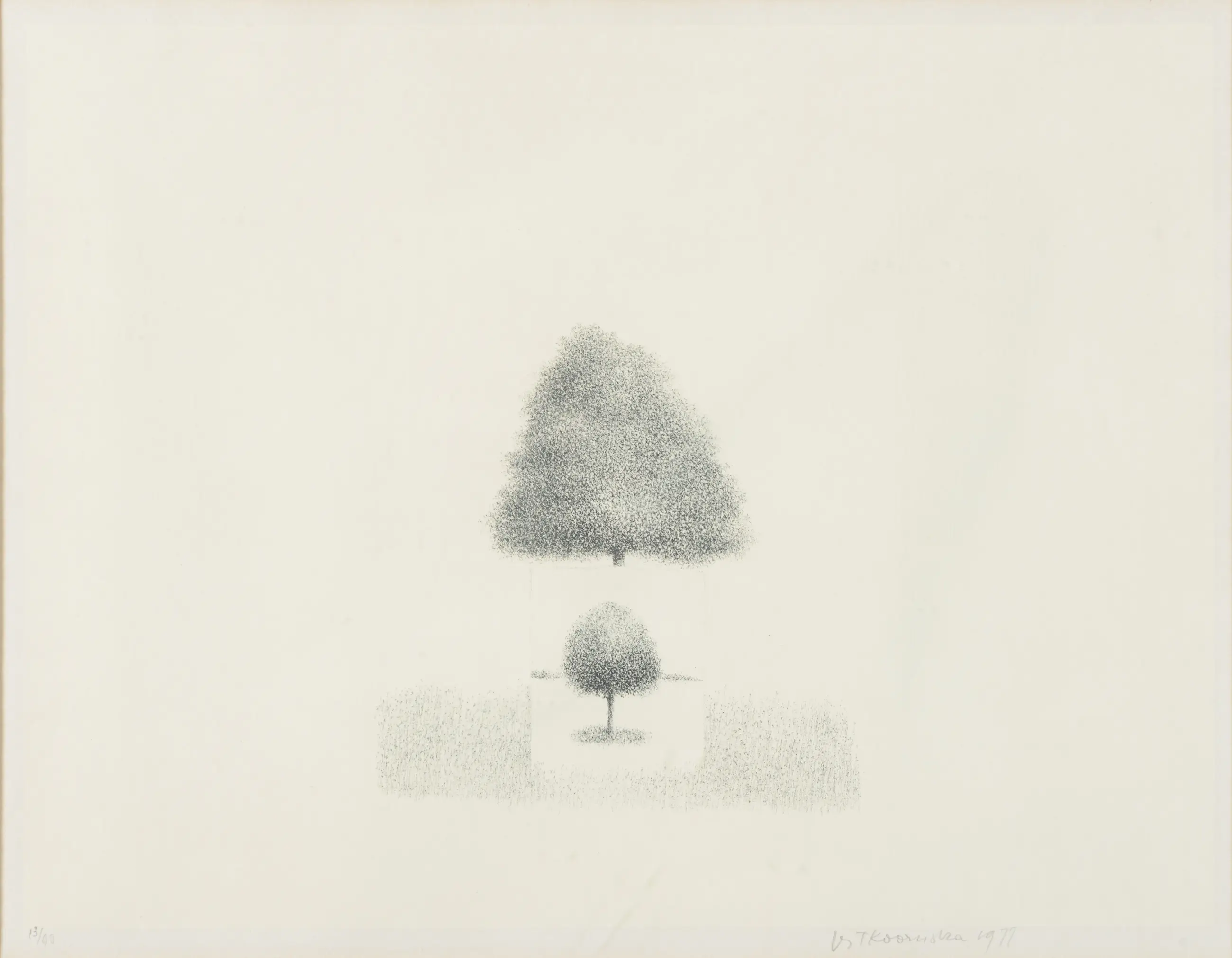 Subtiele ets van Metten Teunis Koornstra (Rotterdam, 13 augustus 1912 – Amsterdam, 26 september 1978). Hij was een Nederlandse graficus en kunstschilder, bekend om zijn verstilde landschappen en figuratieve werken. Daarnaast illustreerde hij boeken en ontwierp hij boekomslagen en theaterdecors.