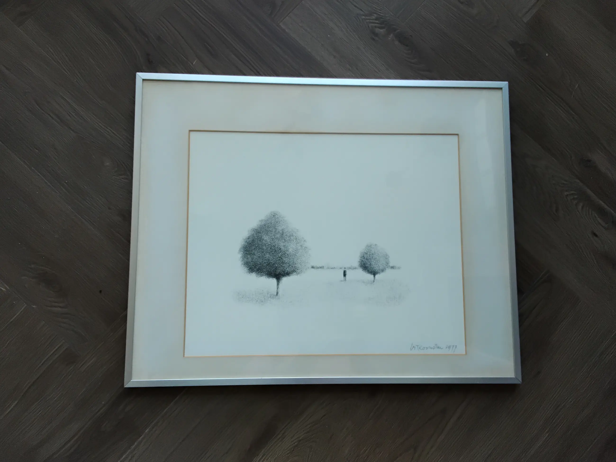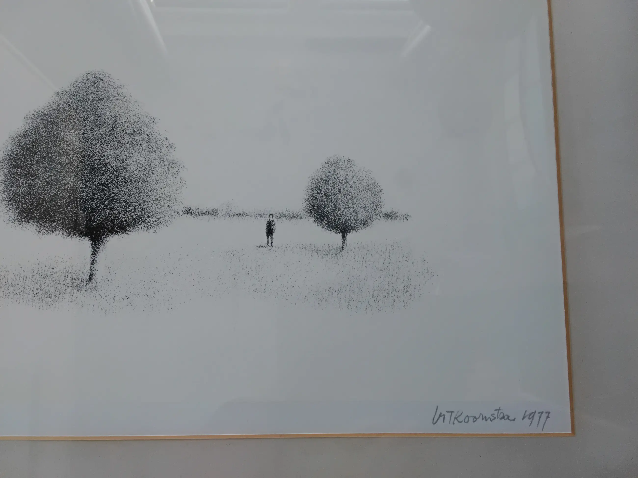 Mooi, eenvoudig werk van kunstenaar Mette Koornstra. Lijst is strak en zilverkleurig. Passe-partout is wat verkleurd.
