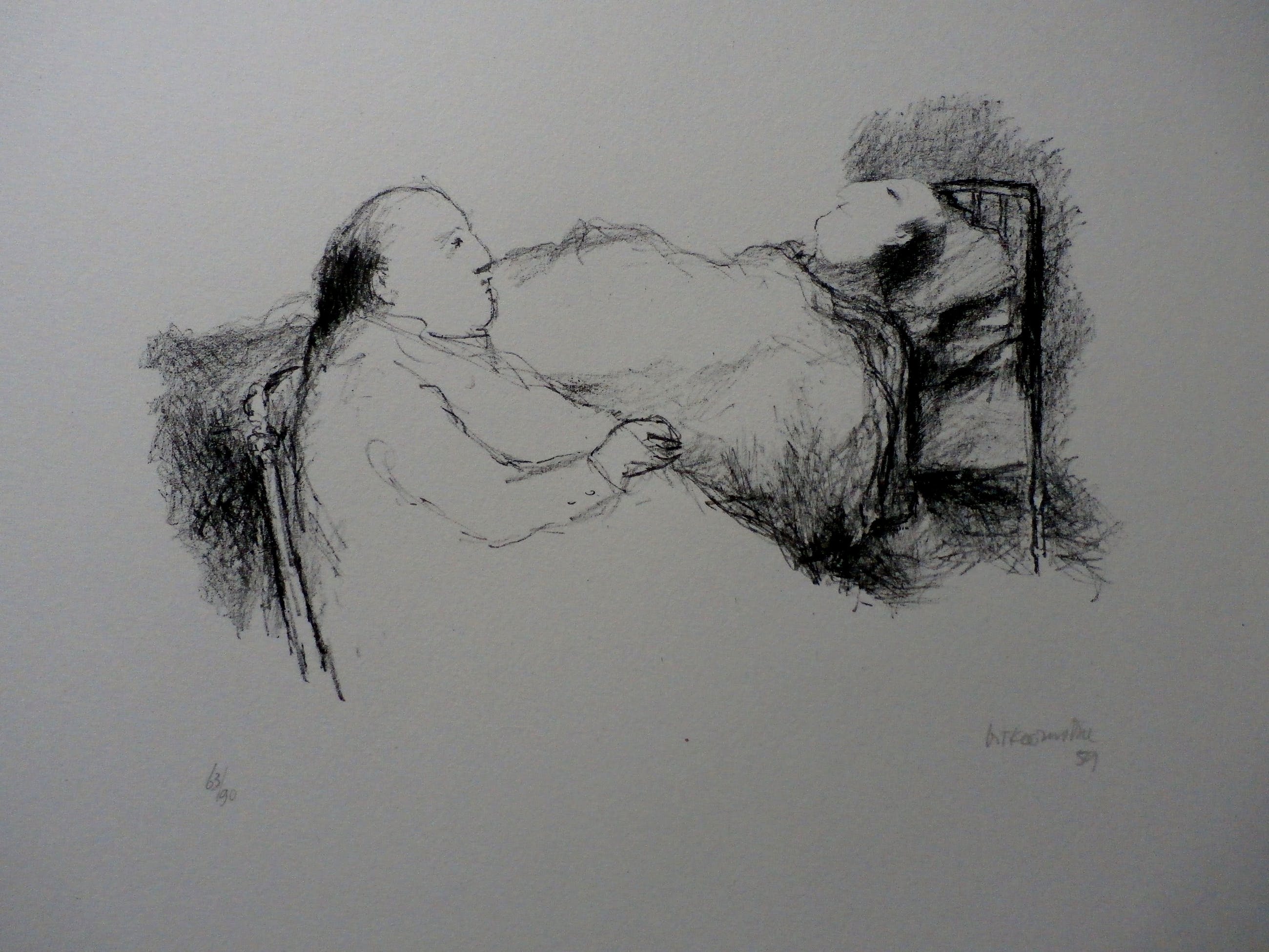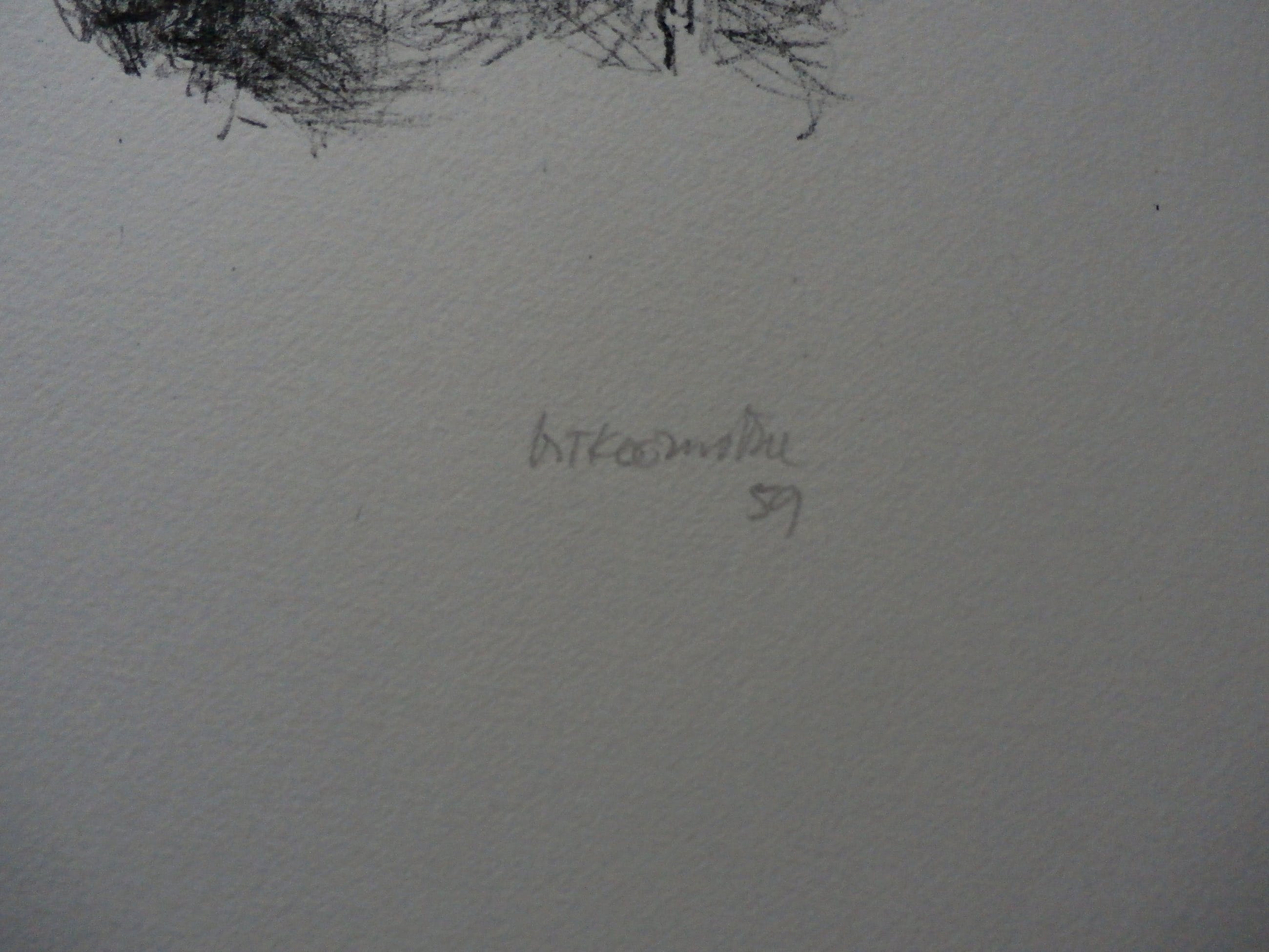 Litho van Metten Koornstra uit 1959. Nummer: 63/90. Titel: Onbekend. Afmetingen blad: H38 x b56,5 cm. Afmetingen voorstelling: H16 x b 27 cm. Rechtsonder met potlood gesigneerd door de kunstenaar.