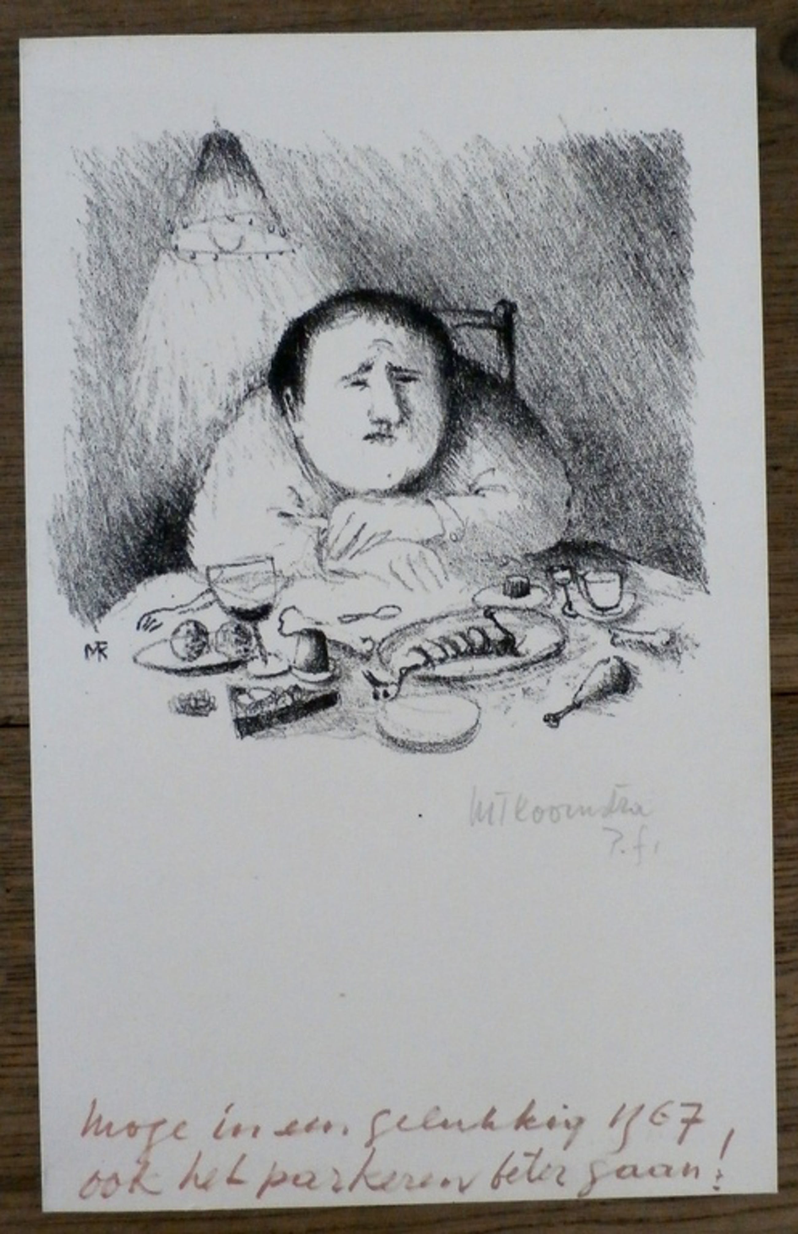 Litho van Metten Koornstra. Jaar: 1967. Titel: Moge in een gelukkig 1967 ook het parkeren veter gaan! Afmetingen: H23 x b15 cm. Afmetingen voorstelling: H12 x b13 cm.