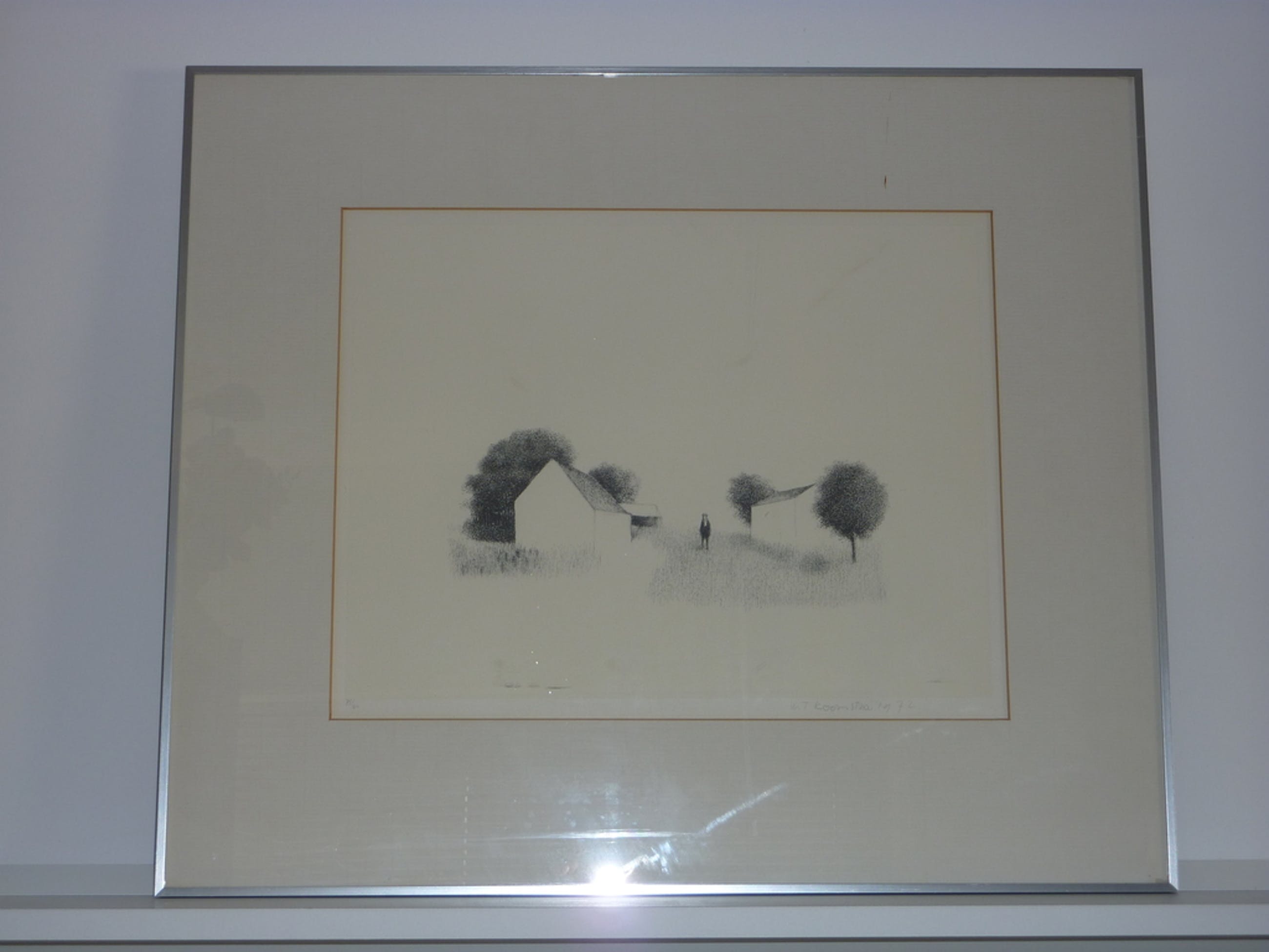 Twee zwart/wit tekeningen van een zame figuur in waarschijnlijk Frans dorpslandsschap. Origineel gesigneerd werk uit 1972.