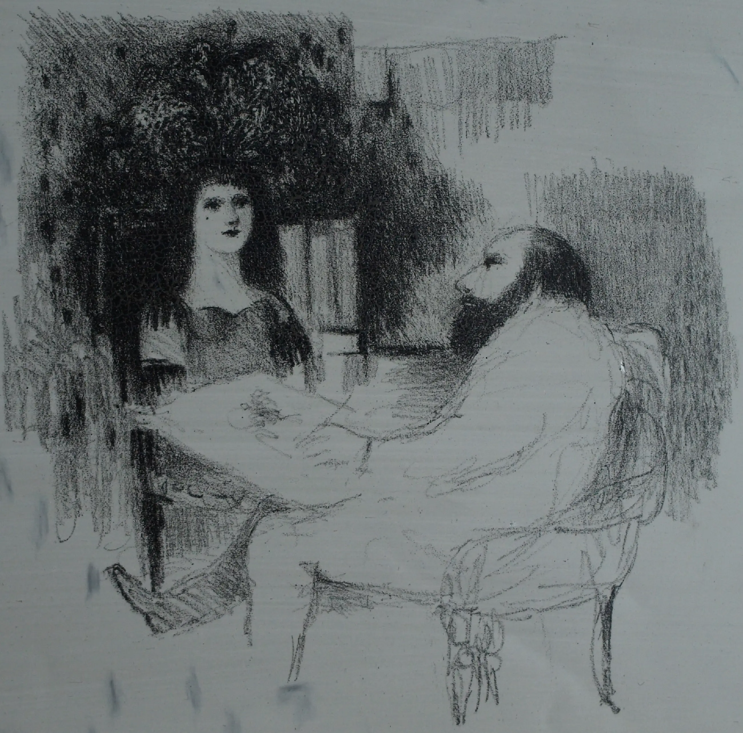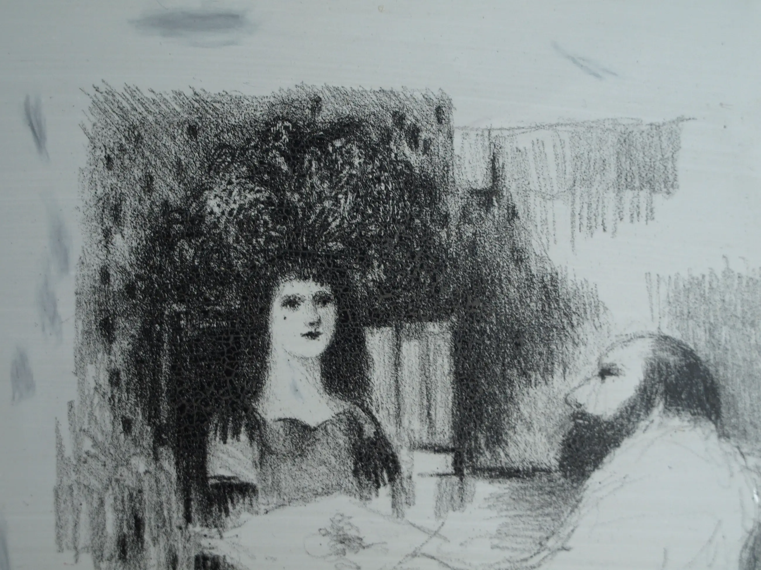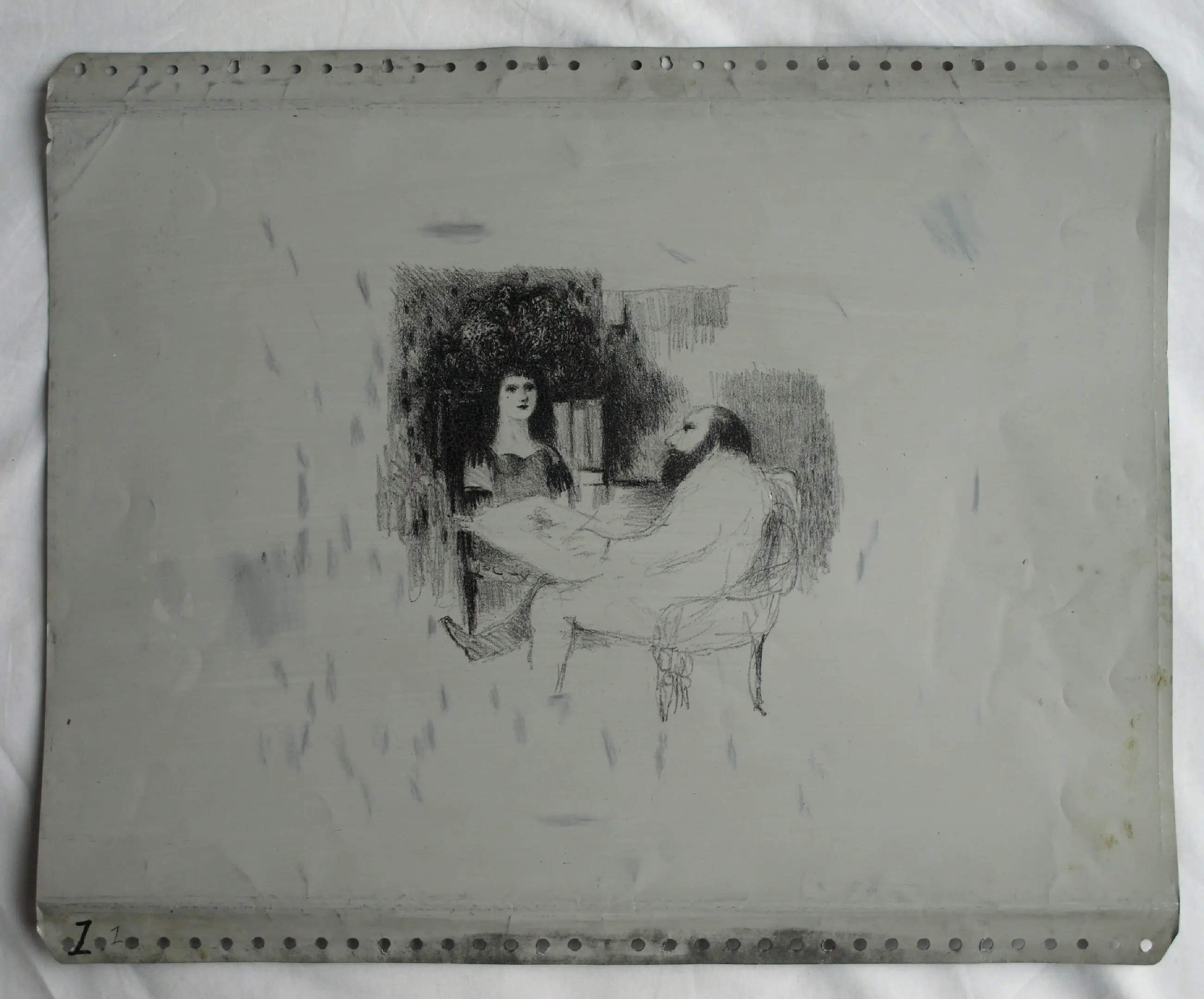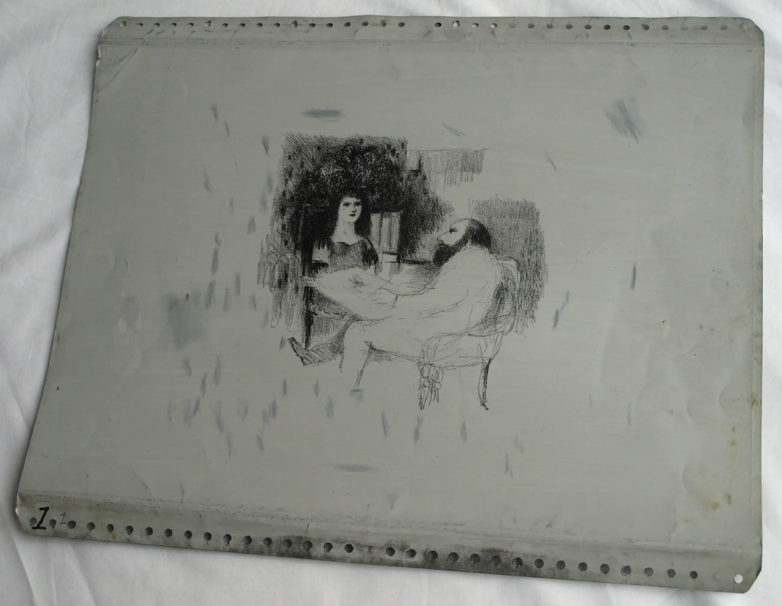 Metten Koornstra maakte zijn tekening rechtstreeks op deze plaat. Op de plaat zit nog de drukinkt, waardoor de afbeelding duidelijk te zien is. De afbeelding op de drukplaat is het spiegelbeeld van de afbeelding op de later gedrukte litho. Het is mij onduidelijk of deze litho ooit is uitgegeven. Ik heb geen afdrukken van deze afbeelding kunnen vinden....