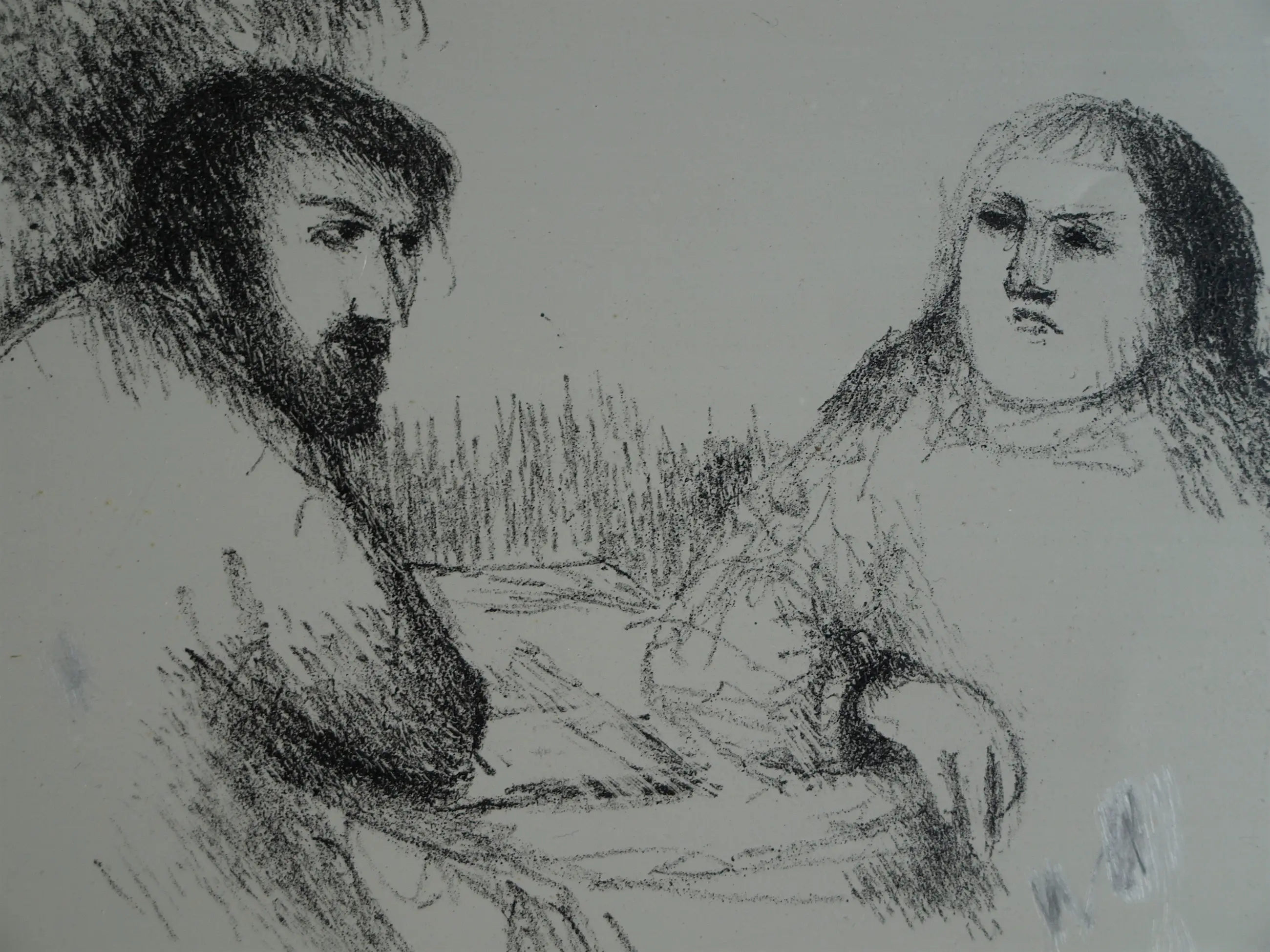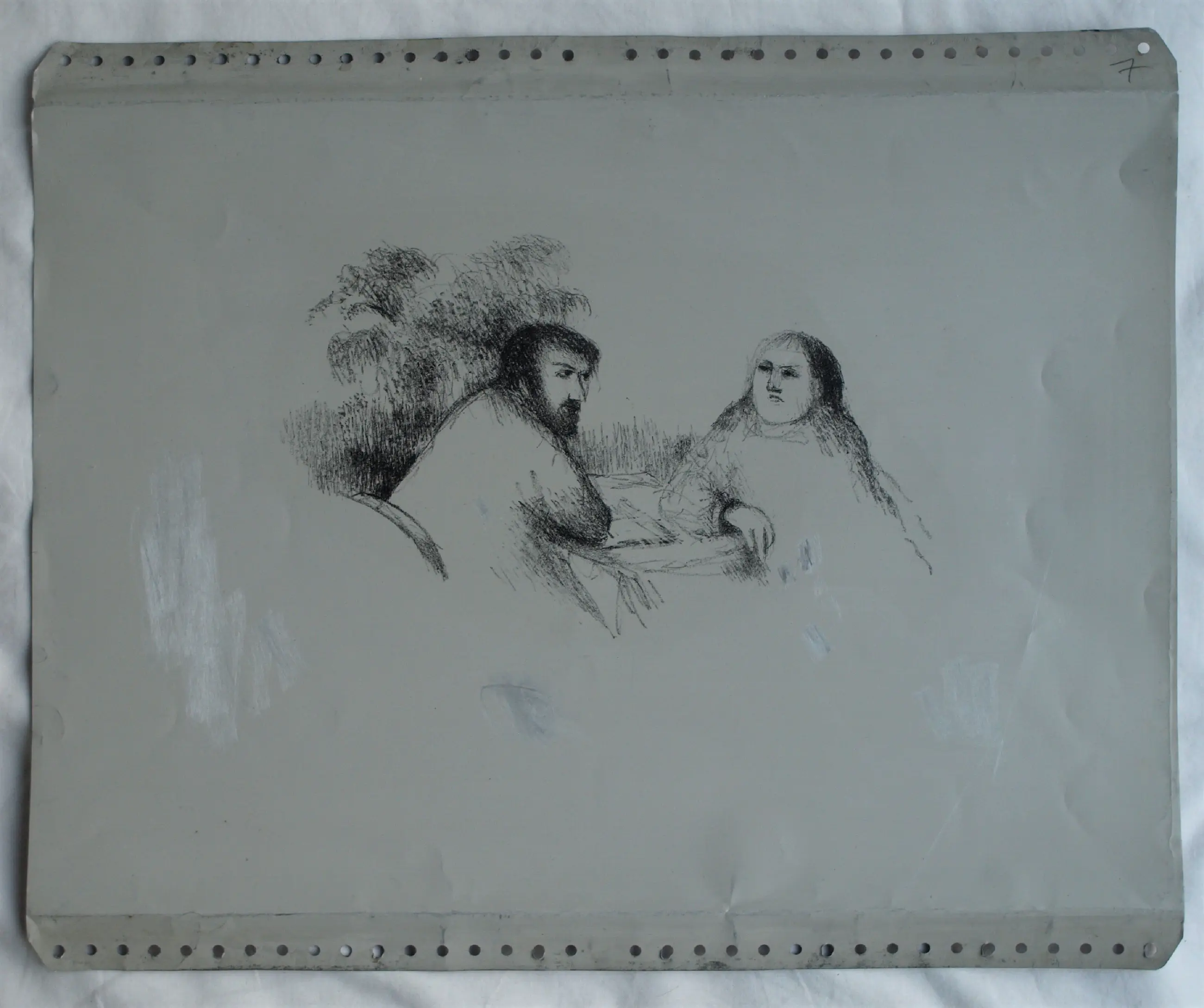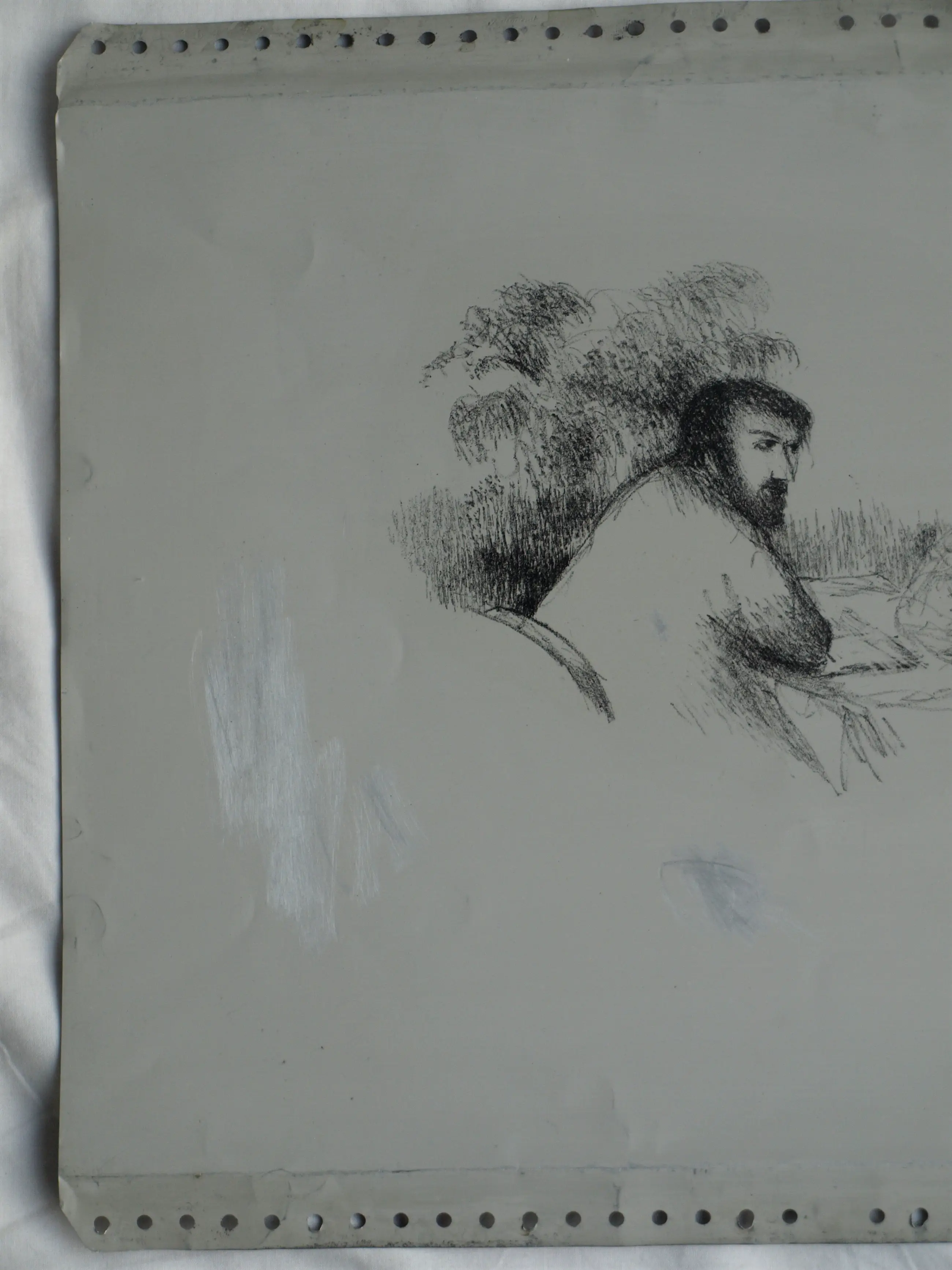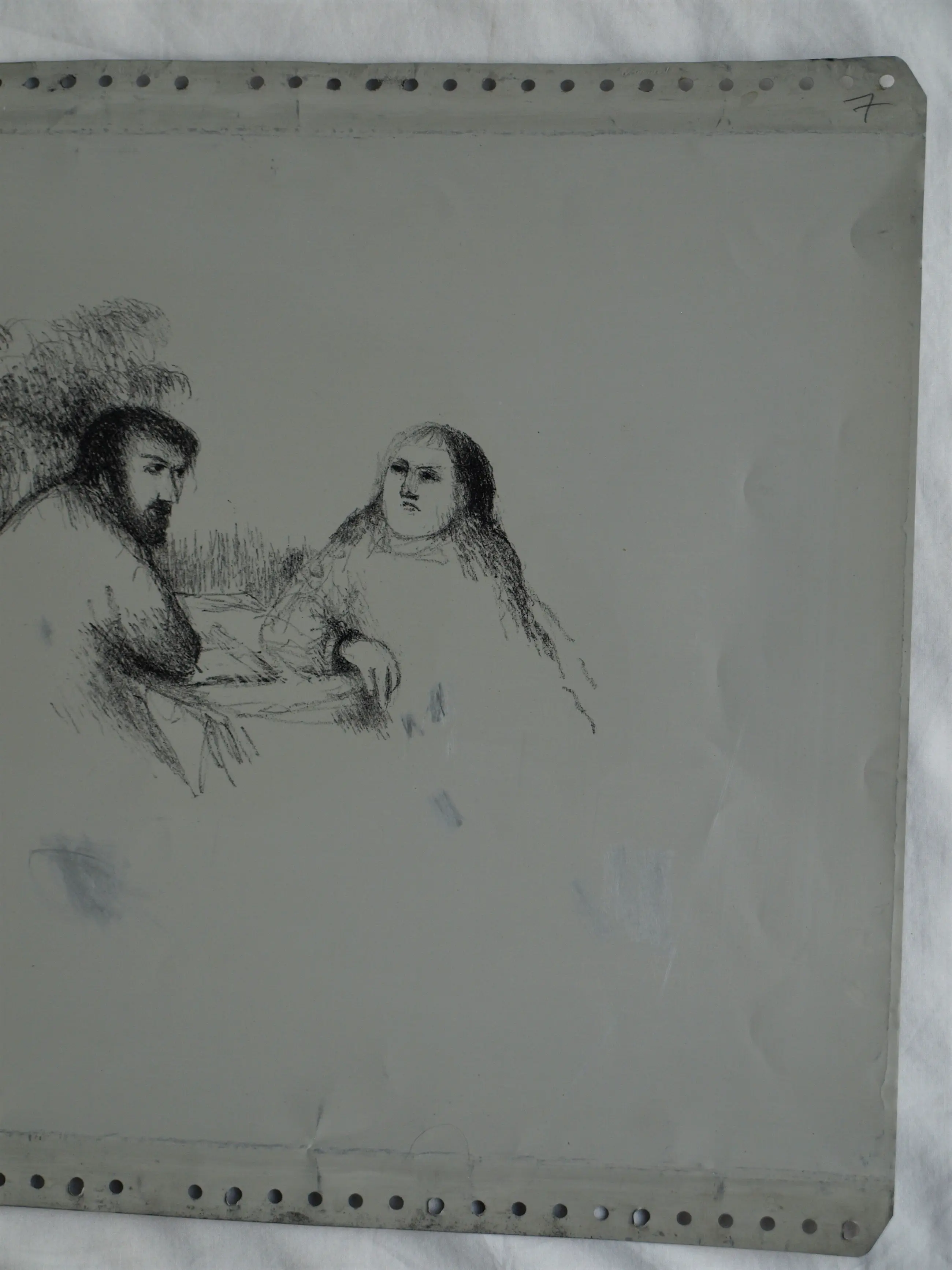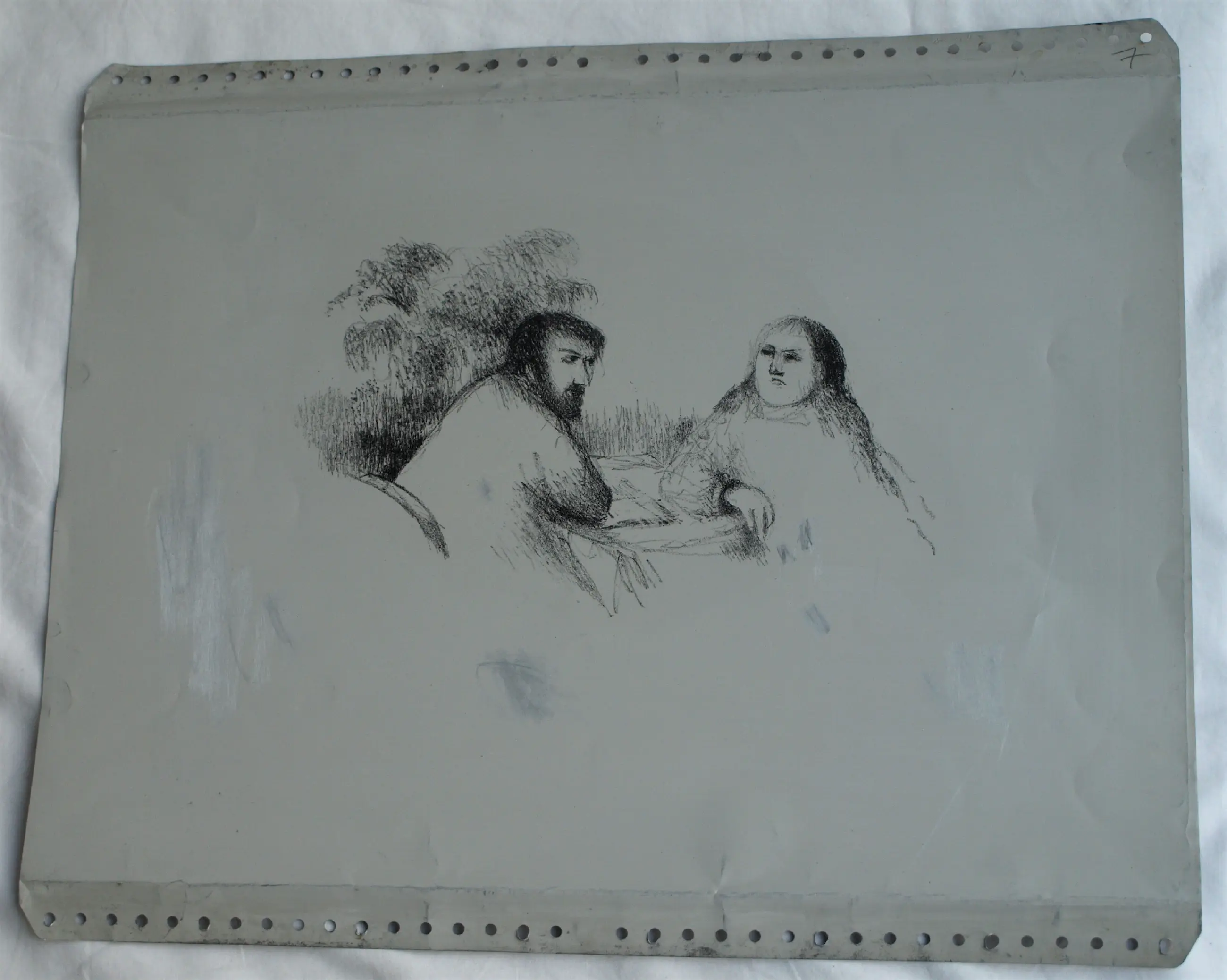 Metten Koornstra maakte zijn tekening rechtstreeks op deze plaat. Op de plaat zit nog de drukinkt, waardoor de afbeelding duidelijk te zien is. De afbeelding op de drukplaat is het spiegelbeeld van de afbeelding op de later gedrukte litho. Het is mij onduidelijk of deze litho ooit is uitgegeven. Ik heb geen afdrukken van deze afbeelding kunnen vinden....