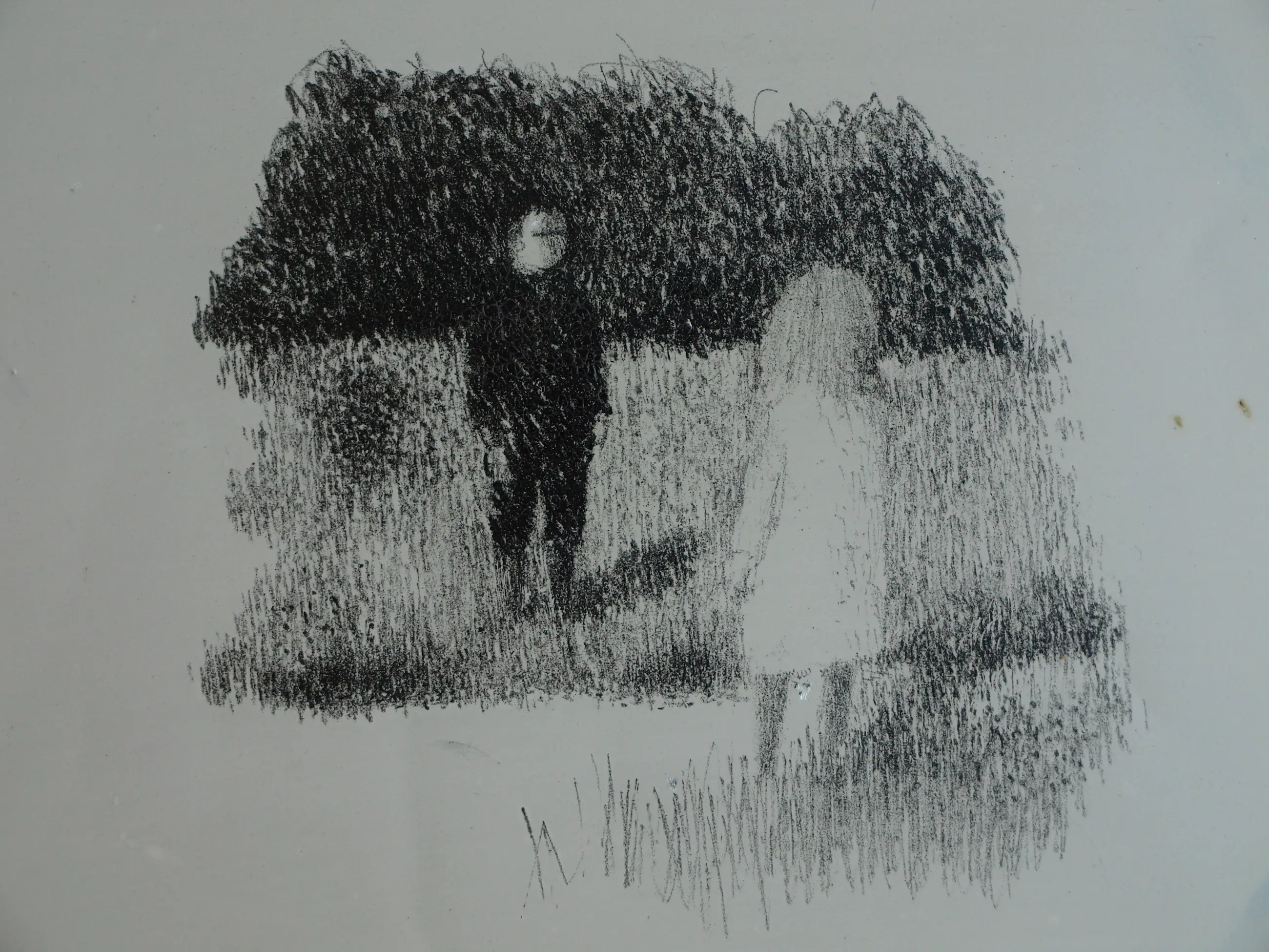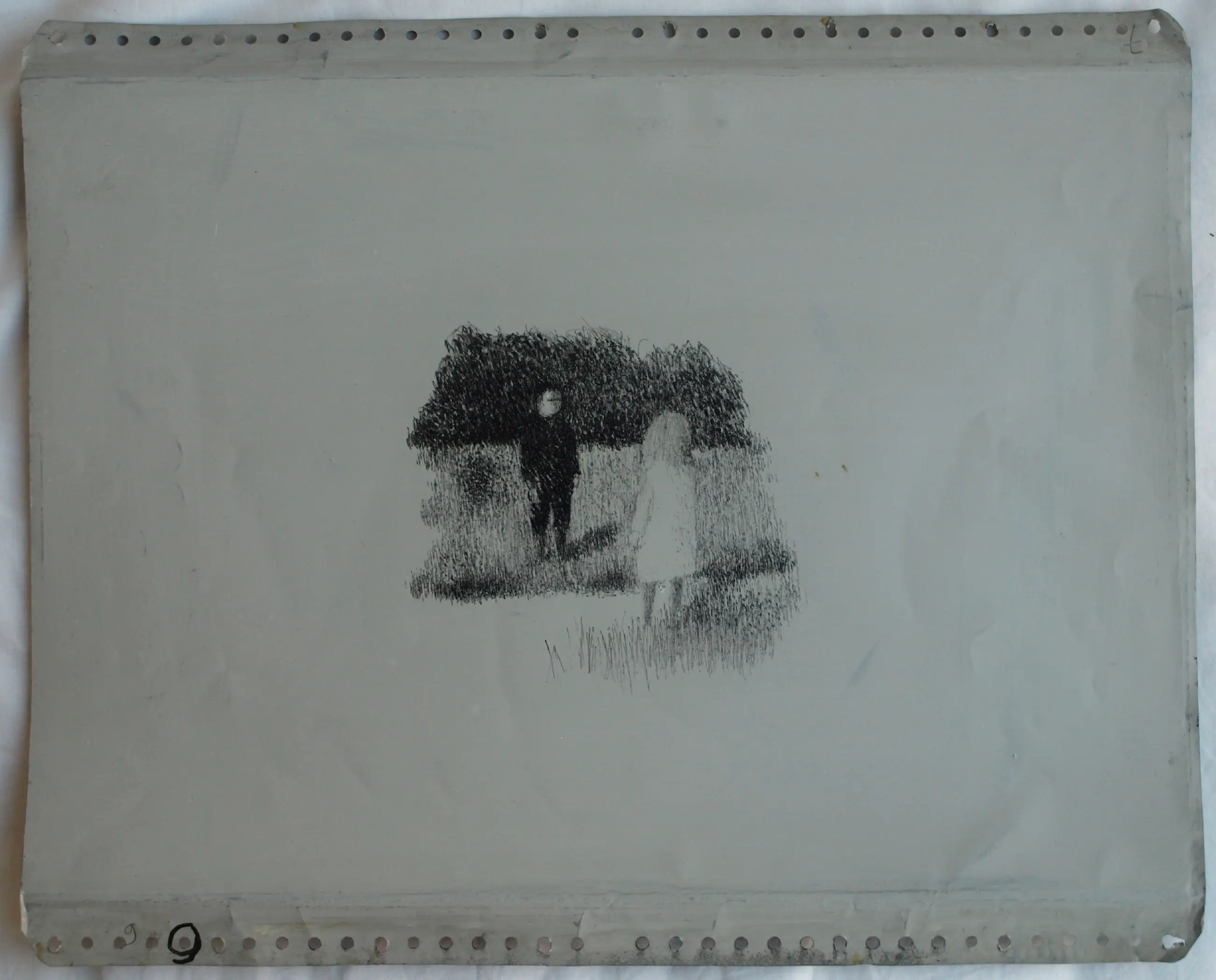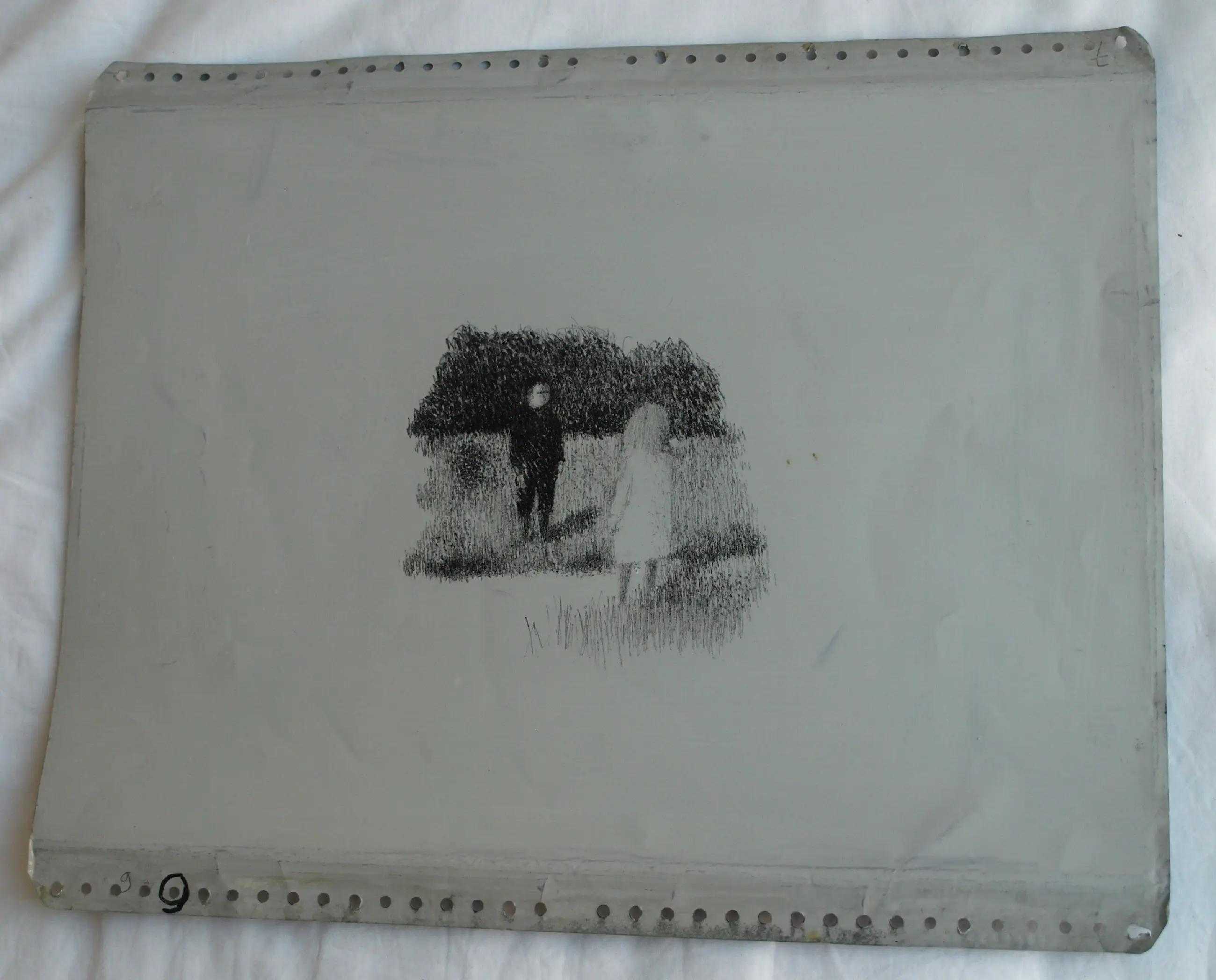 Metten Koornstra maakte zijn tekening rechtstreeks op deze plaat. Op de plaat zit nog de drukinkt, waardoor de afbeelding duidelijk te zien is. De afbeelding op de drukplaat is het spiegelbeeld van de afbeelding op de later gedrukte litho. Zie ook de laatste foto met een afbeelding van een afgedrukte litho.