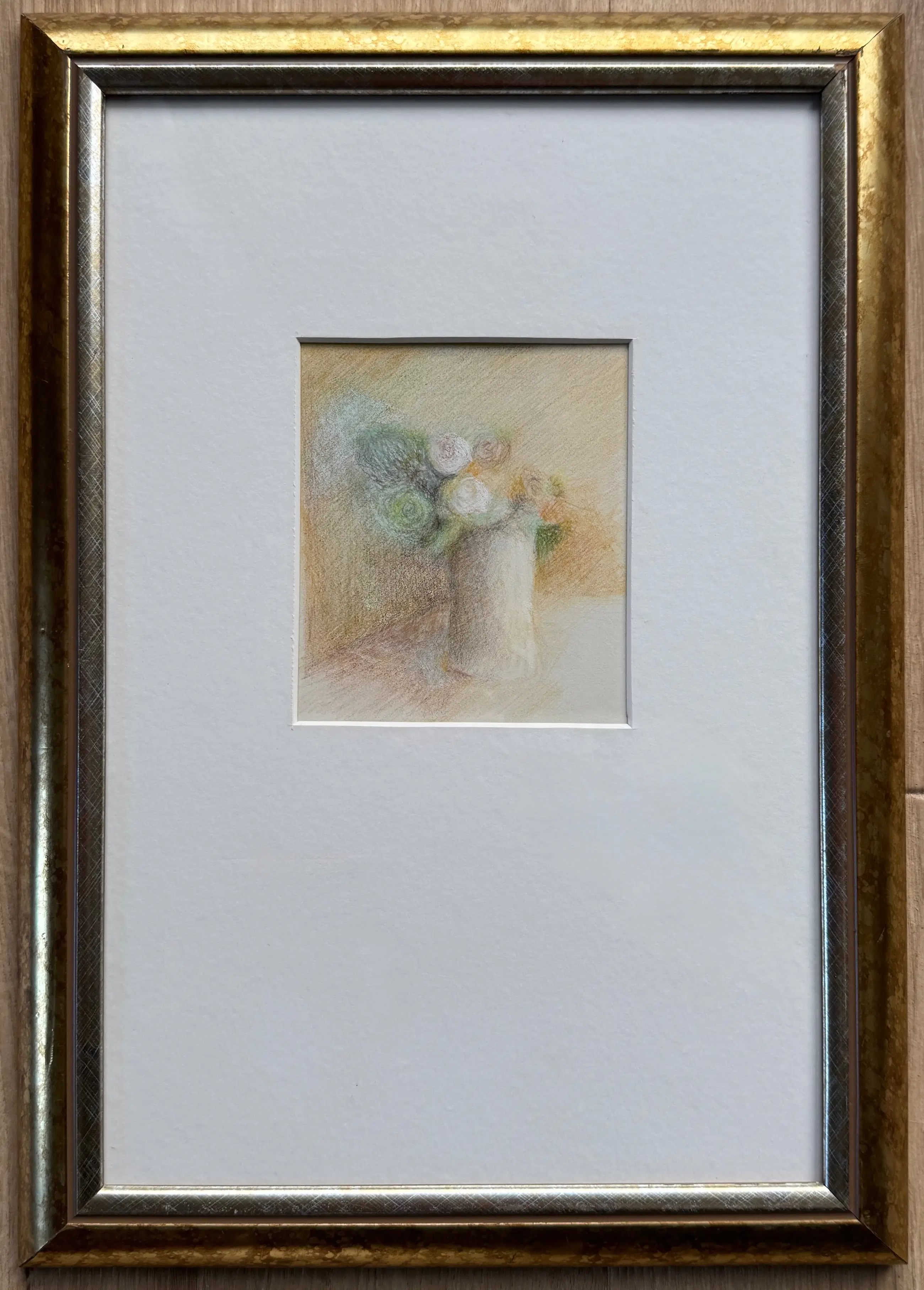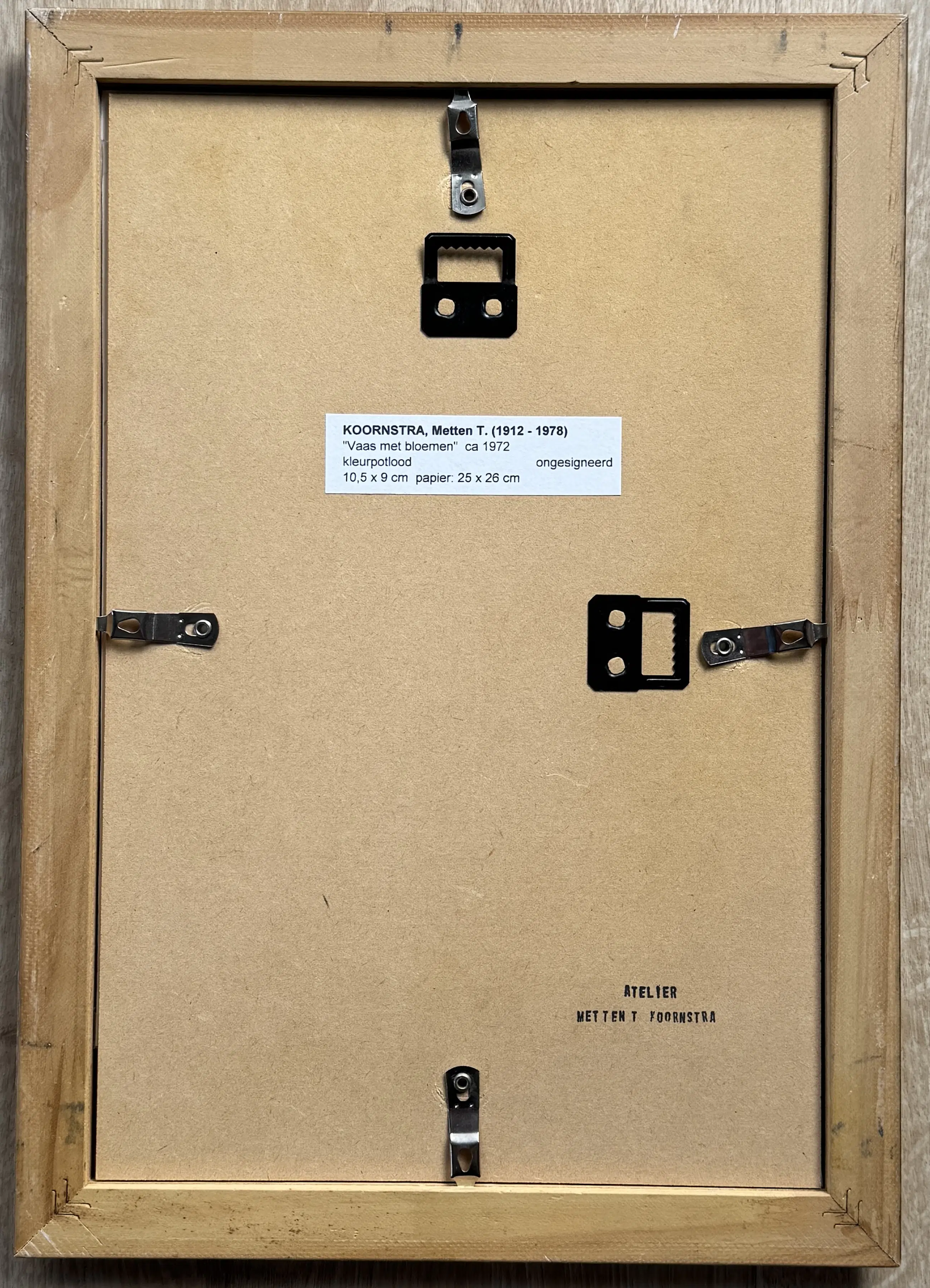 Mooi en sereen stilleven van Metten Koornstra, uitgevoerd in zachte kleuren. Gesigneerd met atelierstempel op de achterzijde van het werk en nogmaals op de lijst.