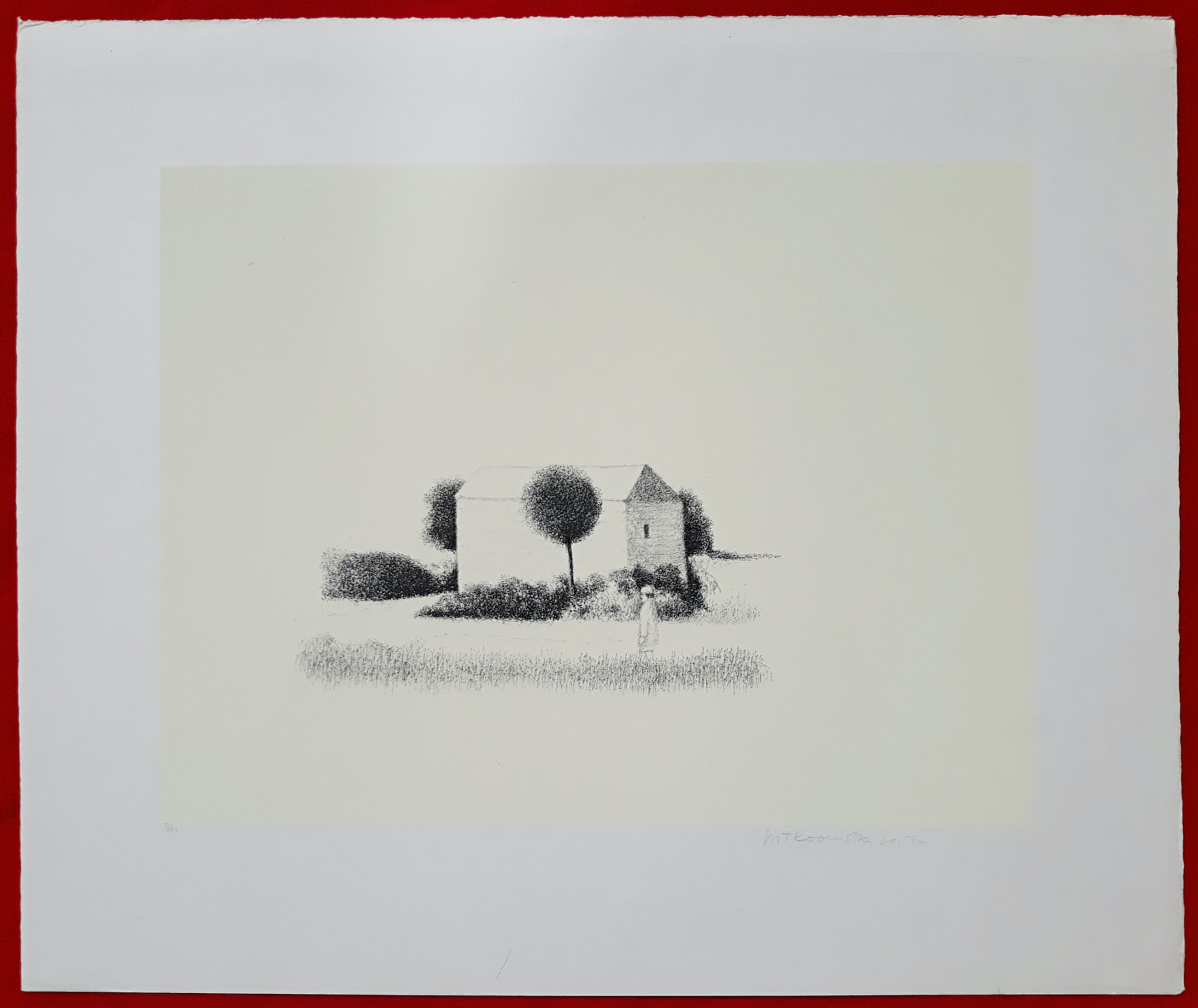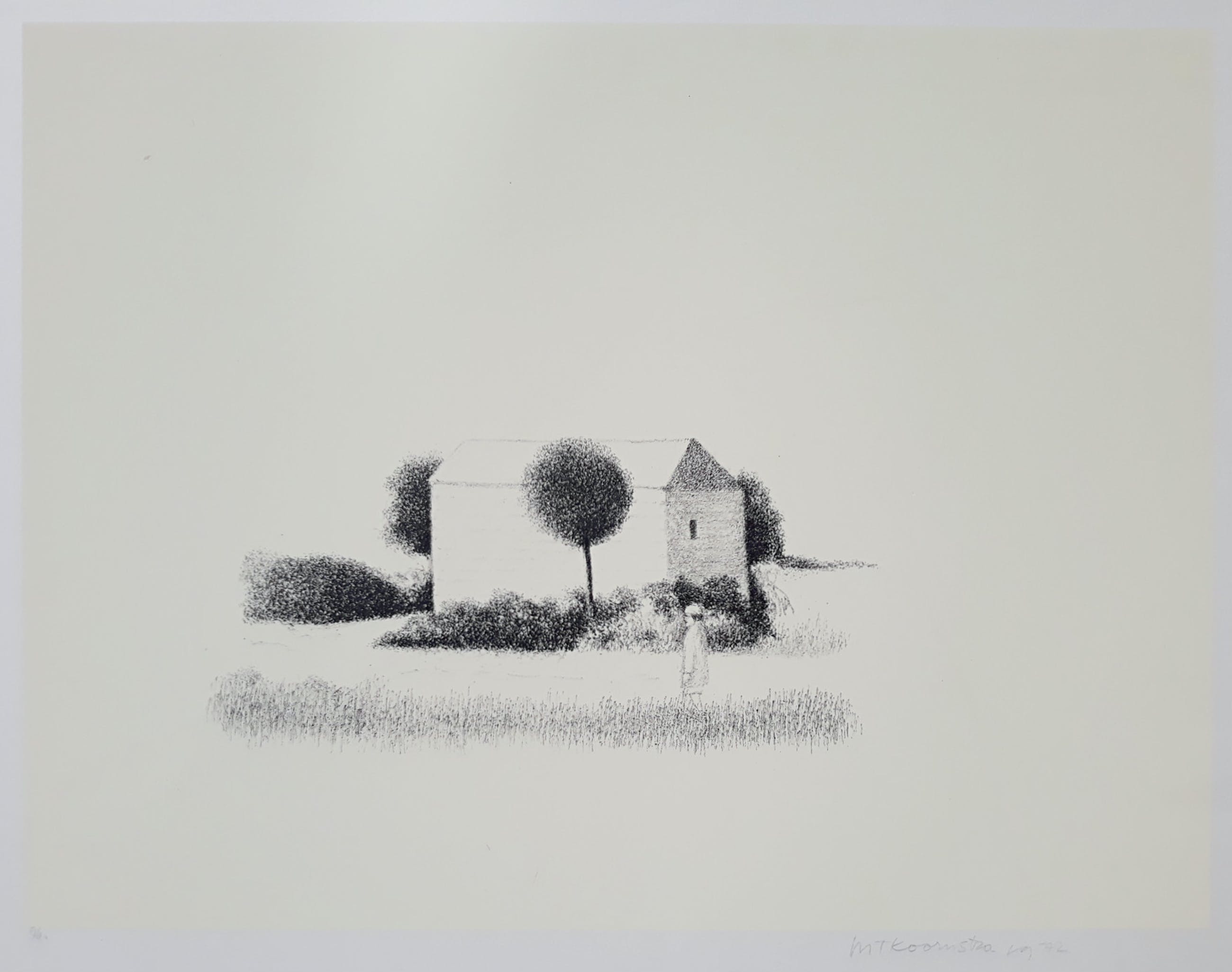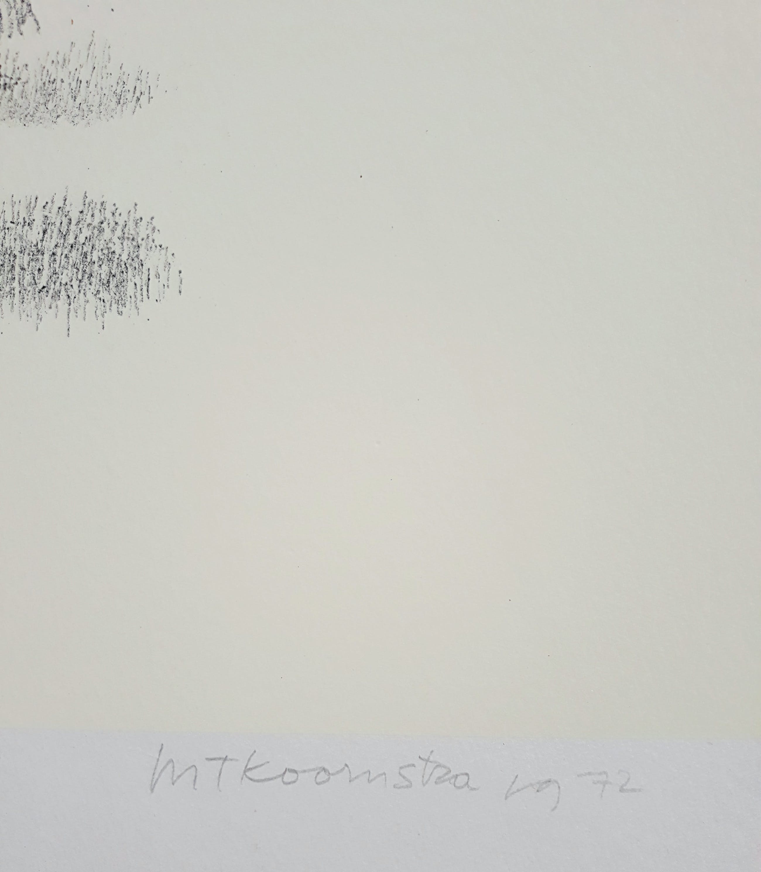 Uit duizenden herkenbaar werk van Metten Koornstra. Litho op geschept papier, met potlood gesigneerd, gedateerd (1972) en genummerd (8/90). In goede conditie; kreuk rechtsboven in de hoek, paar kleine kreukjes aan de rechterkant en een minieme beschadiging in de hoek van het beeld linksboven. Ingelijst met passe-partout is het werk zeer goed.