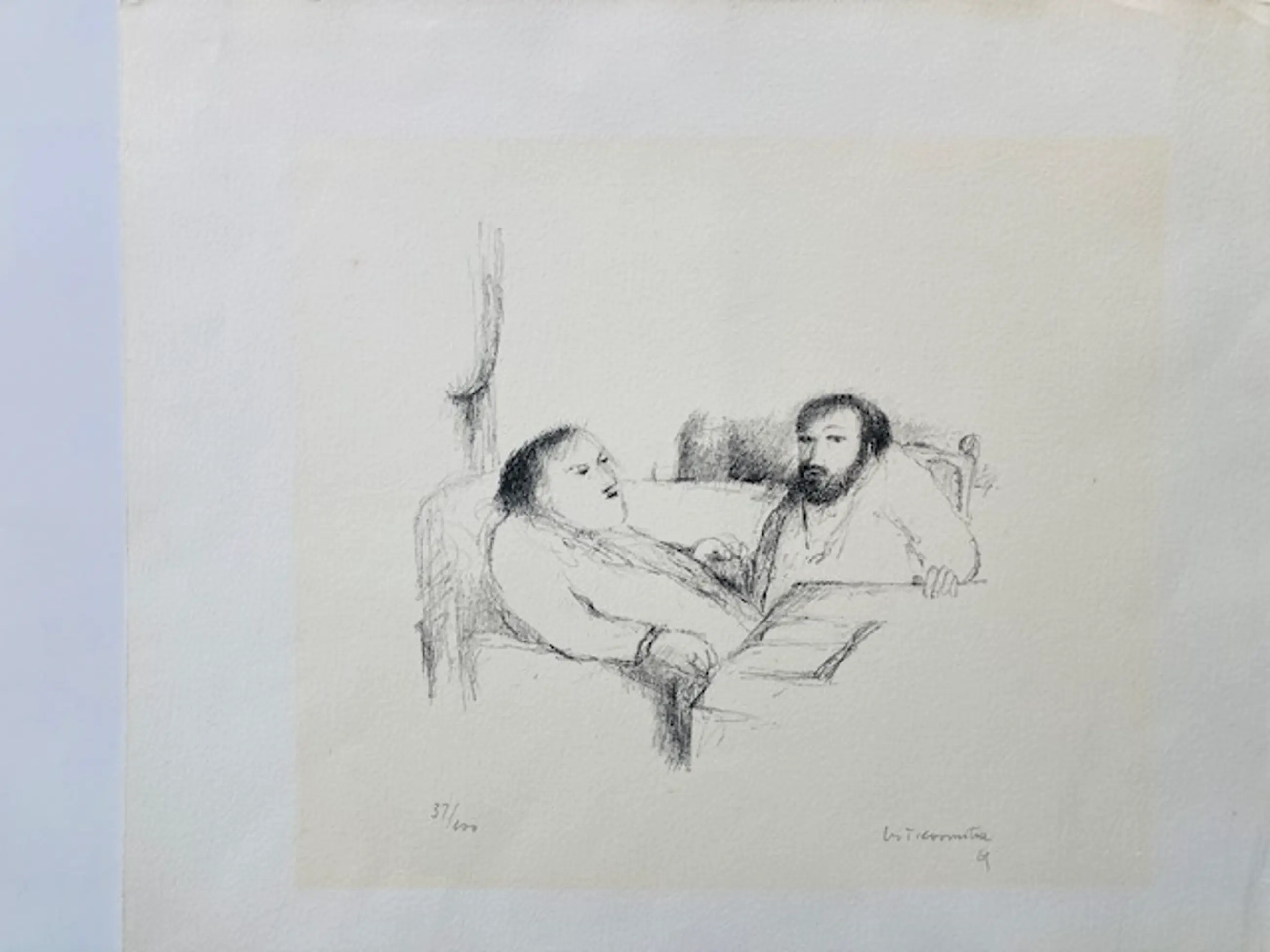 Fraaie litho van Metten Koornstra (1912-1978). Het werk heeft al eens onder passe partout gezeten en heeft een egale verkleuring. Bij gebruik van een nieuw passe partout valt het verschil deze oneffenheid weg. het werk verdient het om opnieuw ingelijst te worden