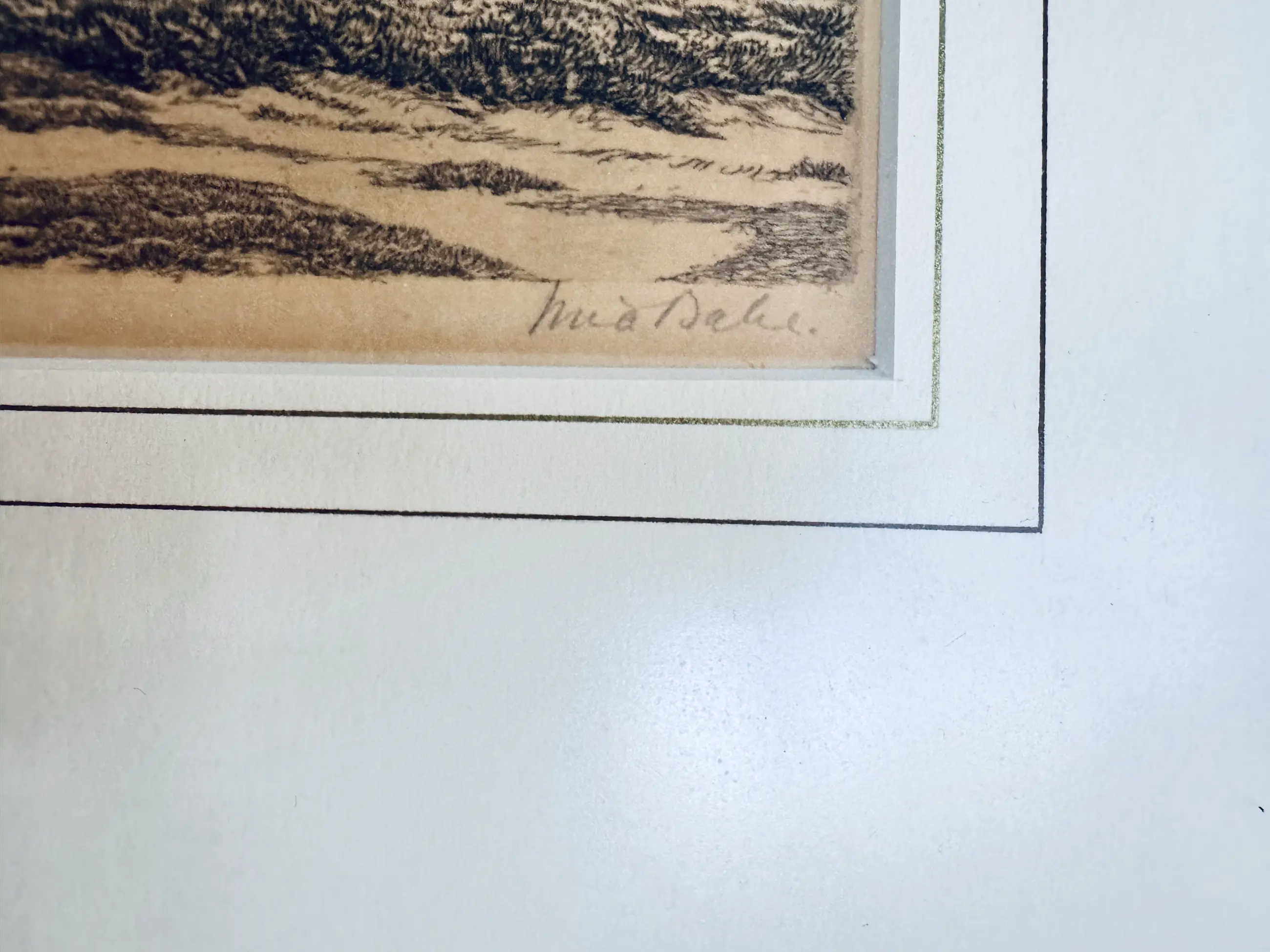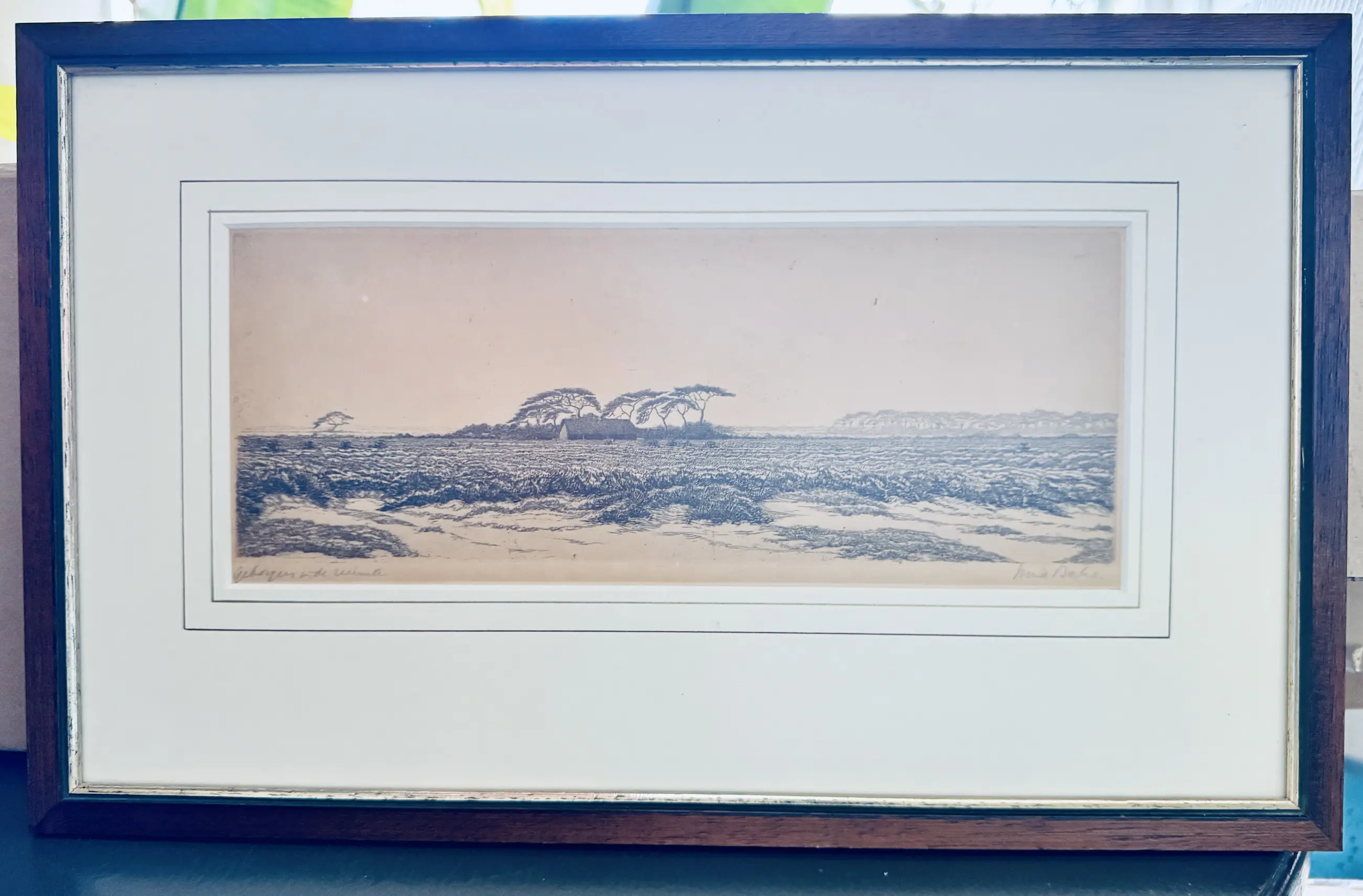 De ets toont een rustig landelijk landschap, een veelvoorkomend thema in Bake’s oeuvre. De compositie lijkt te draaien om een boerderij aan de horizon, waarbij de eenvoud van de natuur een gevoel van rust en sereniteit oproept. De bomen in de verre rechterhoek dragen bij aan de diepte en het perspectief, terwijl de subtiele details van texturen en schaduwen de technische vaardigheid van Mia Bake onderstrepen.