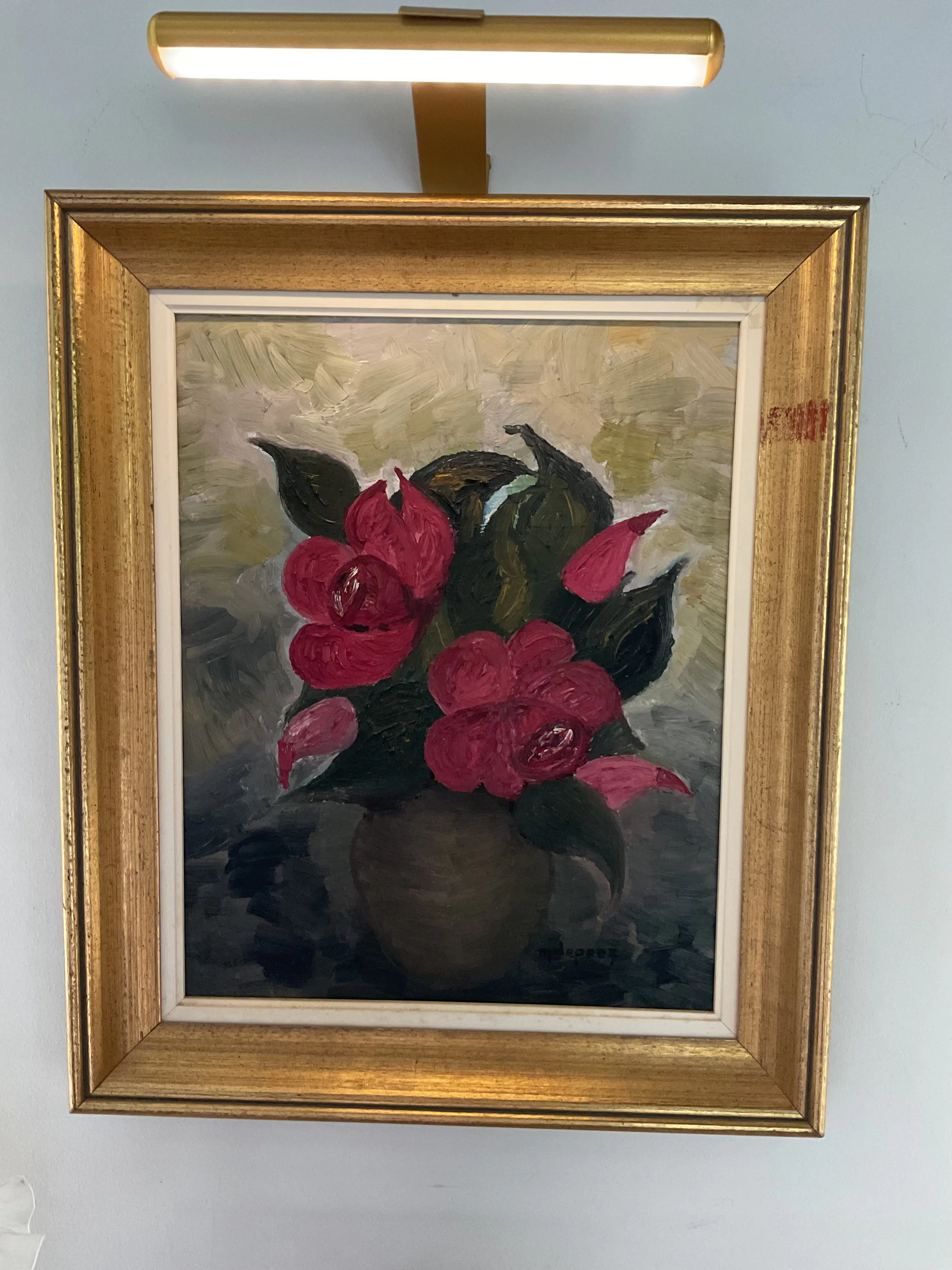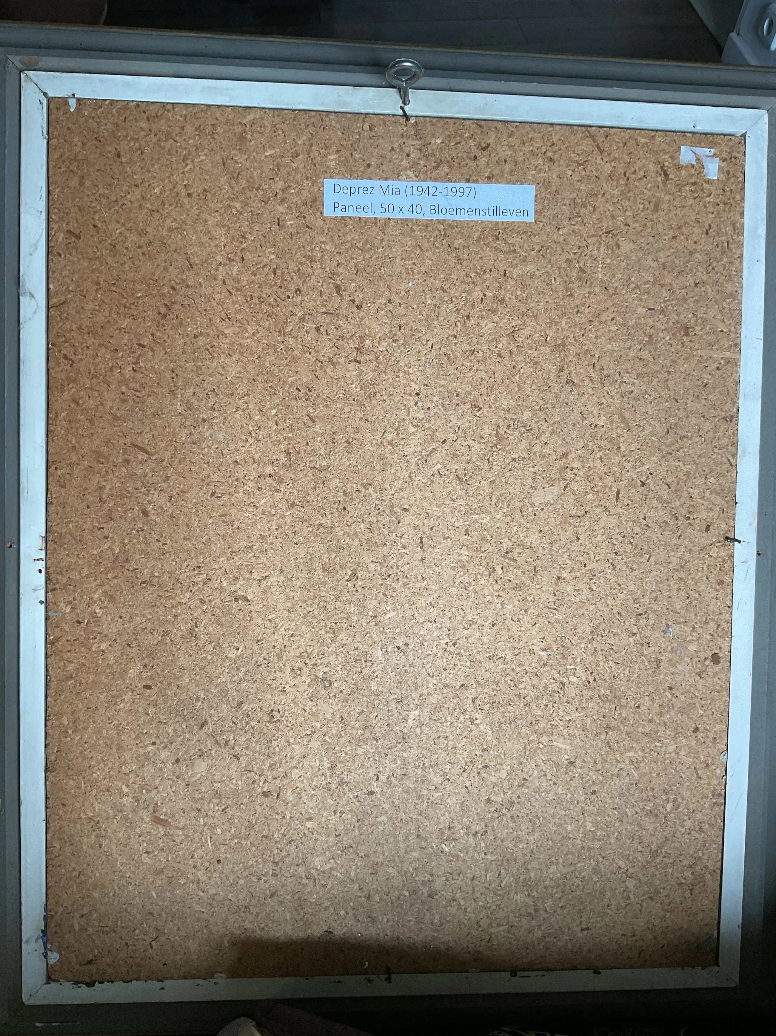 Prachtig Bloemenstilleven van Mia Deprez , kunstenares uit West Vlaanderen( Izegem) 1942-1997 Olieverf op paneel , handgesigneerd op het paneel door de kunstenares Het werk zit in een passend goudkleurig kader . Het werk is in een perfecte staat. Het kader heeft minimale gebruiksporen maar geen brokken af enkel een zeer minimale retouche verf goudkleurig nodig Afhalen mag , opsturen is mogelijk. Kan eventueel voor een kleine vergoeding aan huis worden afgeleverd 10 km rond Gavere of in de gemeenten op de as van de E17 Deinze Kortrijk Wevelgem